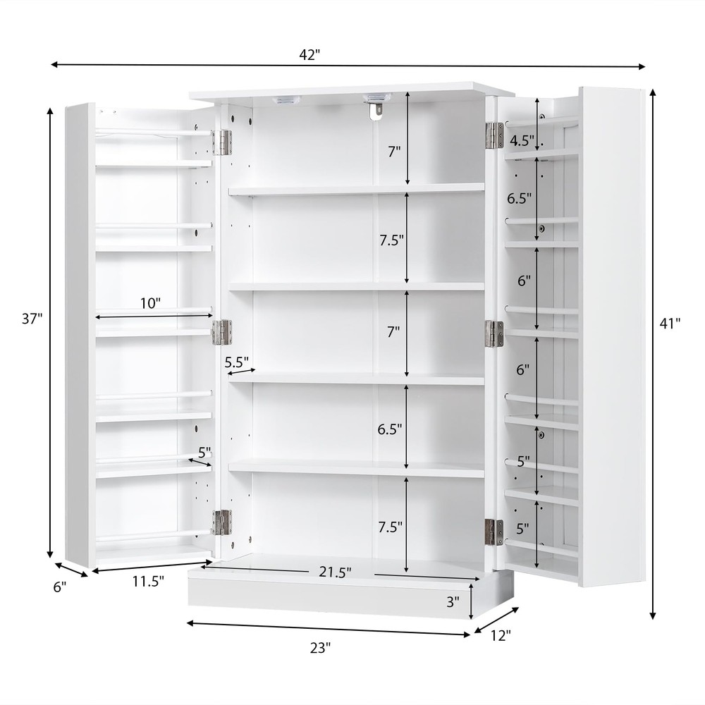 [Unlock Storage Potential]: Enjoy a well-organized culinary space with this kitchen pantry, featuring 5 roomy shelves and 12 spice racks on double doors, each safeguarded by a guardrail. This cabinet is your go-to for quick, clutter-free access to spices and more! [Your Space, Your Way]: Revel in the flexibility of 6 adjustable shelves, designed to accommodate a spectrum of sizes from tall bottles to bulk storage. Each shelf offers a choice of 3 distinct height settings, with two clearance options—1.2" or 2.5"—to suit your specific storage desires [Anti-tipping Kit]: Bolster your peace of mind with an anti-tipping kit that firmly grounds your cabinet. Coupled with a robust base, it’s designed for unwavering stability. This ensures safety for you and your home, giving you confidence in every use. [Contemporary & Stylish Design]: Featuring a sleek, modern design, this kitchen pantry will add a touch of elegance to your kitchen while seamlessly integrating with your existing furnishing style. It is supposed to be suitable for different home decoration. [Multi-Room Use]: Beyond the kitchen, this freestanding cabinet is a stylish storage superstar. It is ready to bring order and charm to living rooms, offices, or any space that craves a touch of class and utility.
