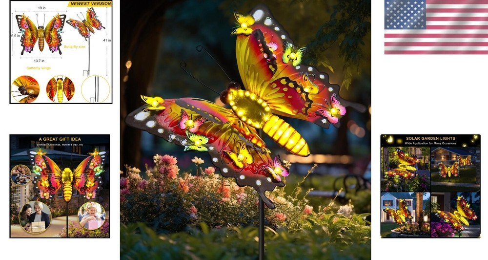 41" Solar Butterfly Garden Lights - Enchanting Outdoor Decor for All Seasons ‹ › ‹ › ‹ › ‹ › ‹ › ‹ › ‹ › ‹ › ‹ › 41" Solar Butterfly Garden Lights Enchanting Outdoor Decor for All Seasons Features: Crafted from durable iron material featuring a double butterfly wing three-dimensional design. Showcases 10 colorful small butterflies flanking a beautifully designed large butterfly. Body length of 20 inches, with a 41-inch ground insert for optimal placement. Colorful butterfly wings enhance realism during the day, while warm lights create a charming ambiance at night. Built-in high-efficiency solar panel ensures 6-8 hours of sunlight charging for 8-10 hours of automatic lighting at night. Waterproof and durable, designed with IP65 materials, resistant to rain, snow, frost, and high temperatures. Simple installation—just insert into the soil, no external power source necessary. Benefits: Brings a whimsical touch to your garden, patio, lawn, or backyard. Perfect for fairy gardens, pathways, and as unique decorative lights. Ideal as a thoughtful gift for birthdays, Mother's Day, or as horticultural art gives that brings joy and beauty. Provides 8-10 hours of magical illumination to enhance your outdoor space at night. Guaranteed satisfaction, with a promise of a free replacement if needed. Why choose our Solar Butterfly Garden Lights? Transform your outdoor space into a captivating landscape with our enchanting Solar Butterfly Garden Lights. Made from high-quality iron and designed to reflect nature's beauty, these lights not only add charm to your garden during the day but also illuminate your nights with a warm glow. Designed for simplicity and durability, these solar lights withstand the elements while offering you the convenience of easy installation. Don't miss the opportunity to brighten your garden and elevate the ambiance—bring home our Solar Butterfly Garden Lights and light up a happy life! Shipping Free & Fast Shipping - We offer free shipping to most of the USA with a normal delivery time of 3-7 days. However, due to the current situation, additional delivery time (up to 3 weeks) may be required for some items. Alternative Carriers - We may use alternative carriers (e.g. USPS, FedEx, UPS, etc.) to ensure your package arrives safely and on time. Due to the use of multiple carriers, we are unable to provide a tracking number automatically. Handling Time - Orders are processed and shipped within 1-2 business days of receiving cleared payment. Shipping Restrictions - Shipping to Alaska, Hawaii, Puerto Rico, Guam, and other US territories may incur shipping charges or delivery restrictions. Please contact us before ordering, or your order can be refunded/cancelled. State Restrictions - There may be restrictions based on your state of purchase. For example, certain items may not be shipped to California due to state regulations. Contact for Tracking Updates - If you require tracking updates or have any concerns about the delivery of your order, please feel free to contact us, and we will be happy to assist you. Return Please see our eBay Return Policy. Thank you. Payment We accept all major credit cards, PayPal, and Apple Pay for your convenience. Your payment information is secure and encrypted to ensure a safe and seamless transaction. Please complete your payment within 3 days of purchase to avoid any delays in shipping. Feedback Your feedback is extremely important to us. We strive to provide the best products and customer service possible. If you are satisfied with your purchase, please take a moment to leave us a positive review. If you have any concerns or issues with your order, please contact us before leaving negative feedback. We are committed to resolving any problems and ensuring your satisfaction. Contact Us If you have any questions or concerns, please feel free to reach out to our customer support team. You can contact us through the eBay messaging system. We are available Monday to Friday, 9:00 am to 5:00 pm EST, and we will do our best to respond to your inquiry within 24 hours. Thank you for supporting our small family business! UPC: Not Set Unit Quantity: 3 lb Features: Waterproof,Solar,Colorful,Durable,Easy Installation Theme: Butterflies Light Color: Warm White Mounting: Stake Control Style: Switch Material: Metal,Iron Smart Home Compatibility: Not Set Labels & Certifications: Not Set Type: Garden Decor Brand: Unbranded Power Source: Solar Installation Area: Outdoor Sensor Type: Light Lighting Technology: Not Set Number of Lights: 5 Color: Solar Butterfly Lights Number of Settings: Not Set Style: Not Set Energy Star: Not Set MPN: Not Set EC Range: Not Set Finish: Not Set Size: Large Power Consumption: Not Set Bulb Shape Code: Not Set Voltage: Not Set IP Rating: IP65 Item Diameter: Not Set Country/Region of Manufacture: Not Set Color Temperature: Not Set Lumens: Not Set Bulb Life Hours: Not Set Model: Not Set Item Height: 41 in Item Length: Not Set Item Weight: 3 lb Item Width: Not Set Unit Type: lb
