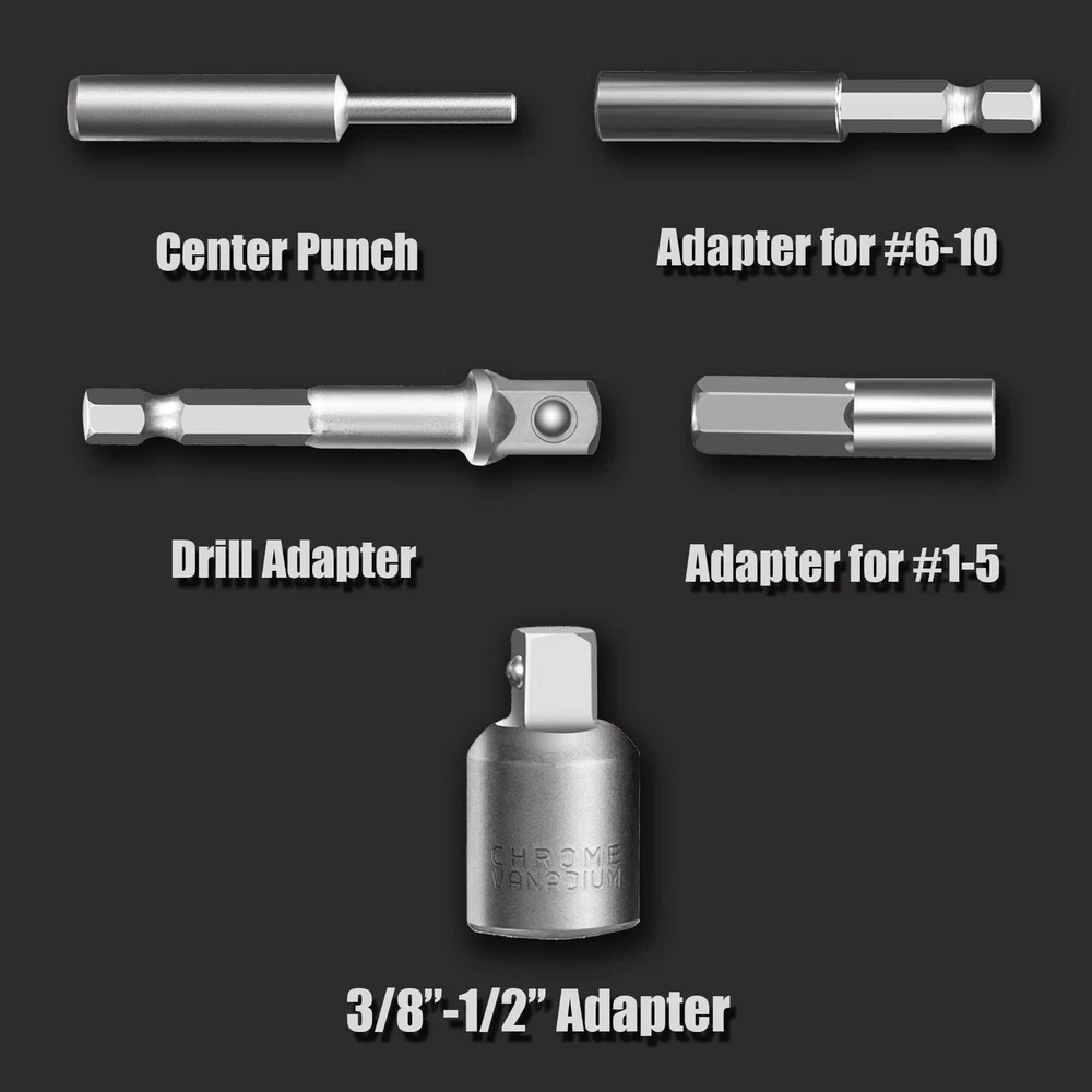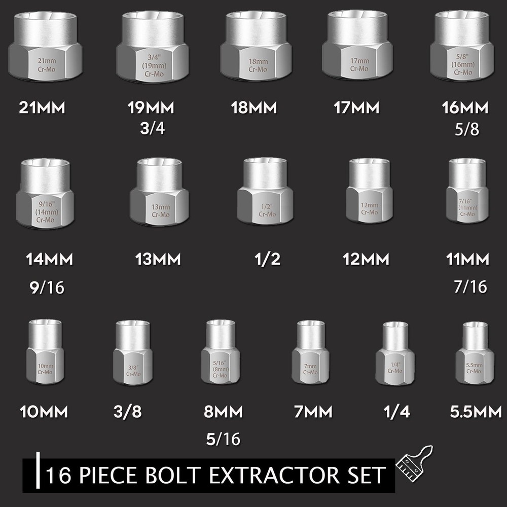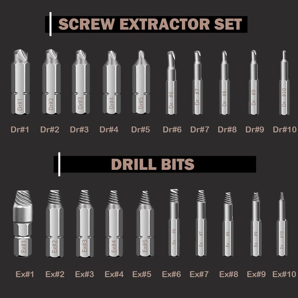 41-Piece Bolt Extractor Screw Extractor Set and Stripped Screw Remover 41 Piece Screw & Nut Remover Kit- Including 10-piece spiral screw extractors: 1#, 2#, 3#, 4#, 5#, 6#, 7#, 8#, 9#, 10#, 10-pieces HSS drill bits:Ex#1, Ex#2, Ex#3, Ex#4, Ex#5, Ex#6, Ex#7, Ex#8,Ex#9, Ex#10 and 13-piece bolt nut remover set: 21mm, 19mm(3/4") , 18mm, 17mm, 5/8" ( 16 mm ), 9/16" ( 14mm ), 13mm, 1/2", 12mm, 7/16" ( 11mm ), 10mm, 3/8", 5/16" ( 8mm), 7mm, 1/4" and 4-piece adapter. Solid Carrying Case for Storage - 41 pieces tools are all packed in a rugged, compact carry case for storage and portability. Each tool fits snugly into its respective place to prevent moving around and scraping. Easy to use:Suitable for both power tools and hand tools,high density spiral design helps faster removing broken screws, bolts, nuts, studs, fittings, threaded pipes and pins. Clear lettering-the size is engraved on the socket for easy identification,chamfered bit ensures a smooth fit onto fasteners. Whether it's for car maintenance or daily use, it can provide you with great convenience.