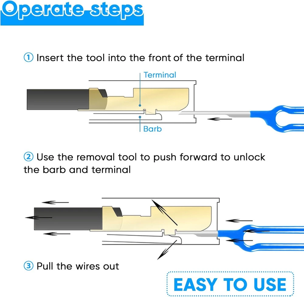 product Store Home Shipping Payment Warranty and Guarantee Other Policies Item Description Product Feature * Upgrade Terminal Removal Tool: With a robust 1mm thickness, our upgraded tool surpasses standard 0.6mm options, ensuring durability and eliminating concerns about bending or breaking. The improved long-handle design ensures a comfortable grip for effortless usage. *Comprehensive 41PCS Set: Receive a 41-piece electrical pin removal toolkit, featuring 14 single-pin pullers, 20 double-pin pullers, 1 triple-pin puller, 6 sleeve tools, and a protective bag for convenient storage and portability. * Easy and Damage-Free: No need to pry open the terminals, just push and pull the terminal pins. Our wire terminal release tool allows you to remove terminals from wire harness connectors and add new wires without compromising the original harness, maintaining factory integrity seamlessly. * Waterproof Protective Case: The depinning tool kit is sharp, so we carefully equip you with a safety case. It prevents children from playing with it and ensures that the tool is stored safely when not in use. At the same time, it is small and light, easy to carry. * Wide Application: Compatible with most connector terminals, our kit suits various applications—cars, home appliances, motorcycles, and more. Package Included * 41 x Terminal Removal Tools * 1 x Protective Bag Item Pictures More Shipping 1.We ship to worldwide,except Hong Kong,Taiwan,Macao,China,Guemsey,Puerto Rico and we do not ship to APO/FPO, etc. 2.Item will be shipped within 3 business day on payment received. 3.Items are shipped from China using Airmail,reach most of countries within 10-20 business days. 4.sDelivery time depends on destination and other factors,it may takes up to 20 business days. Payment 1.We accept Paypal only. 2.All major credit cards are accepted through secure payment processor PayPal. 3.Payment must be received with 7 days of auction closing 4.If you have bought multiple items from us,you can send us one payment for all the items instead of paying for them individually. When you click the Pay Now button,eBay will automatically determine if there are other items you have won of purchased from us and will combine them for your review. Warranty and Guarantee 1.One year warranty!30 days money back!Buy with confidence! 2.If you are not satisfied when you receive your item,please return it within 30 days for a replacement or money back.Please contact us before you return the item. 3.If item is defective in 3 months,we will send you a replacement without extra charger,or offer refund after we receive the defective item. 4.If item is defective after 3 months,you can still send it back to us.We will send you a new one after after receiving the defective item,but you have to pay the extra shipping fee. Other Policies 1.We are not responsible for any custom duty or import tax. 2.We will leave Positive Feedback after receiving the payment.Please contact us if you are not satisfied with the item after receiving it. 3.All emails will be answered within 1 business day.If you do not receive our reply,please kindly re-sent your email and we will reply you as soon as possible. 4.Serious Buyer Only!Please place bid only if you agree with all the terms.