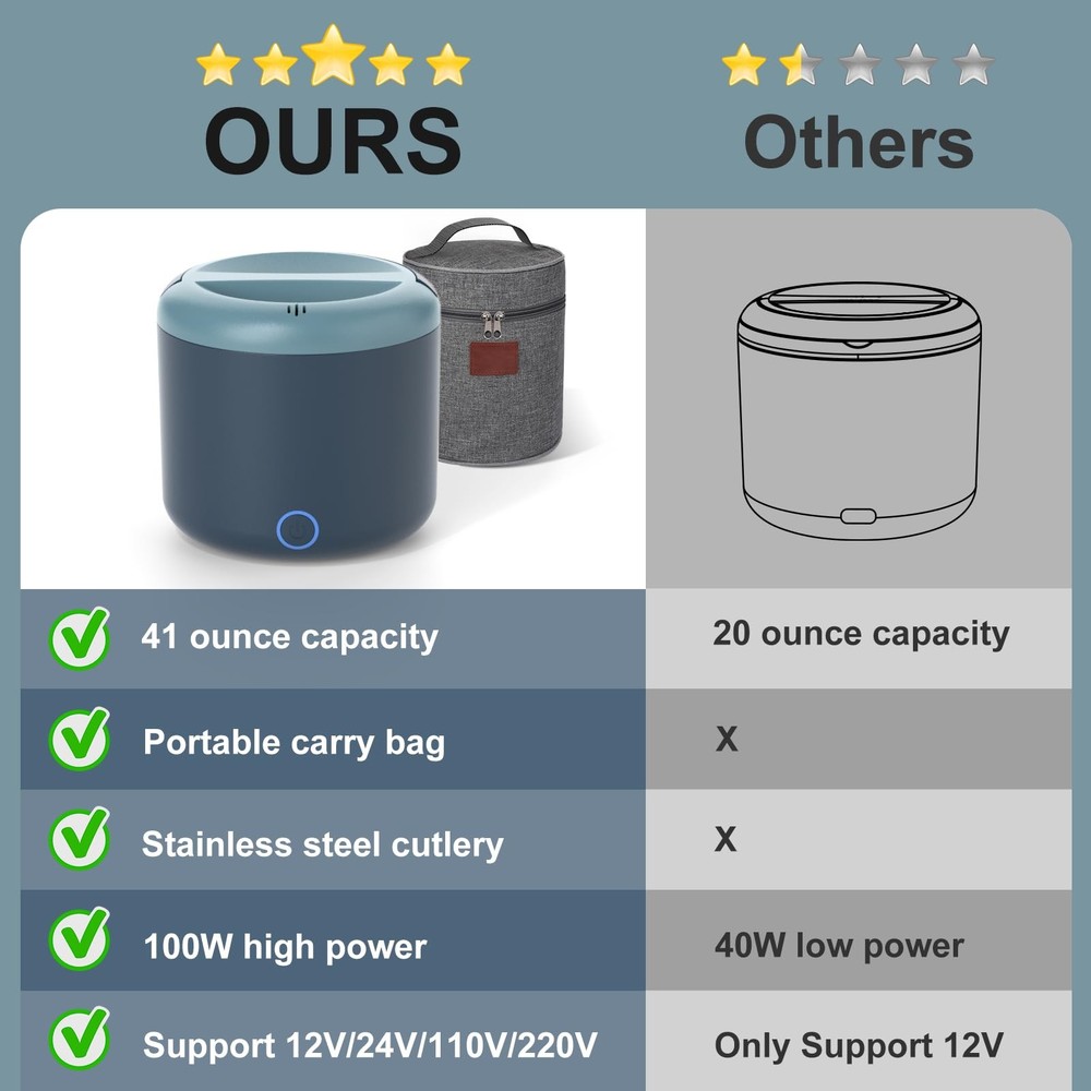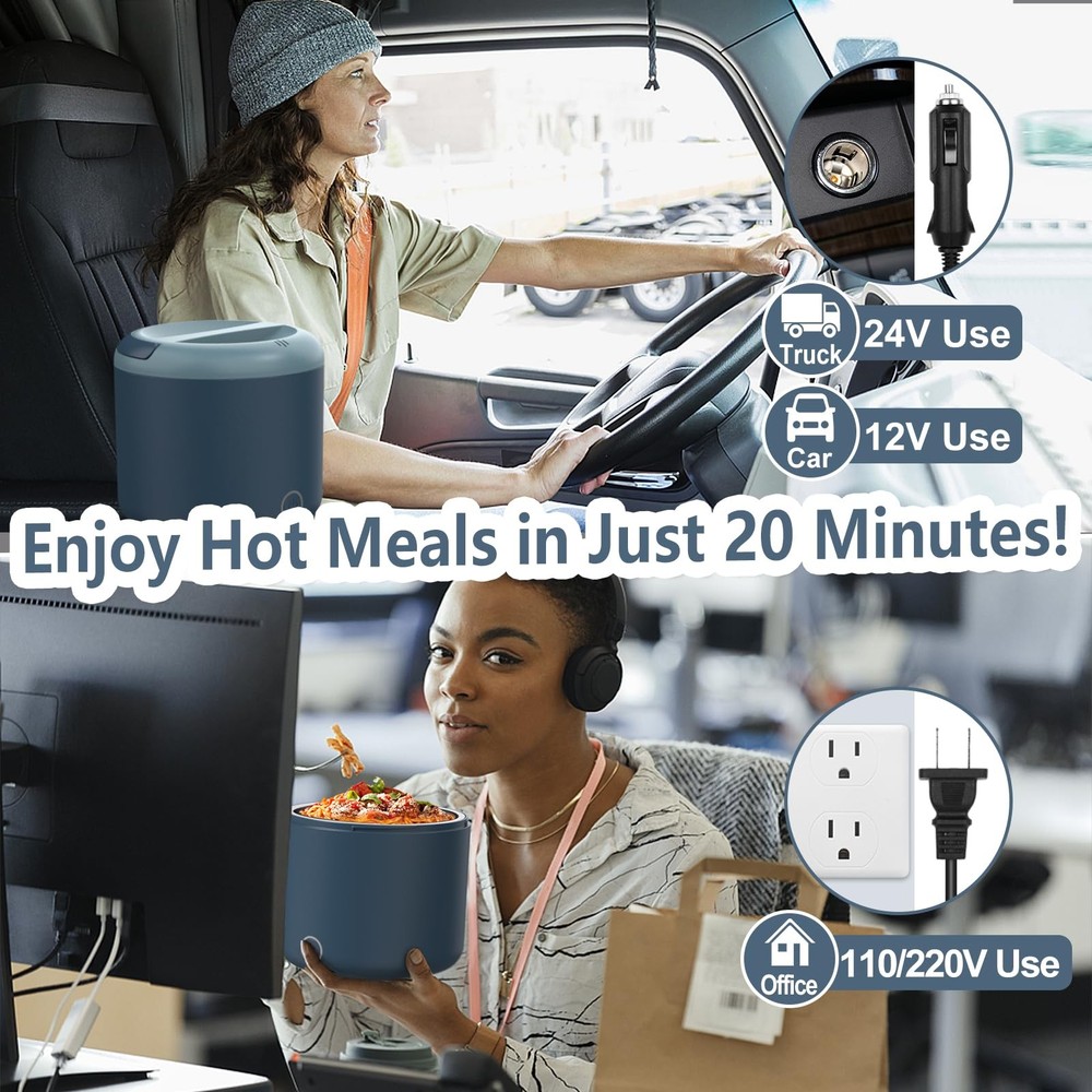 41-oz Electric Lunch Box Food Heater, 100W Heated Lunch Box for Adults, 12V 24V 110V Portable Food Warmer LunchBox for Car Truck Work with 304 SS Container, Driver Trucker White Elephant Gift Backed by a 5-Year – Worry-Free Use. Built with a durable shell and dishwasher-safe insert for daily use. We stand behind our product with a 5-year —your reliable office lunch heater or car lunch box heater for years of hot, healthy meals. Universal Voltage & Vehicle‑Ready. 12V/24V DC & 110V/220V AC inputs transform this into the ultimate car lunch box, truck driver food heater, RV electric lunch container, or vanlife meal warmer. Plug into cigarette lighter or wall socket for on‑the‑go hot meals. Generous 1.2L Capacity & Leak‑Proof Seal. Roomy 1.2L (41oz) inner pot holds rice, soup, pasta, veggies and meat in one portable food heater. Silicone gasket + stainless‑steel pot + twist-lock lid combine for a leak‑proof lunch box—perfect for camping, hiking, picnic, or commuting. Fast, Even Heating & Energy‑Efficient. 100W power element heats in just 20–35 minutes, with automatic temperature control for bento warmers, meal prep containers, or office food warmer. No more soggy or cold spots—just consistent, piping‑hot meals. Durable, Food‑Safe Materials. Removable 304 stainless‑steel inner pot is dishwasher‑safe and rust‑resistant. BPA‑free housing ensures healthy eating. Ideal for self‑heating lunch boxes, electric rice cooker lunch box, or heated soup container.