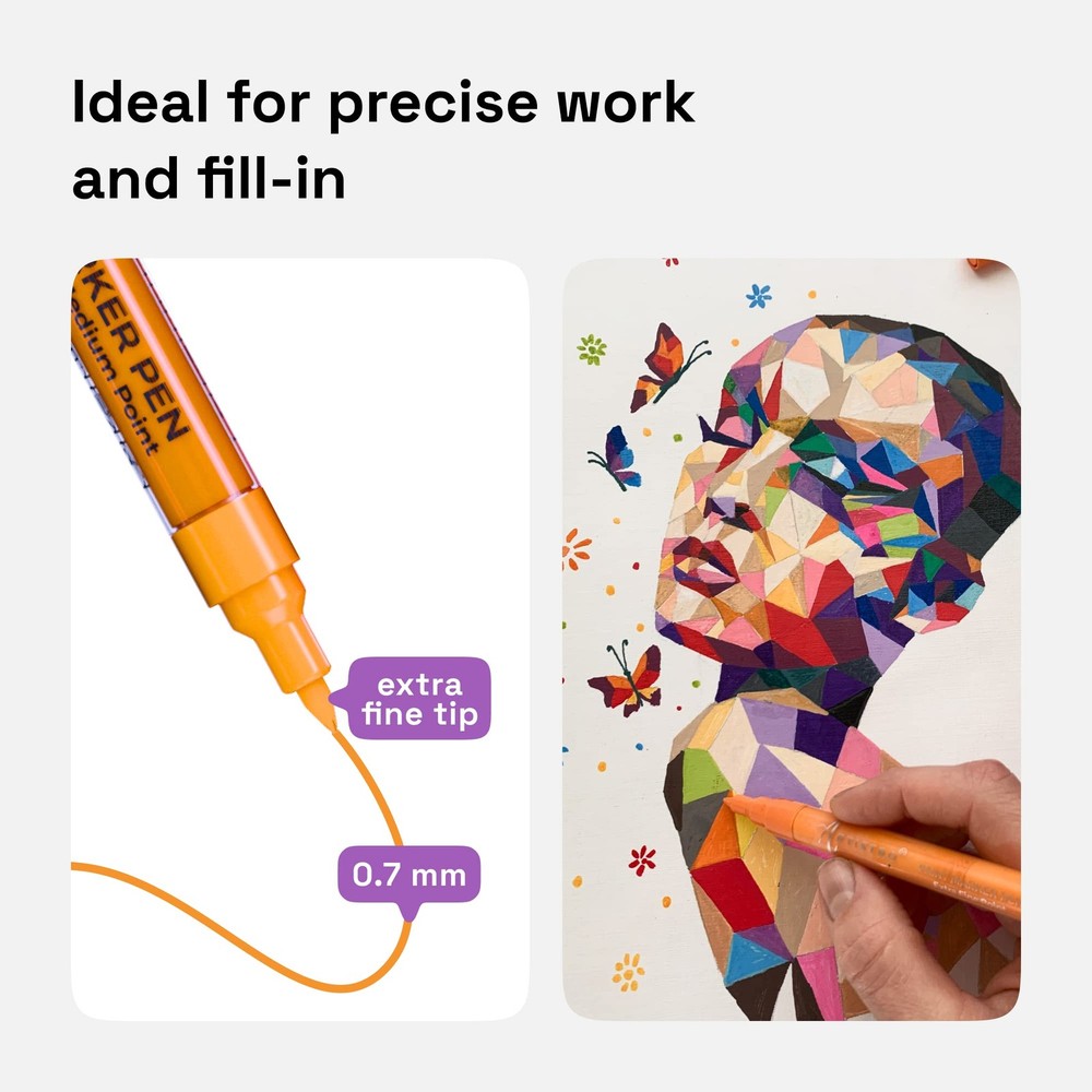 w The Paint Pens for acrylic painting are made with the highest quality water-based Italian imported inks for a smooth, consistent flow and glossy, opaque finish. Our 0.7mm extra fine tipped nibs are made in Japan with love. High quality ink means bright colors and perfect artwork on nearly any surface. This acrylic markers set includes an amazing range of 40 assorted colors + extra black & white acrylic pens for painting. Safe, Non-Toxic & Odor-Free, Acrylic markers paint pens pass all USA and EU safety requirements. Create art projects on almost any surface with acrylic paint pens for rock painting, stone, ceramic, glass, wood, fabric, canvas, mug, plastic, textiles, metal and more. You will get a step-by-step tutorial e-book with crafts rock designs you & your kids will love. acrylic paint pens for canvas & Paint markers for rocks are a unique gift for your creativity inspiration. The Perfect Gift: Create stunning custom with ceramic markers for mugs and other personalized gifts for your loved ones. Paint pens for acrylic painting are an ideal gift for crafters and artists.
