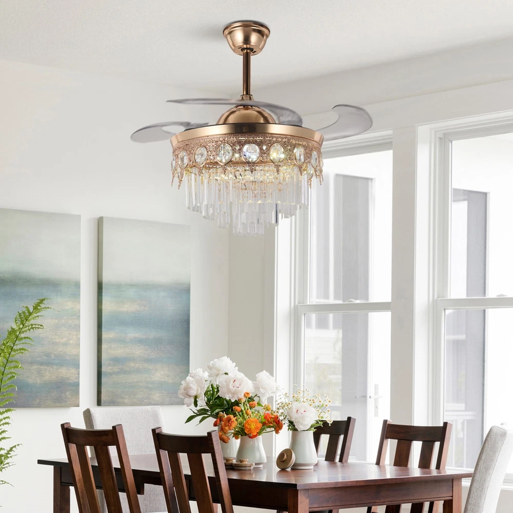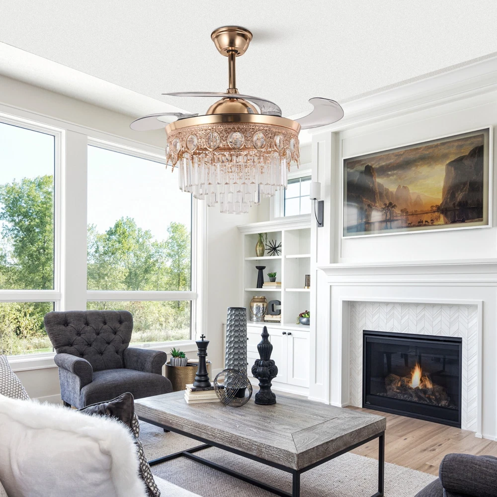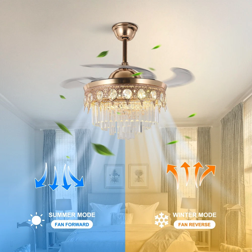 42" Gold LED Crystal Chandelier Remote 3-Colors 6-Speeds Ceiling Fan Reversible 42 Inches Crystal Ceiling Fan Chandelier This chandelier ceiling fan is definitely become a practical decoration in your house. It’s perfect for decorating in dinning room, living room, bedroom. Giving you a sweet lighting and natural atmosphere Specifications: Style: Modern Color: Gold Material: Metal + ABS retractable blade + K9 crystal lampshade The main material of the lampshade: crystal lampshade Control type: remote control Lighting: 3 lights (yellow/warm white/white) Wind speed: 6 wind speed (high/medium/low) Timing setting: 1h, 2h, 4h, 8h Light source: LED (included) Wattage: 36W-40W Reverse:Reversible Size: Blades open diameter 42inch Lower pole: 4 inches and 7.8 inches downrod for your choice. Applicable area: 10-25 square meter Tips: ●This chandelier ceiling fan needs to be assembled. Please follow the user manual and we recommend to have it professionally to install. ●Floor to ceiling height needs more than 2.5 meters, ceiling can hold greater than 65lb. ●We recommend to wear the hand gloves when you install the crystal prevent to Leave fingerprints. ●If you receive a damaged or defective package, please contact us and we would process it immediately. Payment Delivery details Terms of sales About us Contact us Payment You could make payment via: Delivery details Packages will ship via by UPS or USPS within our handling time,once the package is shipped out ,normally shipping takes about 3-10 working days,but due to different cities and states,shipping time will be different. Terms of sales If you any problem about shipping information, or the item you got : Arrived damaged; Wrong item sent; Missing parts or pieces; Doesn't work or defective; Doesn't match description or photos. Pls click "Contact Seller" and send us message firstly. Then we could have a check and will take responsibility to resolve the problem with you in good communication. About us Our company specializing in selling all kinds of light fixtures,such as ceiling fans,chandeliers,crystal lights,retro lamps,pendant light,etc. If there's any light fixture you are interested,pls feel free to contact us for more details. Contact us Normally your message will be replied in 1 business day,If after 24 hours you do not receive our reply,please kindly re-send us the message,because sometimes ebay message system will have technical problem,so your message can't send to us successfully.