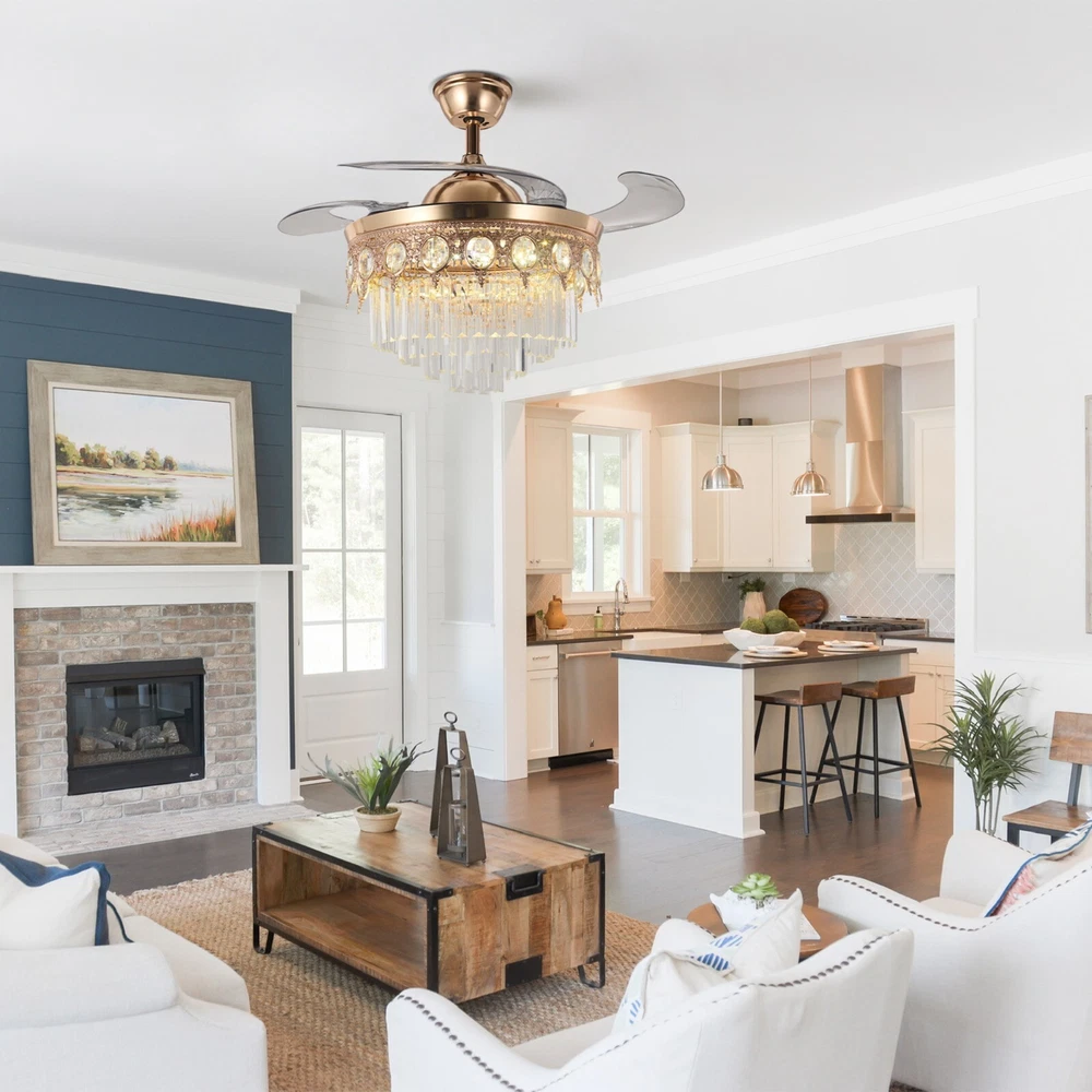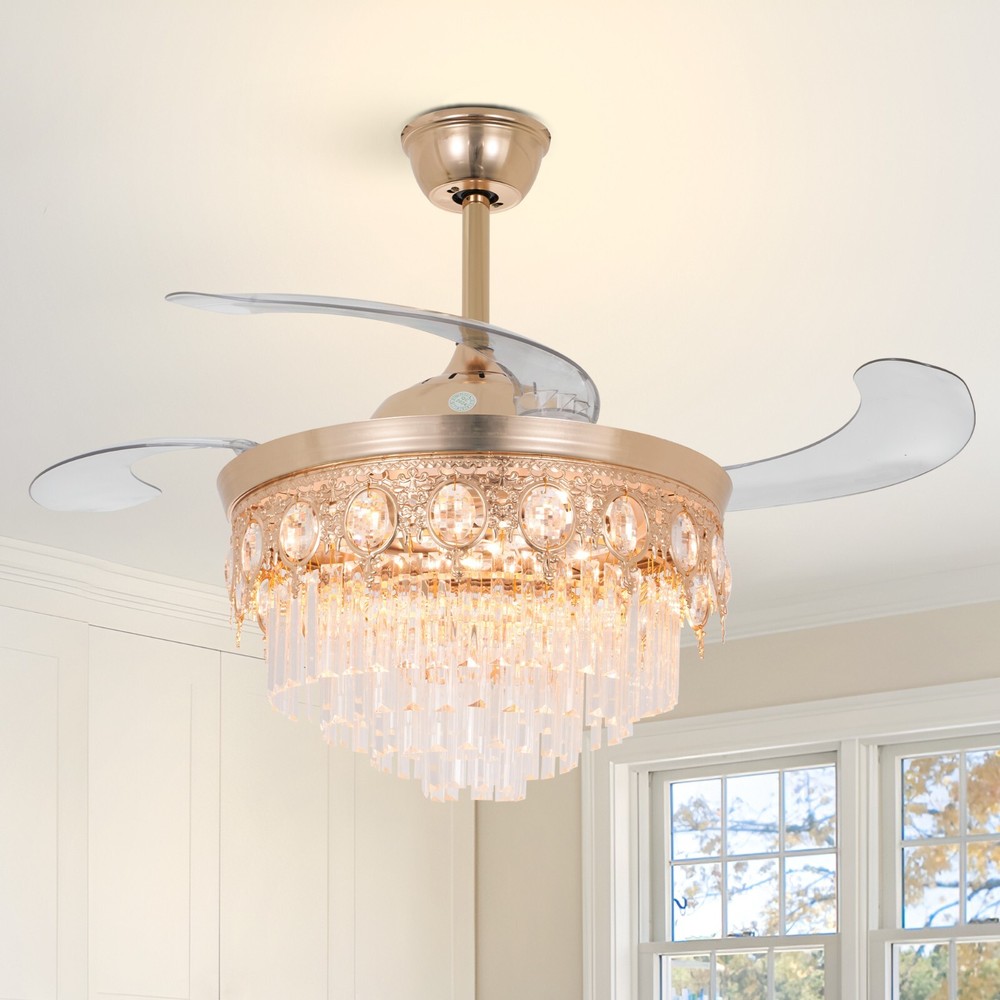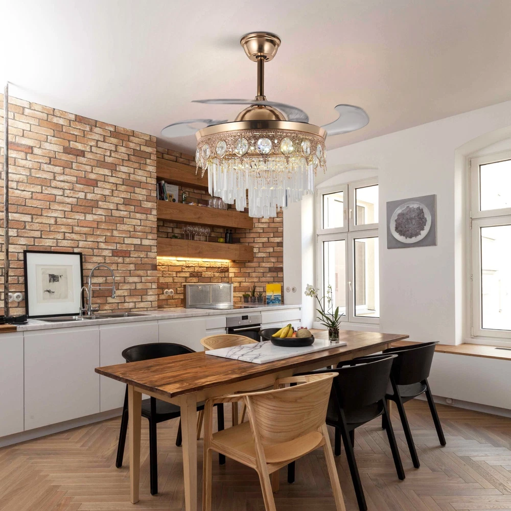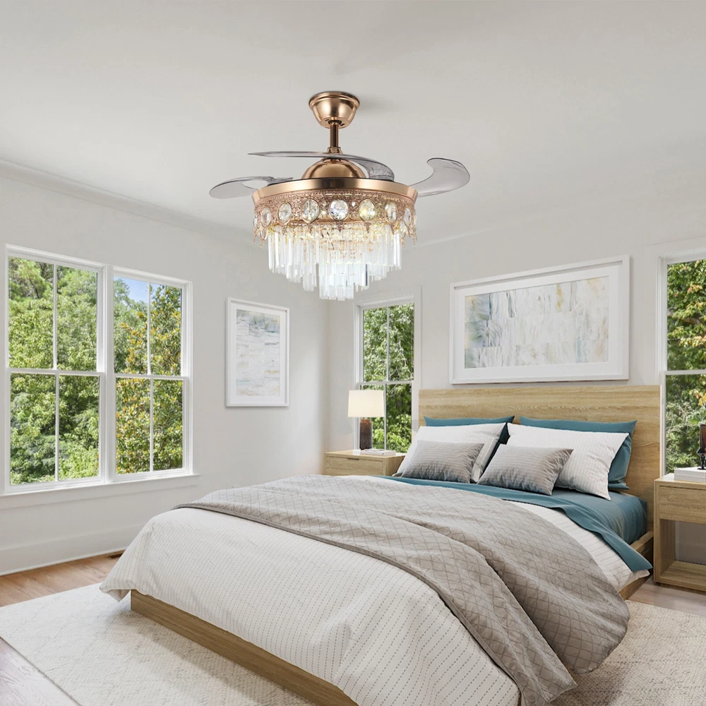 42" Gold LED Crystal Chandelier Remote 3-Colors 6-Speeds Ceiling Fan Reversible 42 Inches Crystal Ceiling Fan Chandelier This chandelier ceiling fan is definitely become a practical decoration in your house. It’s perfect for decorating in dinning room, living room, bedroom. Giving you a sweet lighting and natural atmosphere Specifications: Style: Modern Color: Gold Material: Metal + ABS retractable blade + K9 crystal lampshade The main material of the lampshade: crystal lampshade Control type: remote control Lighting: 3 lights (yellow/warm white/white) Wind speed: 6 wind speed (high/medium/low) Timing setting: 1h, 2h, 4h, 8h Light source: LED (included) Wattage: 36W-40W Reverse:Reversible Size: Blades open diameter 42inch Lower pole: 4 inches and 7.8 inches downrod for your choice. Applicable area: 10-25 square meter Tips: ●This chandelier ceiling fan needs to be assembled. Please follow the user manual and we recommend to have it professionally to install. ●Floor to ceiling height needs more than 2.5 meters, ceiling can hold greater than 65lb. ●We recommend to wear the hand gloves when you install the crystal prevent to Leave fingerprints. ●If you receive a damaged or defective package, please contact us and we would process it immediately. Payment Delivery details Terms of sales About us Contact us Payment You could make payment via: Delivery details Packages will ship via by UPS or USPS within our handling time,once the package is shipped out ,normally shipping takes about 3-10 working days,but due to different cities and states,shipping time will be different. Terms of sales If you any problem about shipping information, or the item you got : Arrived damaged; Wrong item sent; Missing parts or pieces; Doesn't work or defective; Doesn't match description or photos. Pls click "Contact Seller" and send us message firstly. Then we could have a check and will take responsibility to resolve the problem with you in good communication. About us Our company specializing in selling all kinds of light fixtures,such as ceiling fans,chandeliers,crystal lights,retro lamps,pendant light,etc. If there's any light fixture you are interested,pls feel free to contact us for more details. Contact us Normally your message will be replied in 1 business day,If after 24 hours you do not receive our reply,please kindly re-send us the message,because sometimes ebay message system will have technical problem,so your message can't send to us successfully.
