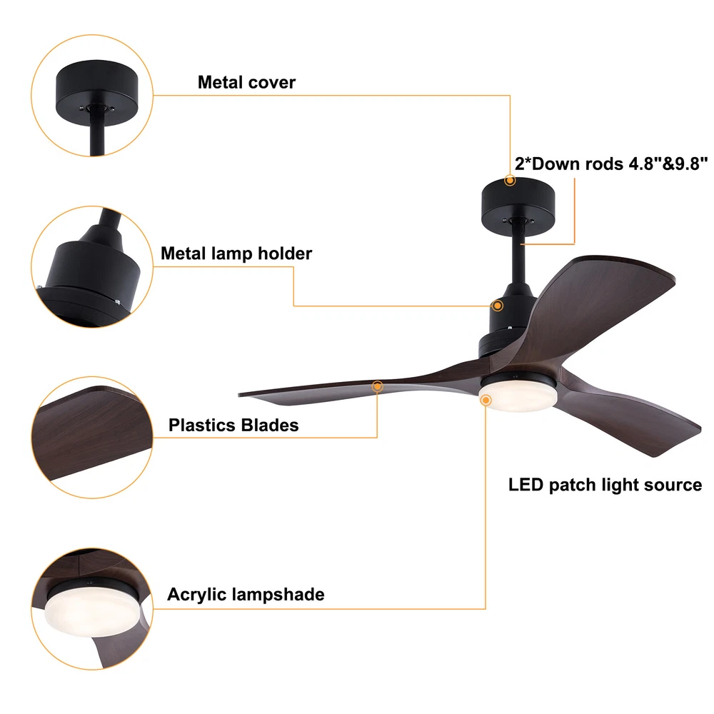 💡 Package Included 1* Ceiling Fan Light 1* Remote Control 2* AAA Batteries 1* English Manual All Accessories for Assembly 42'' Ceiling Fan Light W Remote Control&Timer Function3 Blade Fan Ceiling Mount 💡Description This ceiling fan light is an innovative home decoration that integrates the functions of lighting fixtures and fans. Six gears of wind speeds with a timing function can meet your daily usage needs, and y ou can also reverse the direction of fan rotation in winter. It can be integrated with different decoration styles and is a piece of ideal furniture that can accompany you in all seasons while creating a quality life and sleep environment. 💡 Key Features Build to Last: Made of hardware iron and solid wood with a painting process, this product is corrosion-resistant , ensuring durability and longevity. Embrace Smart Life: With the intelligent remote control, you can freely adjust the wind speed (6 gears), light colors , and timing(1/2/4 hour) while lying in bed within 9.84-16.4ft , avoiding getting up and walking to the switch every time you want to change its settings, reducing catching a cold, and saving electricity bills. Carefully Designed: The LED light source with 3000K-6000K color temperature, and warm white, yellow , and white light colors fully meet your lighting needs in different scenarios, making it more versatile. Reverse Function: You can also reverse the direction of the fan rotation in winter, blowing hot air from the top into the room and increasing the indoor temperature. Healthy and Energy-saving: This product provides more comprehensive air circulation and cooling, thereby reducing the frequency and time of air conditioning use, saving energy, and reducing expenses. It can avoid direct blowing and reduce the risk of air conditioning diseases. High Safety: The heat dissipation holes and wide voltage (85-265V) design can effectively ensure safety and extend product life, so you can use it with confidence. Classic Appearance: The brown and black tones, fan blade design, and solid wood texture give this product a classic appearance, making it eye-catching and being a good decoration to blend in with different decor styles and add color to your room. Easy to Clean : The smooth surface and simple structure allow you to clean it with a dry cloth, saving you lots of time and effort. Excellent Gift: The beautiful appearance and good practicality make it a great gift for parents, friends, and lovers on birthdays, holidays, and housewarming. 💡 Details Plastics Blades: They are less prone to warping or bending, have a more natural and elegant appearance, help to reduce vibrations and noise during running, and boast better air circulation capabilities, making them a preferred choice for those seeking both functional and decorative ceiling fans. Round Base: The large round base with a diameter of 5.9 inches increases stress area, making this product fixed firm without falling easily. Pure Copper Motor: It has stable performance, a good heat dissipation effect, and 30db low noise(equivalent to a person's quiet conversation), ensuring efficient running in a quiet environment. Selectable Suspension Rods: The 4.8" and 9.8" suspension rods provide you with the flexibility to install this ceiling fan according to your needs. 💡 Application Its applicable area is 107.64-161.46ft² and its applicable height is 8.9ft. It is ideal for spaces with small to medium-sized ceilings, such as farmhouses, kitchens, hallways, living rooms, bedrooms, offices, kids' rooms, balconies, lofts, aisles, foyers, corridors, cafes, dining rooms, restaurants, bars, and patios. 💡 Specifications Color: Black+Brown Style: Classic Material: Hardware Iron, Plastics Surface Treatment: Painting Assembly Required: Yes Mounting Type: Ceiling Mount Number of Fan Blades: 3 Reversal Function: Yes Indoor/Outdoor Usage: Indoor Light Source: LED Light (Included) Light Color: White Light, Warm White Light, Yellow Light Color Temperature: 3000-4500-6000K Recommended Uses for Product: Air Circulation, Lighting Control Method: Remote Control Batteries Type: 2*AAA(Included) Motor Type: Pure Copper Noise: 30dB Voltage: 85-265V Power: 40W Wind Speed: 6 Gears Timing Range: 1, 2, 4H Applicable Height: 2.7m/8.9ft Applicable Area: 10-15㎡/ 107.64-161.46ft² Remote Control Distance: 3-5m/ 9.84-16.4ft Suspension Rod Length: 12cm/4.8inch or 25cm/9.8inch Overall Height: 38cm/14.96inch or 50cm/19.68inch Chassis Diameter: 15cm/5.9inch Overall Length: 107cm/42inch Single Fan Blade Length: 48cm/18.89inch 💡 Package Included 1* Ceiling Fan Light 1* Remote Control 2* AAA Batteries 1* English Manual All Accessories for Assembly Notes Normally, the expansion screw will blow up after the force is applied. For a safe and secure installation, please ensure that the electrical box is firmly mounted and properly attached to a structural part of the building. Please make sure that all wires are connected. When unpacking, be careful not to pull with the wires as a bad connection may result. Please do not turn on the power until fully assembled. We recommend installation by professionals. Please read the manual completely before installation and use, and pay particular attention to the safety instructions included. Please allow the slight color difference caused by the shooting light and 1-3cm error due to manual measurement, and make sure you do not mind before you order. Payment Delivery details Terms of sales About us Contact us Payment We accept ebay payment 。 Fees such as import duties, taxes are not included in the item price or shipping costs. These charges are the buyer's responsibility. Delivery details Shipping: 2-9 working days to: USA Terms of sales We maintain high standards of excellence and strive for hundred percent customer satisfaction. Feedback is very important to us. We hope that you contact us immediately before you give neutral or negative feedback, so that we can address your concerns. It is impossibl