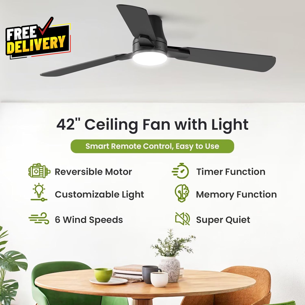 ultimatesavvyshop New Arrivals Add to Favorite View Feedback Contact 42 Inch Ceiling Fan with Light and Remote Low Profile Black Quiet Reversible ? PLEASE CONTACT US FIRST BEFORE TAKING ANY ACTION ? If you face any kind of issue , please reach out to us directly . Especially before leaving Negative Feedback, opening an “Item Not Received” case, or starting a Return . ? We are always happy to assist and resolve any problem quickly and professionally! If you have any questions or require assistance, please don’t hesitate to reach out. Description Item model number FL42302 Style Modern Material Plastic Number of Speeds 6 Control Method Remote Motor Type Brushless DC Room Type Bedroom, Kitchen, Living Room, Porch, Study Room Number of Power Levels 6 Power Source Electric Efficiency A Product Dimensions 42"D x 42"W x 8.74"H Installation Type Flush Mount Model Name FL42302 Finish Type Powder Coated Mounting Type Ceiling Mount Controller Type Remote Control Item Package Quantity 1 Batteries Required? No Item Weight 7.09 pounds Color Black Is Cordless? No Shape Round Recommended Uses For Product Air Circulation Finish types Powder Coated Electric fan design Ceiling Fan Speed 6 RPM Size 42 inch Fast & Easy Installation: Tired of complicated setups? Our ceiling fan with light comes with a pre-installed light fixture, reducing assembly time by 90%. The snap-in blades install easily and are secured with locking clips for stability. Plus, our detailed manual ensures a smooth, hassle-free installation experience. To make installation even easier, we also provide a clear instructional video available directly on the product page, guiding you step-by-step. Perfect Size for Optimal Comfort: With dimensions of 42 x 42 x 8.7 inches, this ceiling fan is ideal for medium-sized rooms ranging from 10ft x 10ft to 15ft x 15ft. Weighing just 7.2 lbs, it’s easy to handle and install, providing excellent airflow and comfort without being too bulky for your space. Low Profile Flush Mount: Designed for low ceilings, this ceiling fan with lights is ideal for bedrooms, living rooms, kitchens, offices, and covered outdoor spaces like patios, porches, and pergolas. Its elegant, modern design complements various décor styles. Additionally, the fan blades are reversible with black on one side and walnut wood on the other, allowing you to customize the look to match your home' s aesthetic. Ultra-Quiet Reversible DC Motor: Stay comfortable all year with a reversible DC motor that cools in summer and circulates warm air in winter. Choose from 6 adjustable speeds – including gentle breeze, natural wind, and strong cooling – for personalized comfort. Operating under 30dB, it’ s perfect for bedrooms and quiet spaces. A-rated efficiency saves 80% energy, making it both powerful and eco-friendly. Multi-functional Smart Remote Control: Equipped with a smart remote, all functions are at your fingertips – 6 fan speeds, 3 color temperatures (3000K warm, 4500K natural, 6500K white), stepless dimming (10% - 100%, up to 2000 lumens), and 1/2/4-hour timers. Memory function brings you back to your favorite fan and light settings when powered off via remote. When turned off using the main wall switch, only the light setting is preserved. ABOUT US Prior to making any purchase from our store, we’d like to introduce ourselves. My name is Shahzad Yaqub , and I am the proud owner of Epic Emporium Deals , located in the great state of Illinois, USA. I have been an active and trusted eBay seller since Jan 14, 2025 . At Epic Emporium Deals , we are committed to offering competitive prices and top-quality products . Our extensive collection features a wide variety of items, including media such as books, movies, music, and games , as well as electronics, toys, sporting apparel, clothing, tools , and general home and garden essentials —and much more! Your satisfaction is our priority, and we look forward to providing you with an exceptional shopping experience. SHIPPING We are always working hard to ensure your package arrives as soon as possible. Please understand that some factors like weather, high postal traffic, and the performance of shipping companies are outside of our control. We offer free shipping to the lower 48 states and ship within 2 business days of payment, usually sooner. We do not accept P.O. Boxes. Please provide a physical address. For shipping outside of the continental USA, we only use eBay's Global Shipping Program. The item is shipped to IL and then sent to the rest of the world. International customers are responsible for all duties and taxes. Continue to 'check out' to calculate costs for shipping the item to your country. Messages regarding eBay's Global Shipping Program MUST be directed at eBay EXCLUSIVELY. RETURNS We do not accept returns under normal circumstances. However, we will gladly consider a return if the item is received broken or if the wrong size is sent to you. In all other cases, returns will not be accepted. CUSTOMER SATISFACTION We try our very best to make sure every customer is completely satisfied. If there's a problem, message us! We're happy to help.
