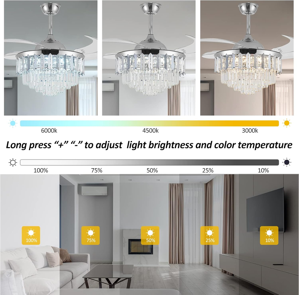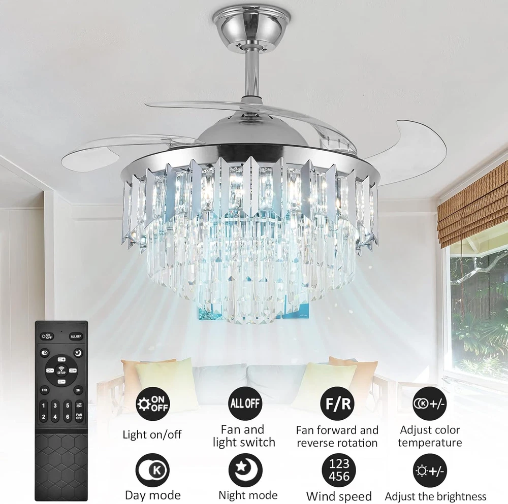 This ceiling fan is a game-changer! The modern design with crystal accents adds elegance to any room, and the dimmable LED lights create the perfect ambiance. The remote control makes it super convenient to adjust speed and brightness, while the retractable blades are a genius space-saving feature. It's both stylish and functional—definitely worth the investment!
