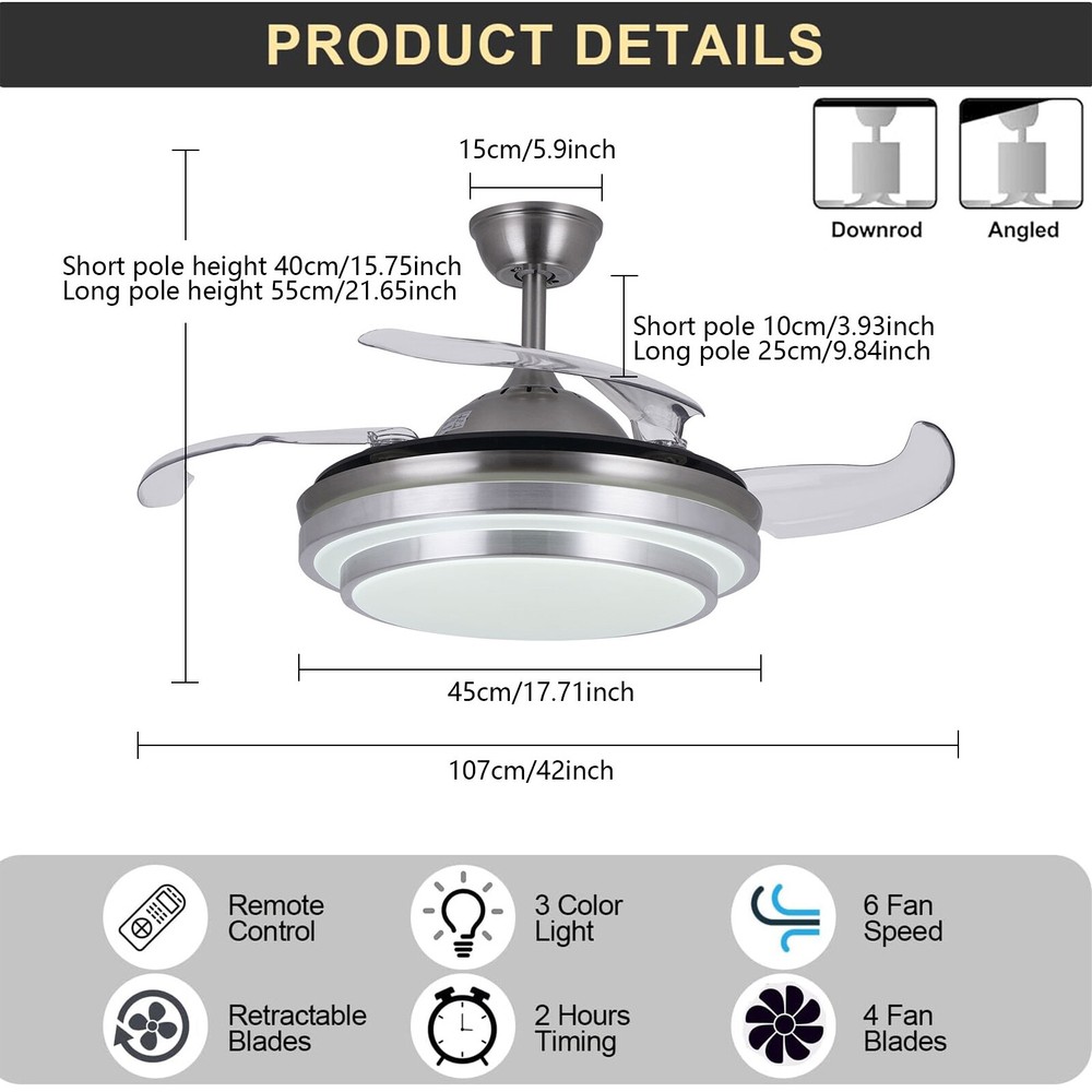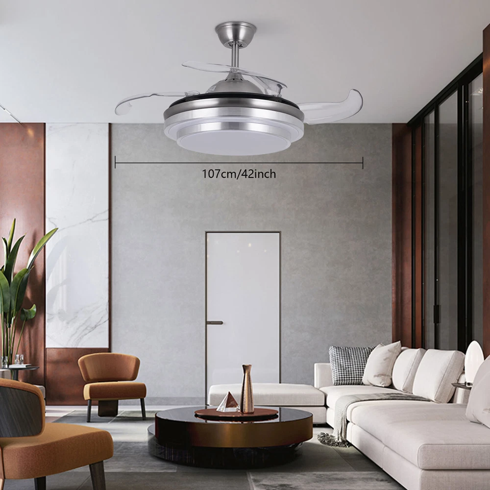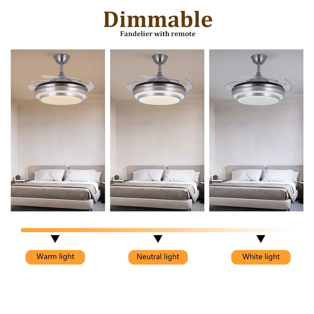 This ceiling fan lamp is a game-changer! The retractable blades are sleek when not in use, and the dimmable LED lighting creates the perfect ambiance. The remote makes it super convenient to adjust both fan speed and light brightness. It's quiet, stylish, and works beautifully in any room—highly recommend!