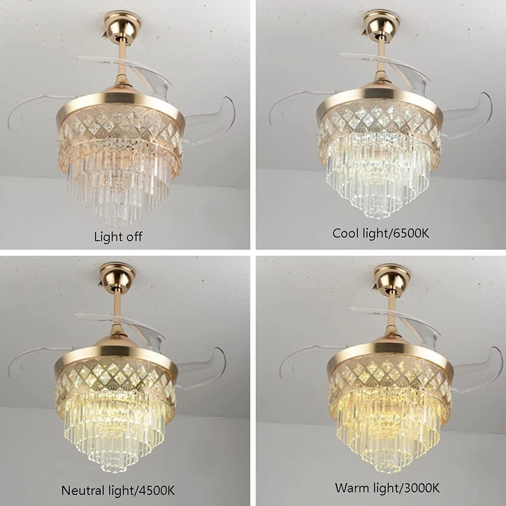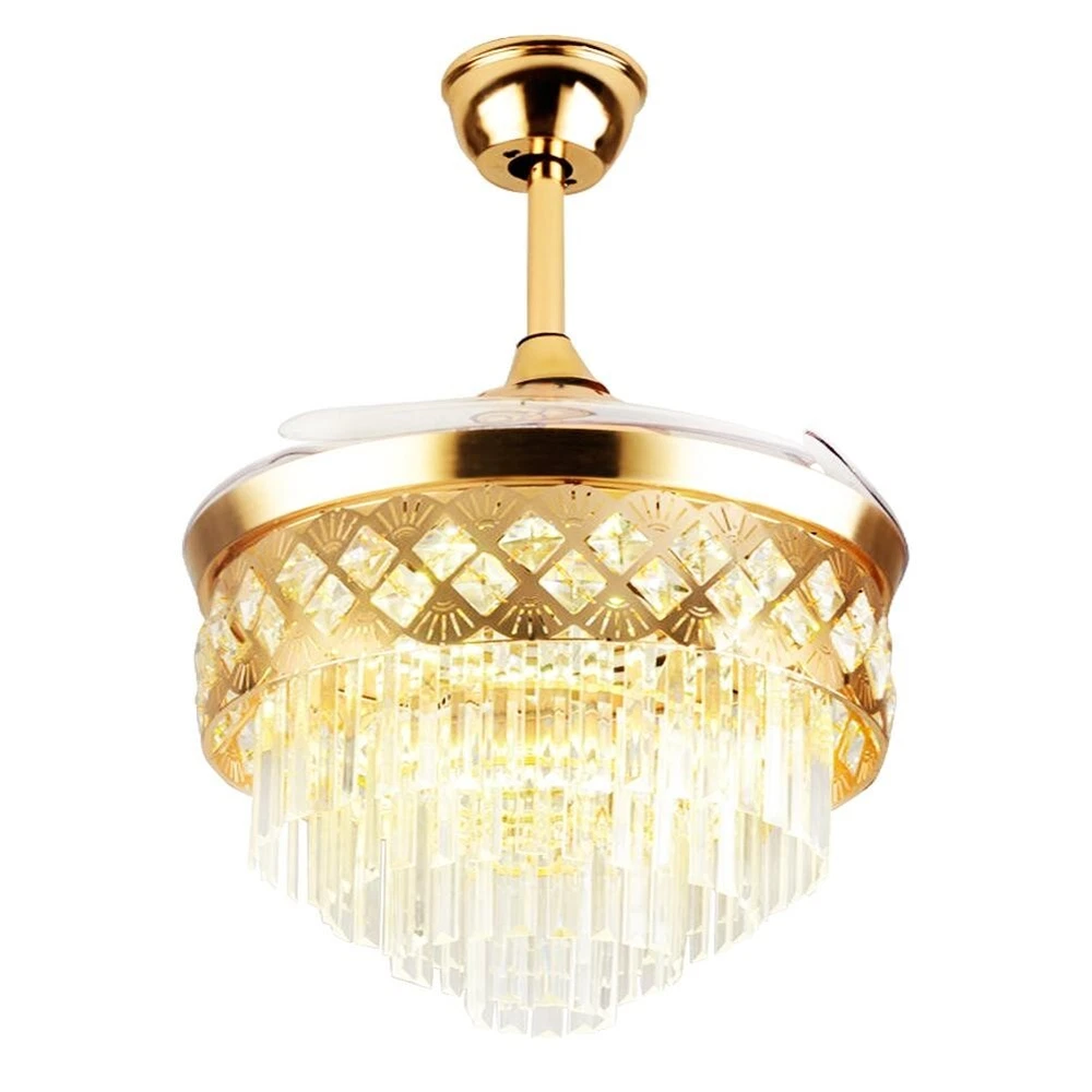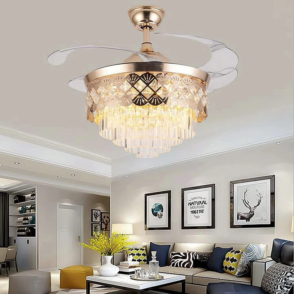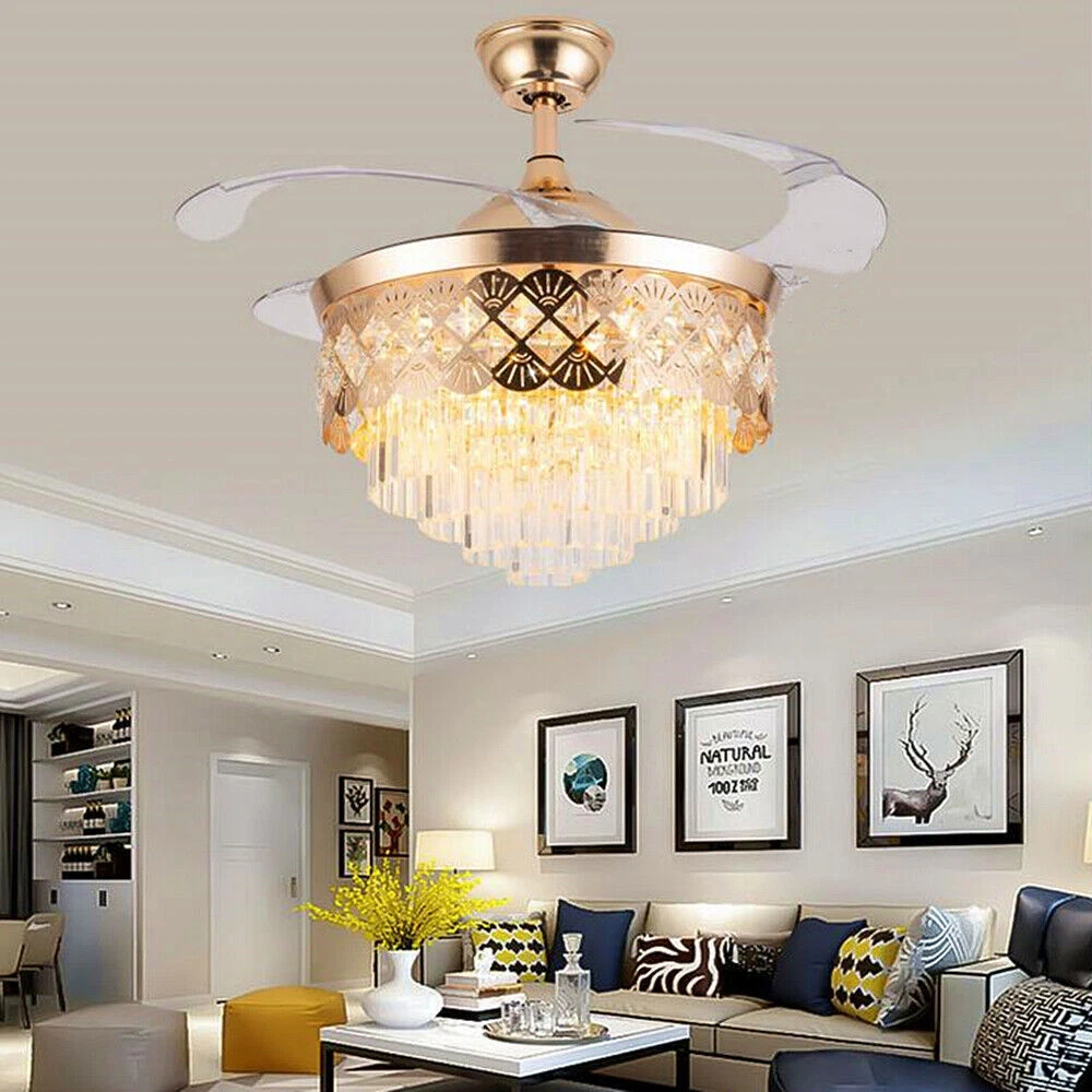 Type: Crystal Ceiling fan light Crystal layer: Crystal Power Source:Corded Installation Area:Indoor Crystal layer: Crystal Style: simple modern Color: Gold Light source: LED(Included) Material:Metal+acrylic+plastic+crystal Lighting color: Warm light,neutral light,white light. Fan Speed: Low - Mid - High Timer function (1/2/4/8H automatic turn off) Power: 36W Voltage: 110V Irradiation area: 15 -30 square meter Package: 1set ceiling fan light 42" LED Ceiling Fan Light Crystal Retractable Invisible Chandelier Lamp w/Remote Features Type: Crystal Ceiling fan light Crystal layer: Crystal Power Source:Corded Installation Area:Indoor Crystal layer: Crystal Style: simple modern Color: Gold Light source: LED(Included) Material:Metal+acrylic+plastic+crystal Lighting color: Warm light,neutral light,white light. Fan Speed: Low - Mid - High Timer function (1/2/4/8H automatic turn off) Power: 36W Voltage: 110V Irradiation area: 15 -30 square meter Package: 1set ceiling fan light About this item Integrating turn on light with 3 color changes (white, warm white, neutral white)3 wind speeds (low, middle, high), you can use the remote control to choose the color you like. With retractable ABS blades, the blades will stretch out and put inside automatically when turned on and off the fan, saving space for your room . Control mode: with remote control, LED light plate three-tone light (white light, neutral light, warm light) LED light plate wattage (36W), lumen (3500lm), airflow (CFM) wind flow in 5000CFM. Size after installation: 107cm/42 in (diameter after fan blade expansion) *48cm/18.89 in (height) Left and right lampshade Material: iron art + crystal (4 layers in total). Ideal for living room, dining room, foyer, villa, bedroom, restaurant, study room, and other places to decorate lighting fixtures. If you have any issues, inquiries or need assistance, please feel free to contact us, we will try our best to help you. Payment Delivery details Terms of sales About us Contact us Payment We only accept several paymeny ways as follow: Delivery details Your goods will be shipped within our handling time after your full payment. This excludes these locations: Alaska, Hawaii and Puerto Rico.APO/FPO’s are definitely excluded. Terms of sales Return: We accept return within 30 days,but we are not responsible for human damage.The return shipping cost is the buyer's responsibilities and try to keep it in your original package. About us We are selling all kind of ceiling fan,crystal chandelier,pendant lights in high quality with best discounted price. Our goal is providing all our customers 100% satisfaction and best customer service. Contact us If you have any questions please contact us through "Ask seller a question" link. We will respond within 2 business day or less.