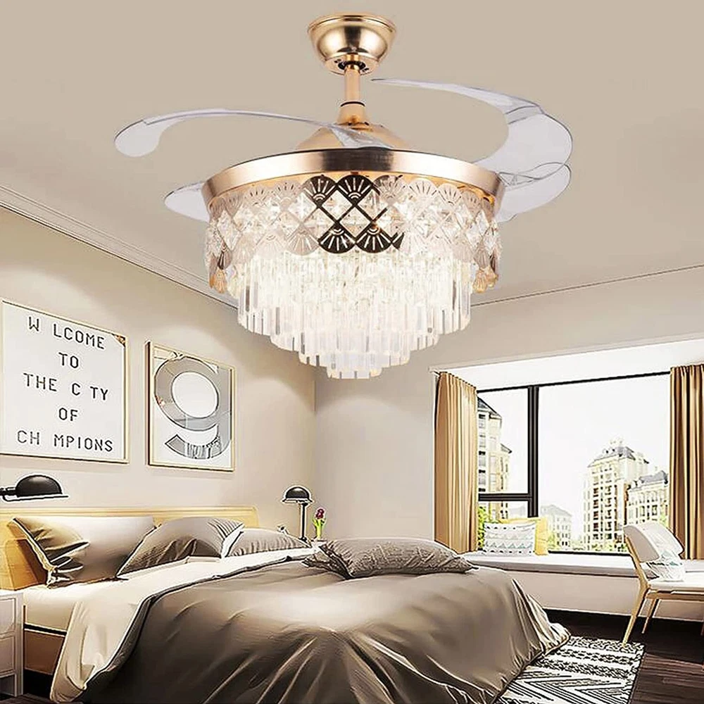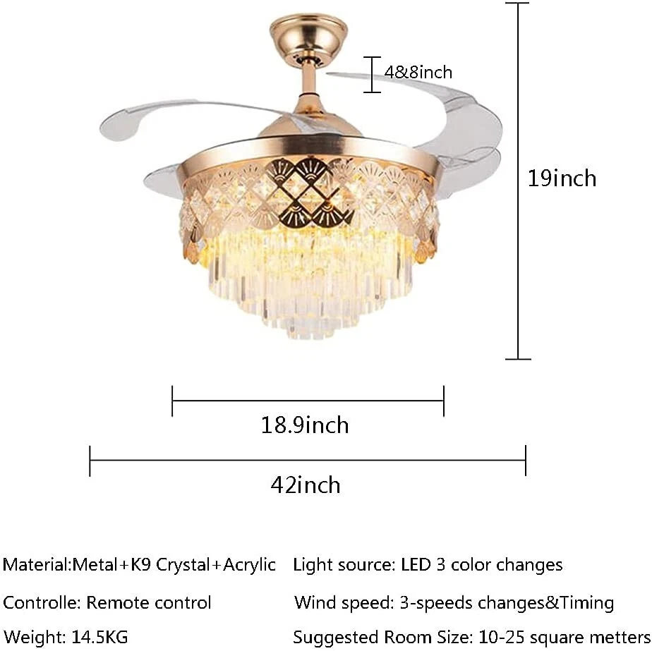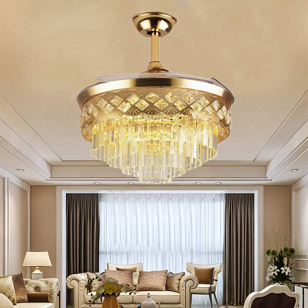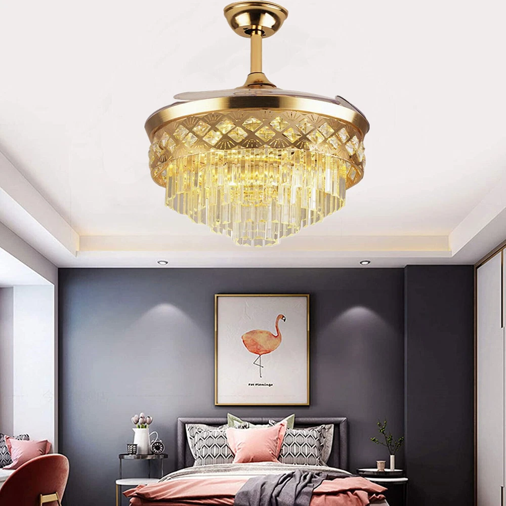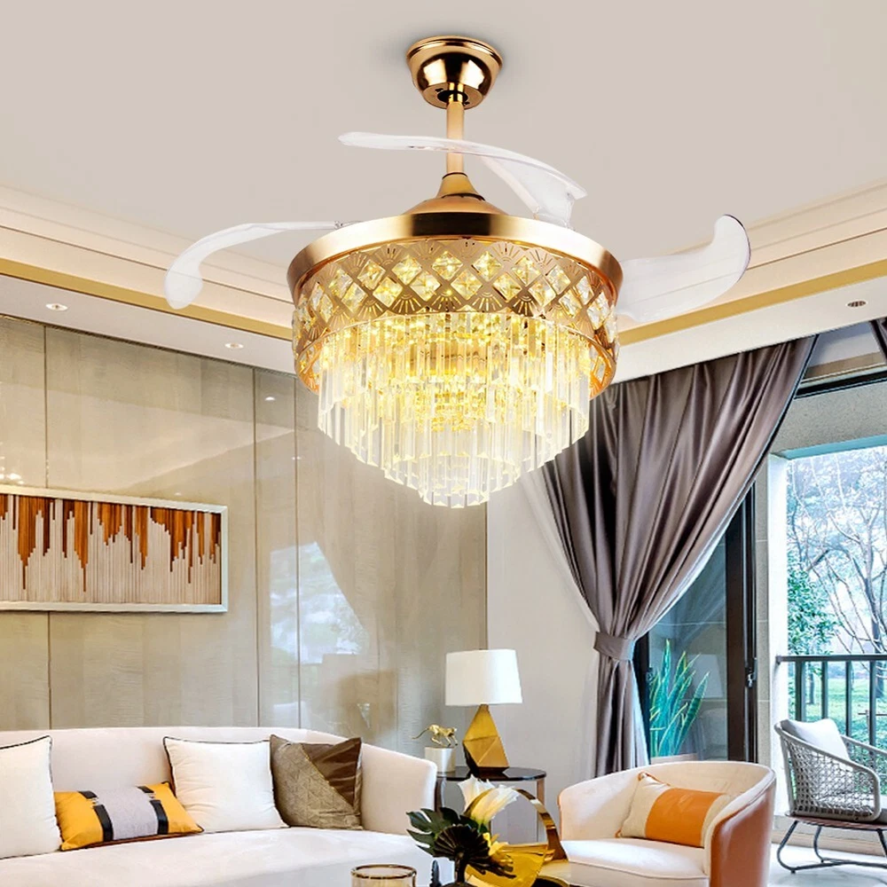 Type: Crystal Ceiling fan light Crystal layer: Crystal Power Source:Corded Installation Area:Indoor Crystal layer: Crystal Style: simple modern Color: Gold Light source: LED(Included) Material:Metal+acrylic+plastic+crystal Lighting color: Warm light,neutral light,white light. Fan Speed: Low - Mid - High Timer function (1/2/4/8H automatic turn off) Power: 36W Voltage: 110V Irradiation area: 15 -30 square meter Package: 1set ceiling fan light 42" LED Ceiling Fan Light Crystal Retractable Invisible Chandelier Lamp w/Remote Features Type: Crystal Ceiling fan light Crystal layer: Crystal Power Source:Corded Installation Area:Indoor Crystal layer: Crystal Style: simple modern Color: Gold Light source: LED(Included) Material:Metal+acrylic+plastic+crystal Lighting color: Warm light,neutral light,white light. Fan Speed: Low - Mid - High Timer function (1/2/4/8H automatic turn off) Power: 36W Voltage: 110V Irradiation area: 15 -30 square meter Package: 1set ceiling fan light About this item Integrating turn on light with 3 color changes (white, warm white, neutral white)3 wind speeds (low, middle, high), you can use the remote control to choose the color you like. With retractable ABS blades, the blades will stretch out and put inside automatically when turned on and off the fan, saving space for your room . Control mode: with remote control, LED light plate three-tone light (white light, neutral light, warm light) LED light plate wattage (36W), lumen (3500lm), airflow (CFM) wind flow in 5000CFM. Size after installation: 107cm/42 in (diameter after fan blade expansion) *48cm/18.89 in (height) Left and right lampshade Material: iron art + crystal (4 layers in total). Ideal for living room, dining room, foyer, villa, bedroom, restaurant, study room, and other places to decorate lighting fixtures. If you have any issues, inquiries or need assistance, please feel free to contact us, we will try our best to help you. Payment Delivery details Terms of sales About us Contact us Payment We only accept several paymeny ways as follow: Delivery details Your goods will be shipped within our handling time after your full payment. This excludes these locations: Alaska, Hawaii and Puerto Rico.APO/FPO’s are definitely excluded. Terms of sales Return: We accept return within 30 days,but we are not responsible for human damage.The return shipping cost is the buyer's responsibilities and try to keep it in your original package. About us We are selling all kind of ceiling fan,crystal chandelier,pendant lights in high quality with best discounted price. Our goal is providing all our customers 100% satisfaction and best customer service. Contact us If you have any questions please contact us through "Ask seller a question" link. We will respond within 2 business day or less.