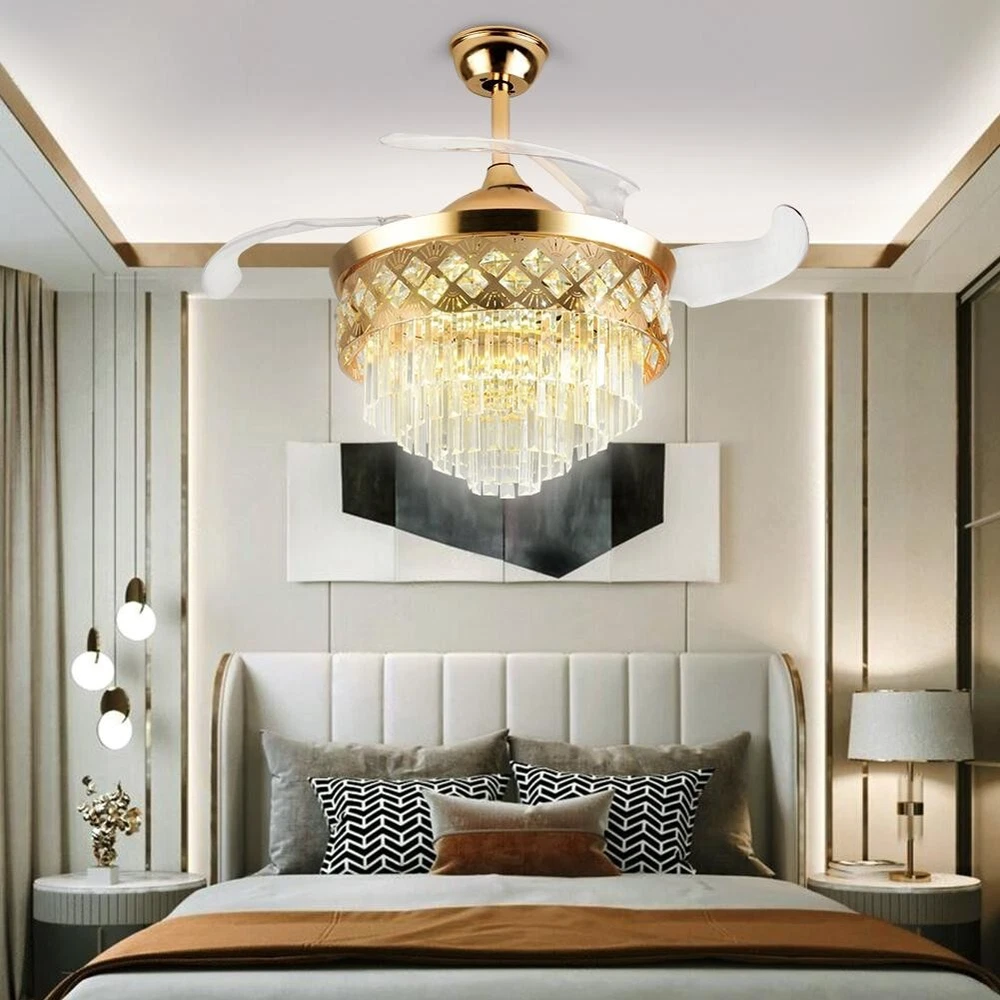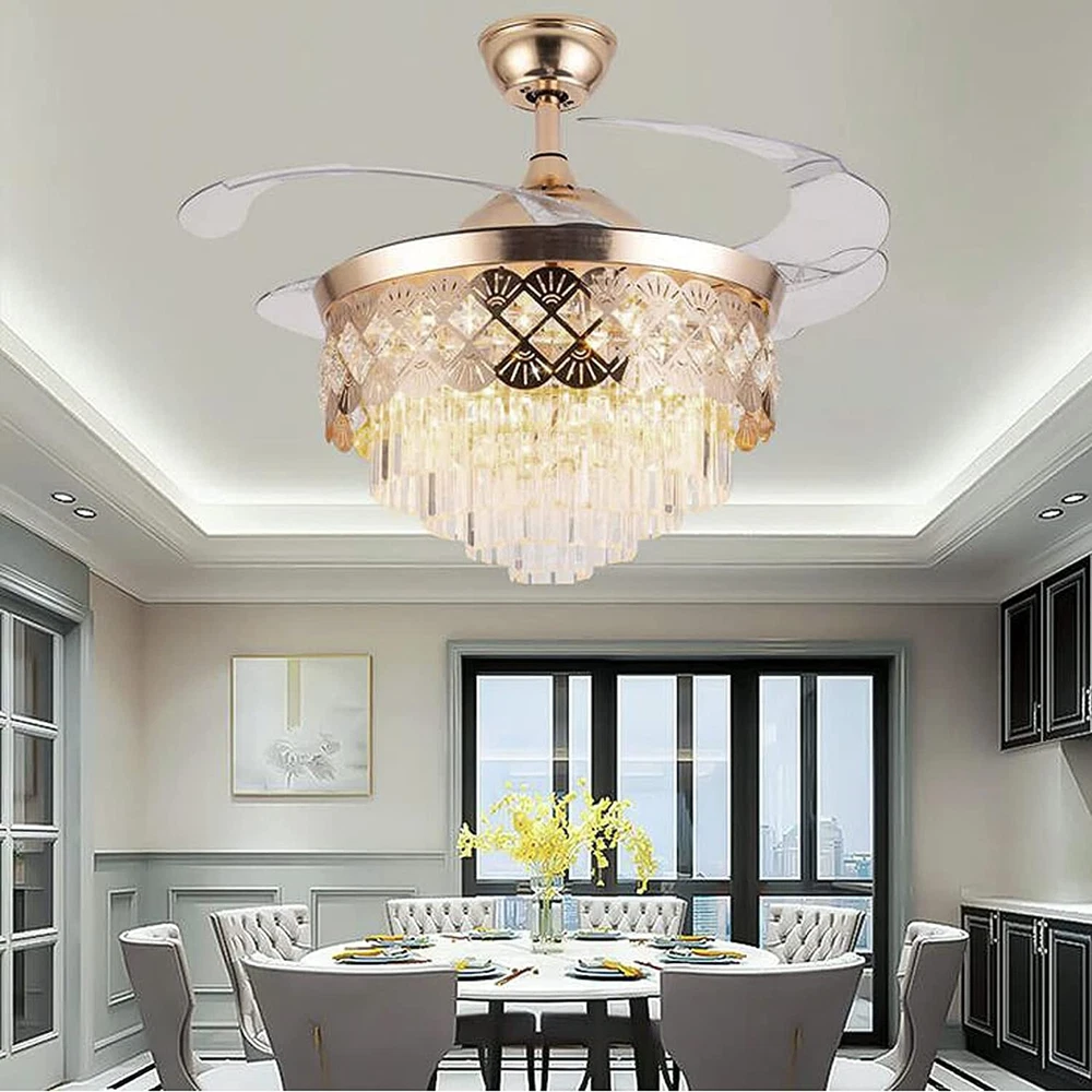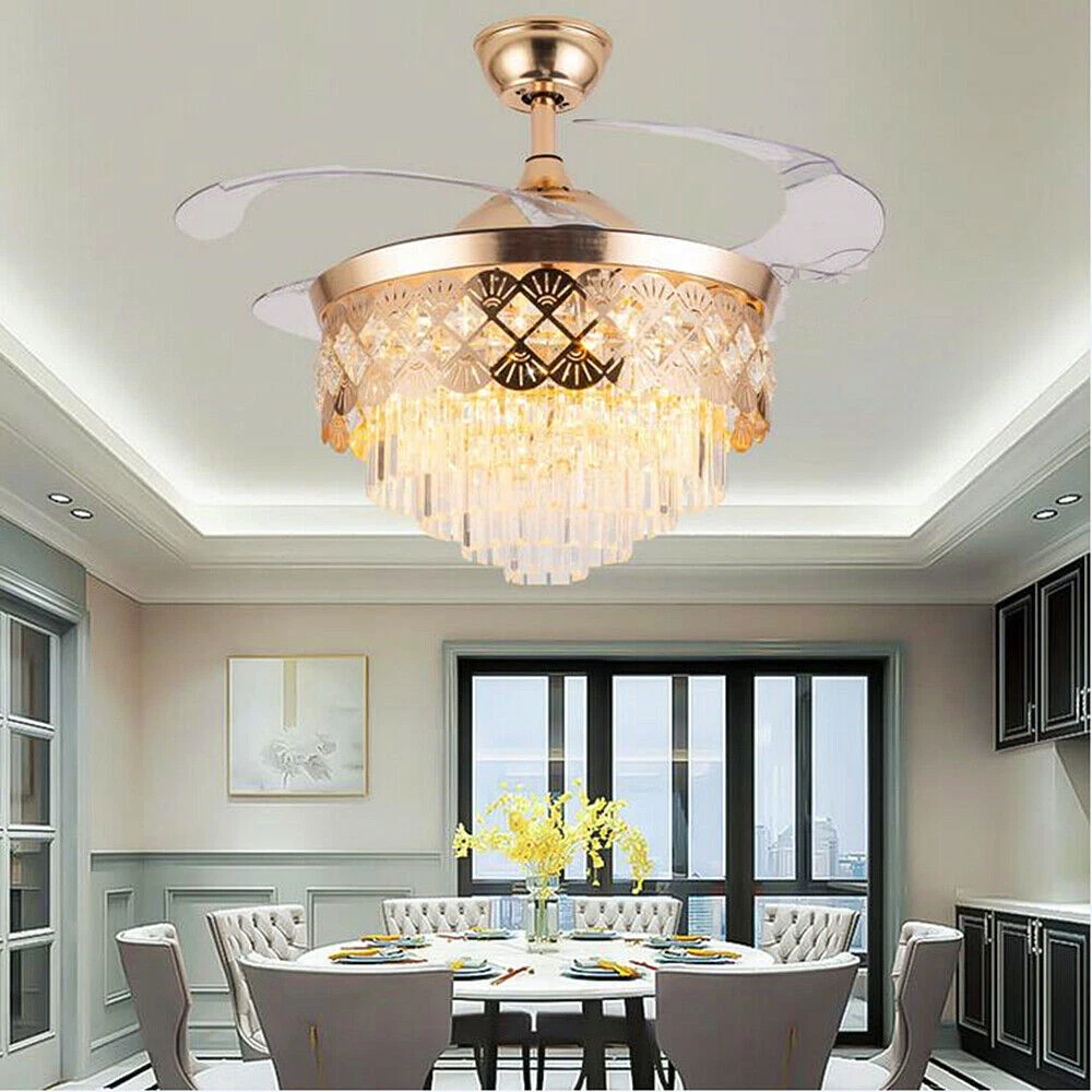 42" LED Ceiling Fan Light Crystal Retractable Invisible Chandelier Lamp w/Remote