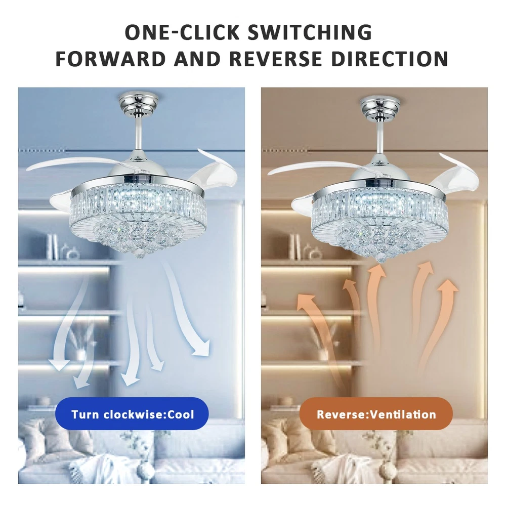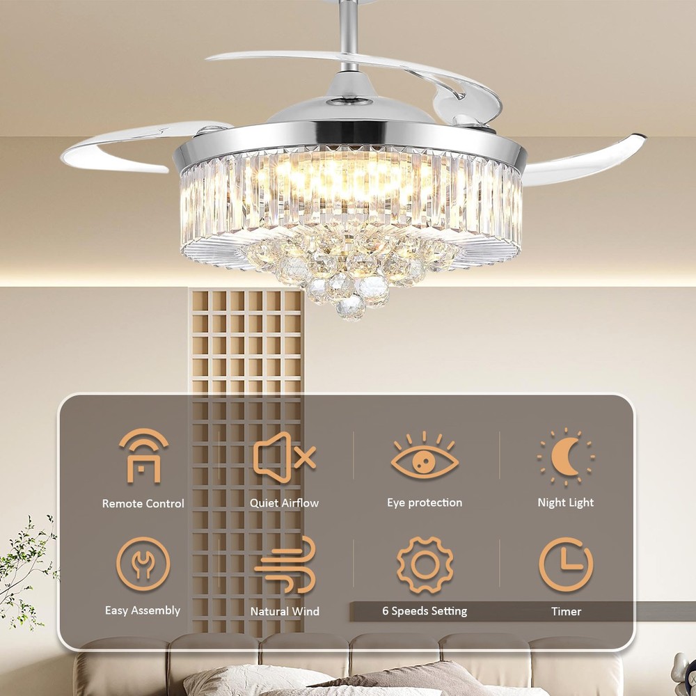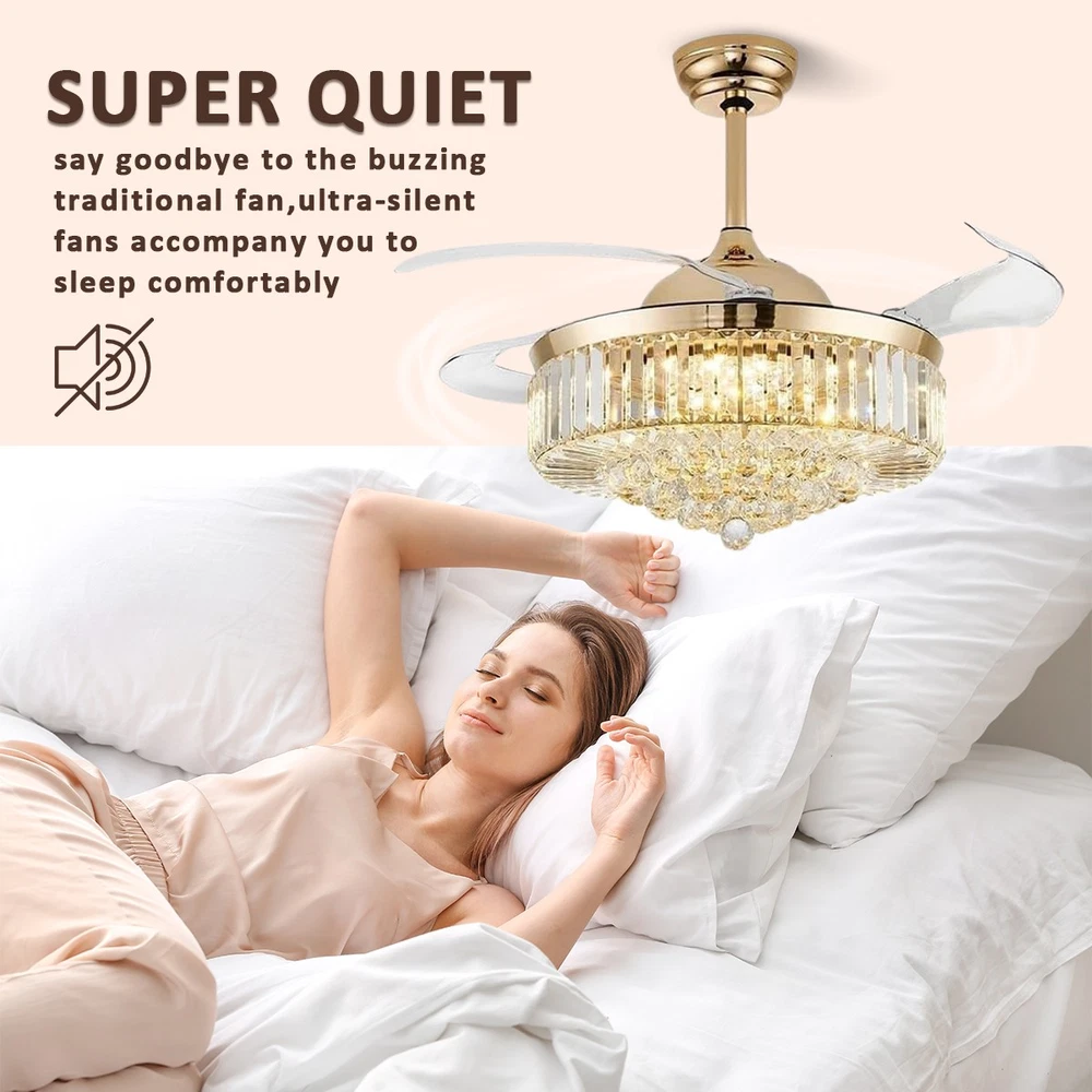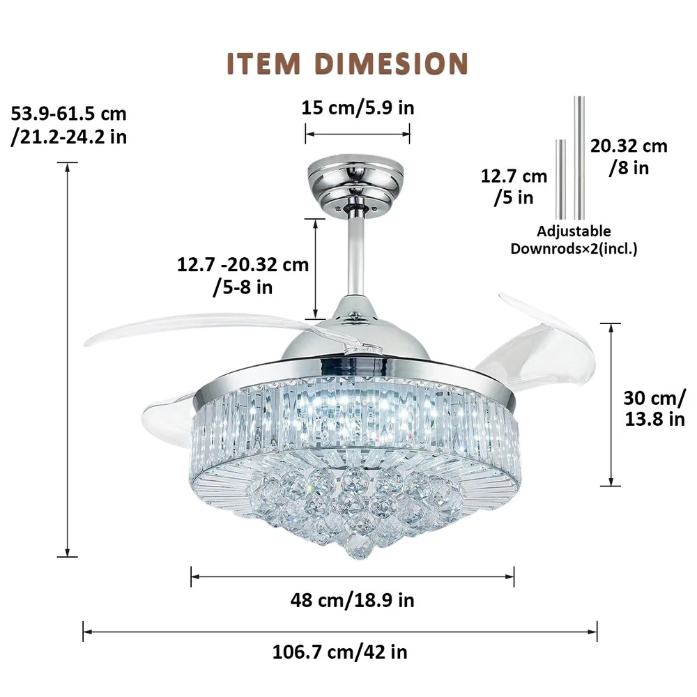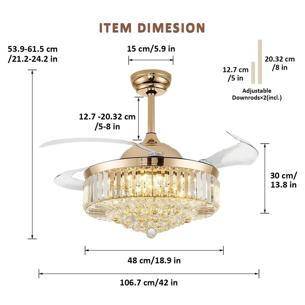 【Gold & Silver Ceiling Fan Size】 42 x 42 x 21.2 inch (LxWxH), 42 inches when the fan is extended, and 18.9 inches when the fan blade is retracted. Suitable for ceiling height greater than 100" / 250cm, ceiling load greater than 20KG. 【Modern Ceiling Fan with Light】 K9 Crystal+Metal+Acrylic+ABS Blade, French gold and silver ceiling fan and crystal chandelier 2-in-1. Gleaming K9 crystal balls, best choice for home decor. This ceiling fan uses a grade electronic plating, which is durable, anti-rust and easy to clean. It is noble and luxurious, with the perfect blend of gold's warmth and silver's elegance, making your home like a palace. 【3 Retractable Blades Fan】 Integrating turn on light with 3 color changes(White light-Warm Light-Yellow Light) & 6 Wind speed setting. Automatic Time setting (1/2/4/8 hours automatic turn off). 【Reversible Silent Copper Motor】 Inserted with high-quiet pure copper motor, which can bring stable and strong power supply with noiseless operation (Less than 30dB). It supports reversible wind function: set to run forward for summer cooling to circulate cool air, or reverse for winter ventilation to push warm air downward from the ceiling. Energy-saving and power-saving, more stable and durable, bringing you comfortable living and sleeping experience with an average service life of 5-10 years. 【Guarantee】 If you receive unqualified or damaged products, please contact us timely and we will handle them immediately. We are committed to provide best service for every customers.