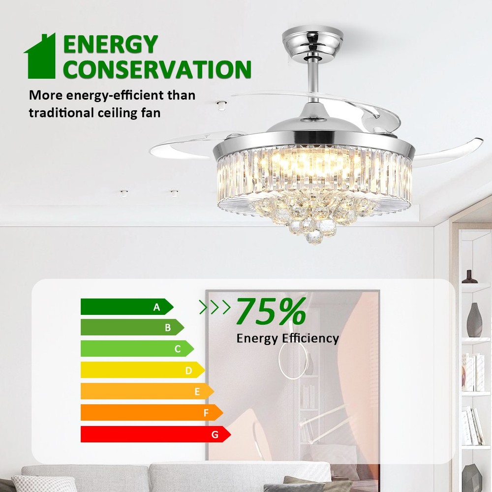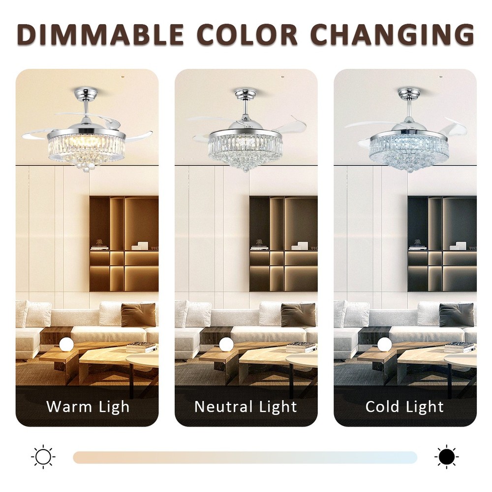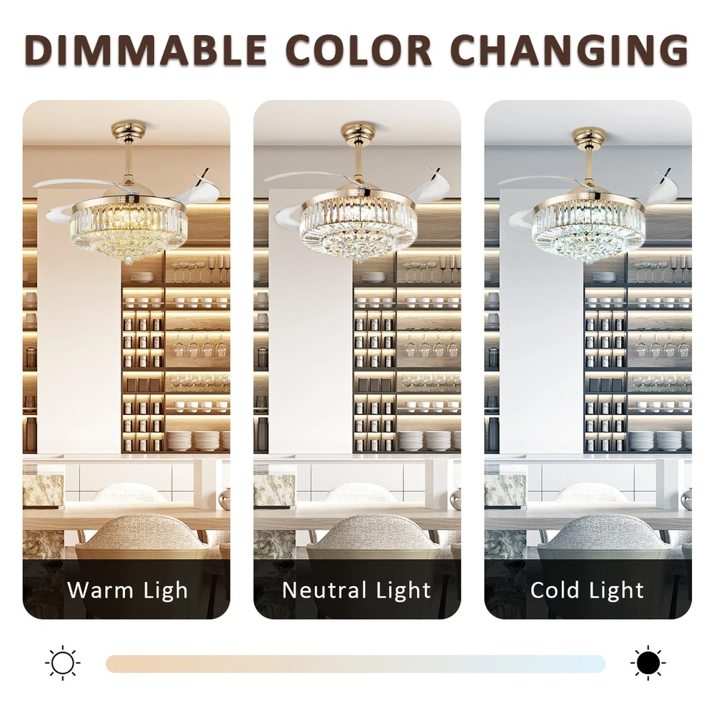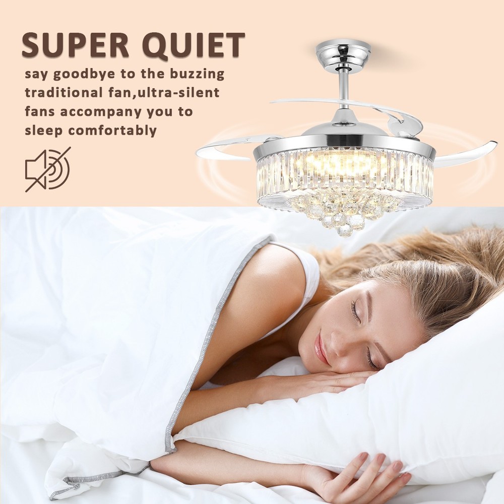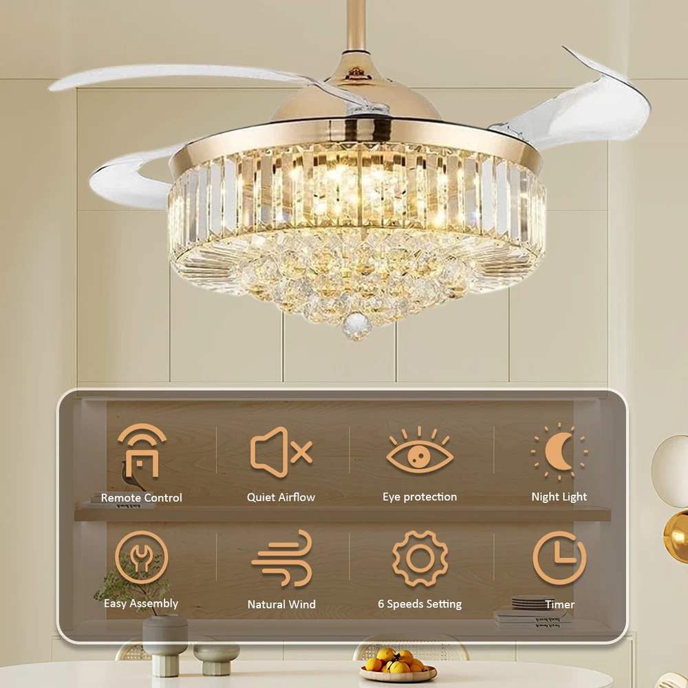 【Gold & Silver Ceiling Fan Size】 42 x 42 x 21.2 inch (LxWxH), 42 inches when the fan is extended, and 18.9 inches when the fan blade is retracted. Suitable for ceiling height greater than 100" / 250cm, ceiling load greater than 20KG. 【Modern Ceiling Fan with Light】 K9 Crystal+Metal+Acrylic+ABS Blade, French gold and silver ceiling fan and crystal chandelier 2-in-1. Gleaming K9 crystal balls, best choice for home decor. This ceiling fan uses a grade electronic plating, which is durable, anti-rust and easy to clean. It is noble and luxurious, with the perfect blend of gold's warmth and silver's elegance, making your home like a palace. 【3 Retractable Blades Fan】 Integrating turn on light with 3 color changes(White light-Warm Light-Yellow Light) & 6 Wind speed setting. Automatic Time setting (1/2/4/8 hours automatic turn off). 【Reversible Silent Copper Motor】 Inserted with high-quiet pure copper motor, which can bring stable and strong power supply with noiseless operation (Less than 30dB). It supports reversible wind function: set to run forward for summer cooling to circulate cool air, or reverse for winter ventilation to push warm air downward from the ceiling. Energy-saving and power-saving, more stable and durable, bringing you comfortable living and sleeping experience with an average service life of 5-10 years. 【Guarantee】 If you receive unqualified or damaged products, please contact us timely and we will handle them immediately. We are committed to provide best service for every customers.
