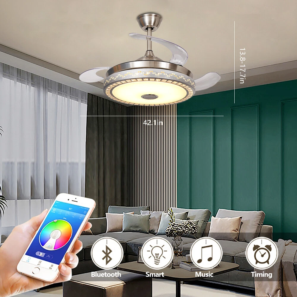 42" Ceiling Fan with LED Light Bluetooth Speaker Retractable W/ Remote ! 1. Description Dimmable Led Ceiling Fan Light Chandelier Flush Mount Lamp Bluetooth&Remote Fan Blows Forward and Reversely Cooling in Summer(Fan Blows Forward) With Cold Wind, Strong Wind Can Increase the Flow of Cold Air Warm in Winter(Fan Blows Reversely ) Cooperate with Warm Wind to Improve Indoor Air Circulatio 2. Features&Highlights 【Remote Control】Integrating Turn on Light with 3 Color Changes (White, Warm White, Neutral White) , 6 Wind Speeds, You Can Use the Remote Control to Choose the Color You like. 【Invisible Ceiling Fan】with Retractable Abs Blades, the Blades Will Stretch out and Put Inside Automatically When Turned on and off the Fan, Saving Space for Your Room. 【Crystal】Absolute Stunning When Lights Turned on, Make Your Room Full of Luxury Sense. 【Applications】Ideal for Living Room, Dining Room, Foyer, Villa, Bedroom, Restaurant, Study Room, and Other Places to Decorate Lighting Fixtures. 【Customer Service】If You Have Any Issues, Inquiries or Need Assistance, Please Feel Free to Contact Us, We Will Try Our Best to Help You. 3. Specifications Style: Modern Type: Ceiling Fan Chandelier Light Source: Led Lighting Board(Included) Switch: Wireless Bluetooth&Remote Control 6 Fan Speed: Low-high Light Color:3 Regular Colors Change by Remote/Colorful Light Change by Bluetooth( Need to Download App to Control It) Timing Function:1/2/4 Hours Voltage:110v-220v(Fit Your Country) Wattage:36-40w Applications:8-25㎡,Living Room, Ding Room,Bedroom, Study Room, Corridors, Foyer, Kitchen, Restaurant, bar, Coffee Shops Etc Diameter:42in /106 Cm(Blades Open) Lampshade Diameter:18.9in/48cm Downrods:10cm/4in +20cm/7.87in (Two Rods, Installed According to Your Ceiling Height) Total Height:35/45cm(Depends on Downrods) Lampshade:abs+Metal Frame Blades: Acrylic Electronic Materials: Steel+ Copper Wire Material: High Quality Acrylic Lampshade, Plating Metal Warm Tips: This Fan Needs Basic Assembly, Professional Would Be Highly Recommended. Floor Height Is Greater than 110", Ceiling Load Is Greater than 25kg. Payment Delivery details Terms of sales About us Contact us Payment We accept ebay payment 。 Fees such as import duties, taxes are not included in the item price or shipping costs. These charges are the buyer's responsibility. Delivery details Shipping: 2-9 working days to: USA Terms of sales We maintain high standards of excellence and strive for hundred percent customer satisfaction. Feedback is very important to us. We hope that you contact us immediately before you give neutral or negative feedback, so that we can address your concerns. It is impossible to address issues if we do not know about them! About us Your satis faction is our ultimate goal. We work hard to earn your trust and future business. Our certified technicians have tested each item before shipping. The unit comes with 1 year limited warranty on all manufacturing defects. a) If you receive a defective item, you may return it or ask for a discount. Please contact us within 14 days after you receive the package. b) What you returned must be intact and in its original packaging as re? u. Customer is responsible for shipping costs of the returned item. c) We will cover the cost of shipping back t with the shipping rate indicated in the registration page. We will send you a new unit or refund the full payment you paid. Thank you. Contact us Business Hour Business Hour: Monday To Friday: 8:30 AM to 5:00 PM (Beijing China time) Due to time zones, our reply to your questions may not be immediately. But within above working time, we will reply your email within 24 hours. If it's non-workdays, please kindly be patient and wait till Monday. Please contact us with ebay message. Please feel free to contact us if you have any questions. Monday To Friday: 8:30 AM to 5:00 PM (Beijing China time) Due to time zones, our reply to your questions may not be immediately. But within above working time, we will reply your email within 24 hours. If it's non-workdays, please kindly be patient and wait till Monday. Please contact us with ebay message. Please feel free to contact us if you have any questions. On Feb 17, 2025 at 22:12:36 PST, seller added the following information: