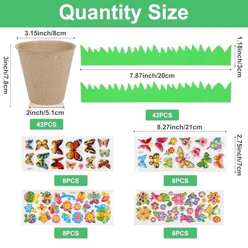 Return Policy Fast Delivery Trusted seller 42 Set Garden Paper Pot Craft Kit Flower Planting Craft with 42 PCS Peat Pots 32 Sheets Adhesive Foam Stickers and 42 PCS Grass for Spring Craft DIY Plant Gift Product Description Package content: the garden paper pot craft kit includes 42 PCS paper flower pots, 42 PCS EVA grass and 32 sheets adhesive foam stickers in four different styles, sufficient quantity to well meet your different DIY making needs. Premium material: the flower pots are made of paper material, easy to absorb water, stable and wear-resistant, the grass are made of quality EVA material, with nice adhesive, not easy to fall off, the adhesive stickers are made of foam material, beautiful and durable, bring you nice using experience. Exquisite design: the foam sticker craft kits are designed with lots of adorable and eye catching patterns, including butterfly, snail, grass and flower patterns, adding a spring and summer flower atmosp. You can make your own DIY crafts with these stickers and pots. Combine fun and study: the DIY garden pot kit can help children improve their creativity and concentration, enhance their understanding of garden planting, improve the expectation of observing plant growth, at the same time, creating more opportunities for interaction between children and parents. Wide application: the flower planting growing kit helps to improve children's creativity, concentration and hands-on skills to complete their works. Suitable for classroom flower planting lesson, DIY handicraft lesson, spring bulletin board decoration, classroom door decor, family activities and more. Perfect gift for family, friends and classmates. Shipping Returns Payment Shipping Shipping is FREE to all addresses other than APO/PO boxes in the lower 48 states. All our stock ships from US-based warehouses. Shipped via USPS or UPS (depending on location and package weight) Unless stated otherwise, all orders will ship within 24-72 hours of your payment being processed. Check our feedback to see the great reviews of FAST shipping we offer. Returns Seller does not accept returns Payment We currently accept payment via eBay managed payments only. Once payment is cleared, we will dispatch your shipment within 1-3 business days. Please refer to the "Shipping" tab for more information regarding shipping speed to your destination.