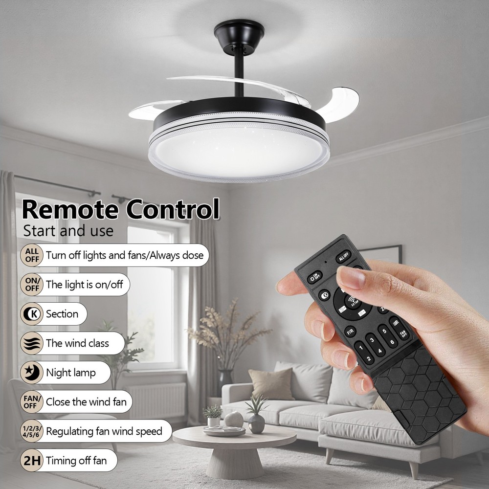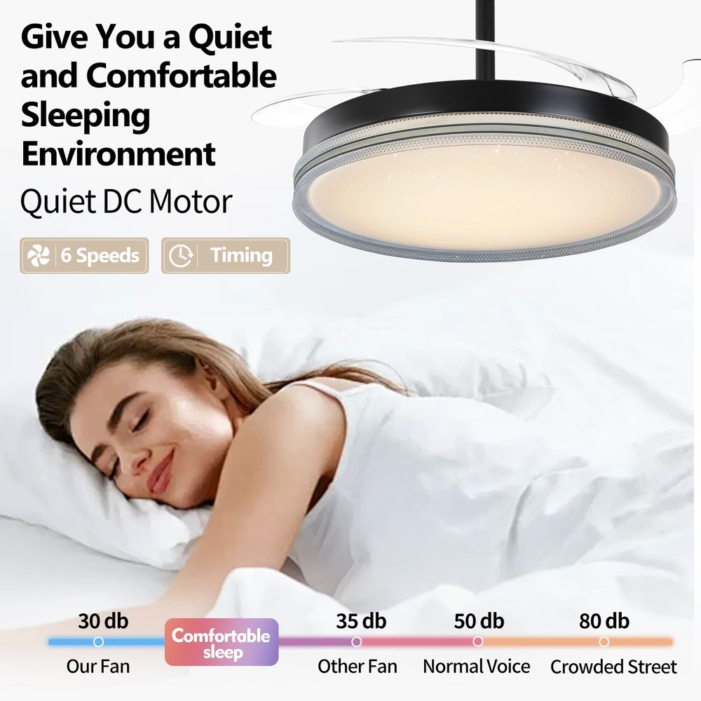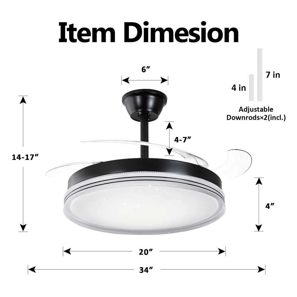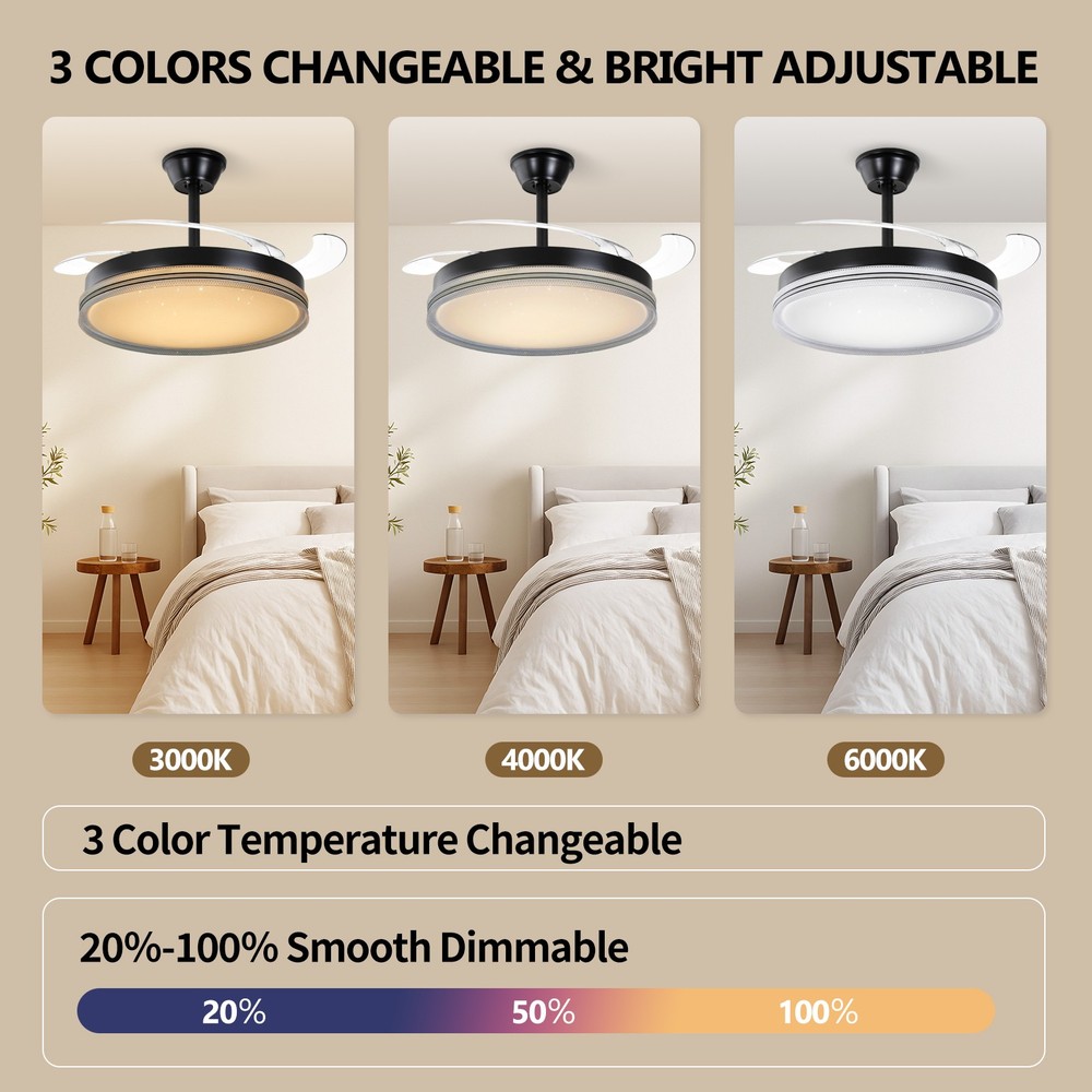 【 Modern Simple Style 】 This retractable ceiling fan comes with matte white body and 4 transparent blades which looks modern and simple. Clear blades is automatically retracted or invisible when fan off. It just looks like a big round light. The motor for this invisible ceiling fan with lights is made of silicon steel and copper which makes the quality indurable and stable. 【 Dimmable Light 】 This retractable ceiling fan with Dimmable LED integrated light and luminous area diameter is up to 20 inches, the flicker-free LED light source not only makes the light softer, but also more energy efficient than 2 round light. High light transparency PC cover makes light more evenly distributed and more bright. Three color changeable (Warm 3000K/Daylight 4000K/Cool 6000K) creates different atmosphere. 【6 Wind Speed & Quiet DC Motor 】 The ceiling fan offers six different speed options, allowing you to choose the ideal airflow intensity for your comfort needs. DC motor with clear blades delivers powerful airflow with durable and quiet performance. The volume is under 30dB when the fan is running. The retractable ceiling fan has a good airflow to keep you cool and get rid of the summer heat. 【 Remote Control 】 This ceiling fans with lights, allows you to adjust the brightness of the light and customize the color temperature by the remote , which is very convenient. Timer : 1/2/4 hours for options. Lighting has a memory function. For example, if you use warm light for more than 30 seconds, and then turn off , after 30s then you turn on again, it will still be warm light. 【Buy with Confidence】 The ceiling fans are perfect for various rooms, indoor ceiling fans, farmhouse ceiling fan, garage ceiling fans, patio ceiling fan, bedroom ceiling fan. We provide a 12-month worry-free quality guarantee and lifetime professional customer service for urbanest ceiling fans with lights and remotes. You can contact us at any time if you have any issues during using or installing the fan.