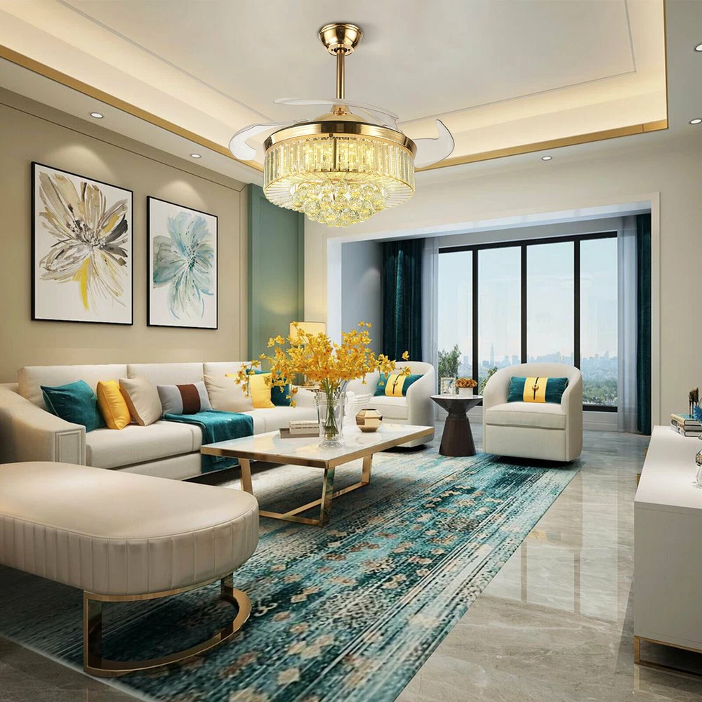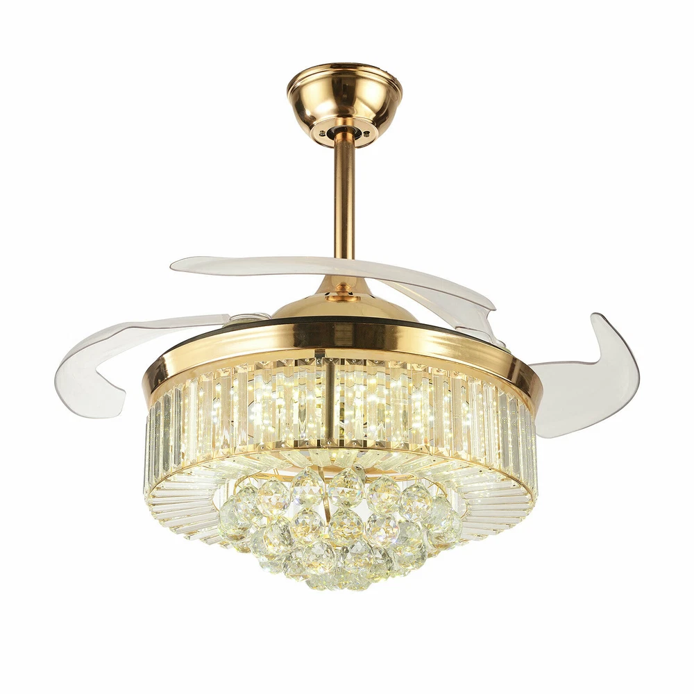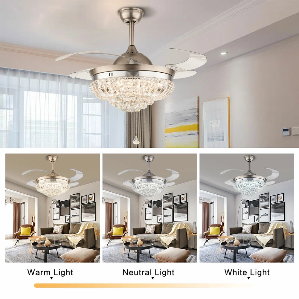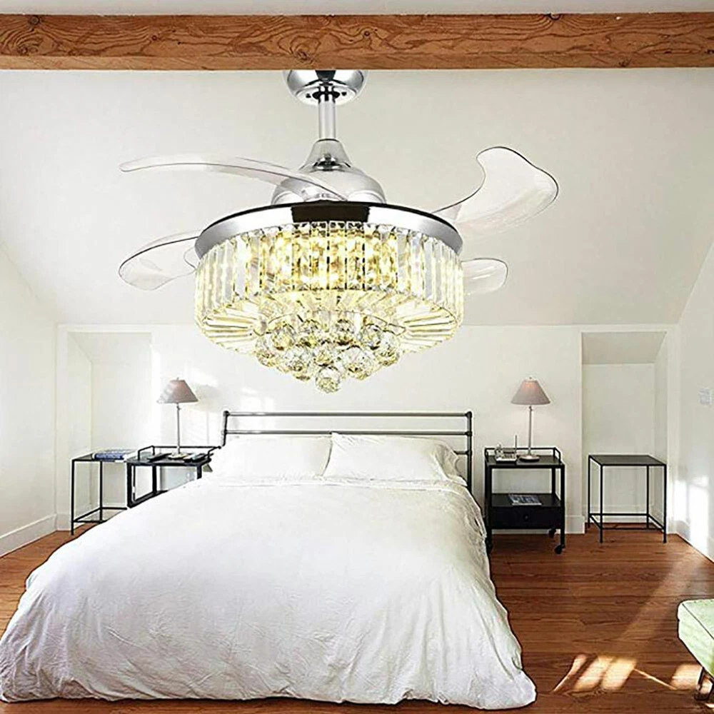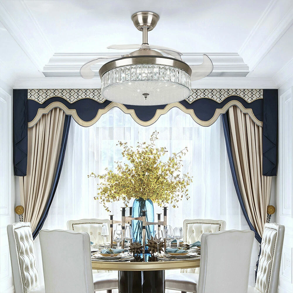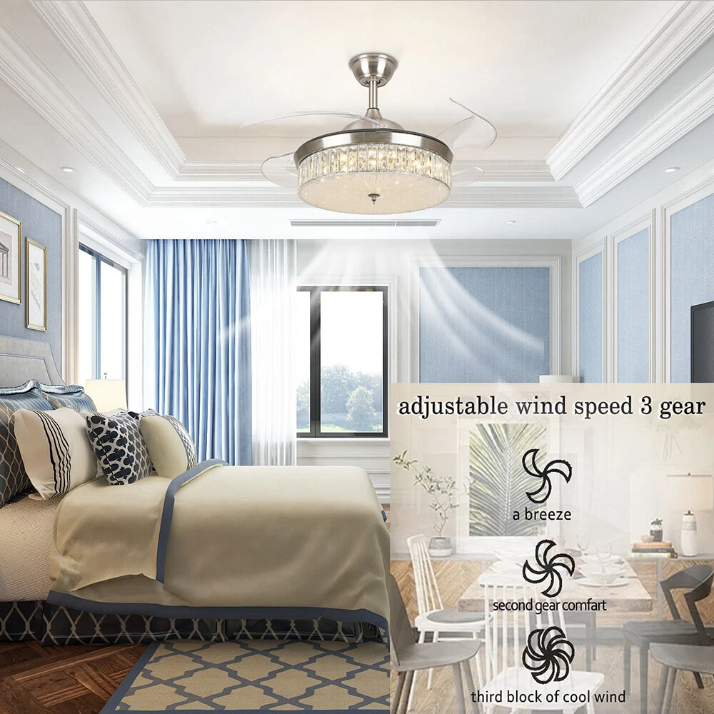 42"/36" Crystal Chandelier Invisible Ceiling Fan Light With 3-Color LED +Remote ❤Welcome❤ Model One:42" Silver #1 Product Description: Color:Silver This modern ceiling fan with lights is a combination of ceiling fan and crystal chandelier: ★As for a ceiling fan, it has 4 retractable blades that can stretch out and put inside automatically when turned on and off. ★That means, when turned off, the blades will put inside and become 'invisible', totally a chandelier with crystal; ★When turned on, the blades will stretch out, and transfer to a traditional ceiling fan with lights. ★This chandelier fan is controlled by remote control, ceiling fan speed and LED light can be controlled separately by a single remote control. Fan Chandelier Features: ♥Pendant Lights Type: Crystal Pendant Lights ♥Material: Stainless Steel+k9 crystal+ABS fan ♥Size: 42 inches ♥Color:Silver ♥Style: modern ♥Number of Blades: 4 ♥Lighting Features: dimmable, fan light ♥Application Type: Indoor ♥Light Bulb Type: LED ♥Number of lamps: 10 ♥Power: 41W (inclusive) -50W (including) ♥Applicable Places: living room/bedroom/kitchen/office and restaurant ♥Voltage: 110V Please Note: ▲The actual color of the chandelier may be deviated due to the color of the display and the angle of the picture. ▲Please receive the actual color of the goods as standard, thank you for your understanding and support. Model Two:42" Gold Color:Rose Gold This modern ceiling fan with lights is a combination of ceiling fan and crystal chandelier: ★As for a ceiling fan, it has 4 retractable blades that can stretch out and put inside automatically when turned on and off. ★That means, when turned off, the blades will put inside and become 'invisible', totally a chandelier with crystal; ★When turned on, the blades will stretch out, and transfer to a traditional ceiling fan with lights. ★This chandelier fan is controlled by remote control, ceiling fan speed and LED light can be controlled separately by a single remote control. Fan Chandelier Features: ♥Pendant Lights Type: Crystal Pendant Lights ♥Material: Stainless Steel+k9 crystal+ABS fan ♥Size: 42 inches ♥Color: Gold ♥Style: modern ♥Number of Blades: 4 ♥Lighting Features: dimmable, fan light ♥Application Type: Indoor ♥Light Bulb Type: LED ♥Number of lamps: 10 ♥Power: 41W (inclusive) -50W (including) ♥Applicable Places: living room/bedroom/kitchen/office and restaurant ♥Voltage: 110V Please Note: ▲The actual color of the chandelier may be deviated due to the color of the display and the angle of the picture. ▲Please receive the actual color of the goods as standard, thank you for your understanding and support. Model Three:36" Silver #1 36" ceiling fan with lights is a combination of ceiling fan and crystal chandelier: ★As for a ceiling fan, it has 4 retractable blades that can stretch out and put inside automatically when turned on and off. ★That means, when turned off, the blades will put inside and become 'invisible', totally a chandelier with crystal; ★When turned on, the blades will stretch out, and transfer to a traditional ceiling fan with lights. ★This chandelier fan is controlled by remote control, ceiling fan speed and LED light can be controlled separately by a single remote control. Fan Chandelier Features: ♥Pendant Lights Type: Crystal Pendant Lights ♥Material: Stainless Steel+k9 crystal+ABS fan ♥Size: Modern Fan Light Chandelier:36 inches when the fan is extended, Includes two lower bars, one for 4 inches and the other for 8 inches, you can choose one to install ♥Color: Silver ♥Style: modern ♥Number of Blades: 4 ♥Lighting Features: dimmable, fan light ♥Application Type: Indoor ♥Light Bulb Type: LED ♥Number of lamps: 10 ♥Power: 41W (inclusive) -50W (including) ♥Applicable Places: living room/bedroom/kitchen/office and restaurant ♥Voltage: 110V Model Four:36" Silver #2 36" Modern LED Ceiling Fan Light Crystal Chandelier Retractable w/ Remote US ❤ Modern invisible fan chandelier: Fan and chandelier combined into one with remote control, automatic telescopic fan blade, LED lamp beads ❤ Ceiling fan with remote: . Dimmable LED lights have 3 color changes (White-Warm-Yellow), Fan has 3 speed settings (Low-Mid-High). All these functions can be easily controlled by remote ❤ Modern Fan Light Chandelier: 36 inches when the fan is extended, Includes two lower bars, one for 4 inches and the other for 9.8 inches, you can choose one to install ❤ Bedroom Ceiling Fans Material: metal body + acrylic lamp cover + ABS retractable blades + pure copper motor(providing powerful air flow, quiet and durable. With vents, it can reduce the internal temperature of the main unit and extend the life of the motor.) Ceiling Fan with LED Light: Replaceable LED light will last a longtime and save you the most on your energy bills. Ceiling Fan with Remote Control: Control the light and fan speed separately for ease and convenience. Color temperature: CCT Dimmable (3 light cycles) Light source type: LED(Light Kit Included) Control: Remote Control Included Dimensions: 36Inch, 4 Retractable Blades Light Wattage: 36W Motor Wattage: 56W Speed: 3 Voltage: AC 110 -120 Volts Average Service Life: 5~10 Years Installation Instructions: Ceiling Chandelier Suitable for Flat Roof Concrete Ceiling House, for Gypsum Board and Wood Ceiling, You Need to Buy a Remodeling Bracket; Identify and Connect Electrical Wires; Ceiling height is greater than 110", Lift 110 Pounds. What you get: Retractable ceiling fan x 1 Screws sets x 1 Down rods x 2 (1 2 CM & 2 5 CM) Remote control x 1 Instruction Manual x 1 Model Five:42" Silver #2 42inch Ceiling Fan Lights LED Chandelier Retractable 4 Blades w/ Remote USA Product Description: Color temperature: CCT (3 light cycles) Light source type: LED(Light Kit Included) Control: Remote Control Included Dimensions: 42Inch, 4 Retractable Blades Light Wattage: 36W Motor Wattage: 56W Wind Speed: 3 Vol