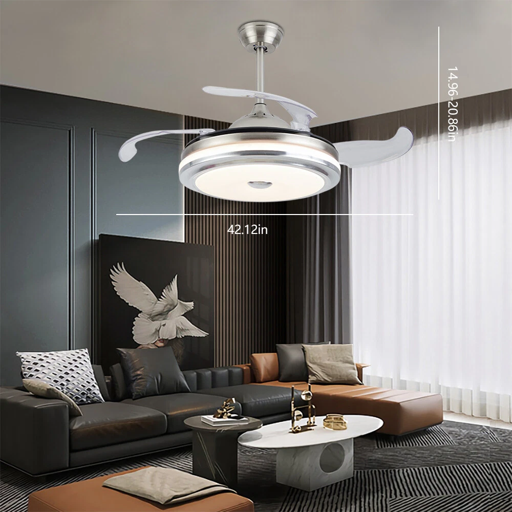 36"/42" Invisible Ceiling Fan Lamp Remote Control Dimmable LED Chandelier Light Specifications: LED color: 3 color(white,warm white,neutral white ) Material: Metal+ABS fan Motor: high-quiet motor Fan blade; 4 leaf plastic fan blade Dimensions: Diameter 36" , height 10cm(20cm spare parts) Diameter 42" , height 10cm(20cm spare parts) Color: chrome Lamp: 36 watt Bulb: led Voltage: 110V Use For:Living Room / Bed Room/ Study Room /Restaurant Package: 1 light+RC control Modern invisible fan chandelier: Fan and chandelier combined into one with remote control, automatic telescopic fan blade, LED lamp beads Ceiling fan with remote: . Dimmable LED lights have 3 color changes (White-Warm-Yellow), Fan has 3 speed settings (Low-Mid-High). All these functions can be easily contr 42inch/36inch Chandelier LED Ceiling Fan Light 3-Speed Pendant Lamp & Remote 36W 36"/42" Invisible Ceiling Fan Lamp Remote Control Dimmable LED Chandelier Light Specifications: LED color: 3 color(white,warm white,neutral white ) Material: Metal+ABS fan Motor: high-quiet motor Fan blade; 4 leaf plastic fan blade Dimensions: Diameter 36" , height 10cm(20cm spare parts) Diameter 42" , height 10cm(20cm spare parts) Color: chrome Lamp: 36 watt Bulb: led Voltage: 110V Use For:Living Room / Bed Room/ Study Room /Restaurant Package: 1 light+RC control Modern invisible fan chandelier: Fan and chandelier combined into one with remote control, automatic telescopic fan blade, LED lamp beads Ceiling fan with remote: . Dimmable LED lights have 3 color changes (White-Warm-Yellow), Fan has 3 speed settings (Low-Mid-High). All these functions can be easily controlled by remote Modern Fan Light Chandelier: 42 inches when the fan is extended, and 19 inches when the fan blade is retracted. Bedroom Ceiling Fans Material: metal body + acrylic lamp cover + ABS retractable blades + pure copper motor(providing powerful air flow, quiet and durable. With vents, it can reduce the internal temperature of the main unit and extend the life of the motor.) Payment Delivery details Terms of sales About us Contact us Payment We accept ebay payment 。 Fees such as import duties, taxes are not included in the item price or shipping costs. These charges are the buyer's responsibility. Delivery details Shipping: 2-9 working days to: USA Terms of sales We maintain high standards of excellence and strive for hundred percent customer satisfaction. Feedback is very important to us. We hope that you contact us immediately before you give neutral or negative feedback, so that we can address your concerns. It is impossible to address issues if we do not know about them! About us Your satis faction is our ultimate goal. We work hard to earn your trust and future business. Our certified technicians have tested each item before shipping. The unit comes with 1 year limited warranty on all manufacturing defects. a) If you receive a defective item, you may return it or ask for a discount. Please contact us within 14 days after you receive the package. b) What you returned must be intact and in its original packaging as re? u. Customer is responsible for shipping costs of the returned item. c) We will cover the cost of shipping back t with the shipping rate indicated in the registration page. We will send you a new unit or refund the full payment you paid. Thank you. Contact us Business Hour Business Hour: Monday To Friday: 8:30 AM to 5:00 PM (Beijing China time) Due to time zones, our reply to your questions may not be immediately. But within above working time, we will reply your email within 24 hours. If it's non-workdays, please kindly be patient and wait till Monday. Please contact us with ebay message. Please feel free to contact us if you have any questions. Monday To Friday: 8:30 AM to 5:00 PM (Beijing China time) Due to time zones, our reply to your questions may not be immediately. But within above working time, we will reply your email within 24 hours. If it's non-workdays, please kindly be patient and wait till Monday. Please contact us with ebay message. Please feel free to contact us if you have any questions.