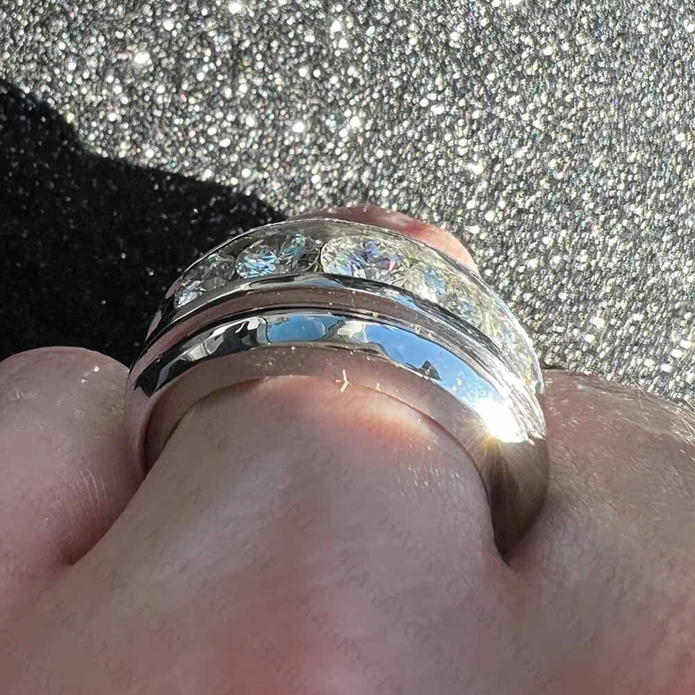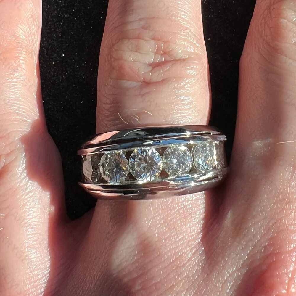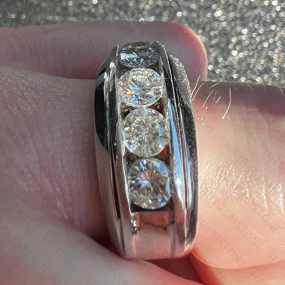 Main Stone: Moissanite Occasion: Engagement, Wedding Department: Men Diamond Color Grade: D Theme: Beauty Metal: White Gold Plated Colored Diamond Intensity: Fancy Handmade: Yes Secondary Stone: Moissanite Certification: IGLA Main Stone Shape: Round Country of Origin: United States Signed: Yes Band Width: 8 mm Main Stone Treatment: Not Enhanced Customized: Yes Main Stone Color: White Cut Grade: Excellent Setting Style: Channel-Set Shape: Round Seller Warranty: Yes Main Stone Creation: Lab-Created Main Stone Length: 6 mm Number of Diamonds: 5 Color: White Brand: Unbranded Diamond Clarity Grade: Very, Very Slightly Included (VVS1) Personalize: Yes Number of Gemstones: 0 Gemstone Clarity Grade: Eye Clean Personalization Instructions: Brilliant Moissanite Stone. Made-to-order. Ring size, stone & metal customizable. Share size during order confirmation. Sizable: Yes Type: Ring Ring Size: 7 Wholesale: Yes Material: Metal Main Stone Width: 6 mm Base Metal: Sterling Silver Features: Nickel-Free Style: Band, Prong Metal Purity: 925 Total Carat Weight: 4.2 CTW Country/Region of Manufacture: United States