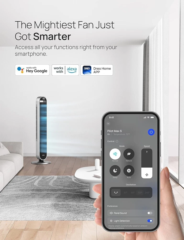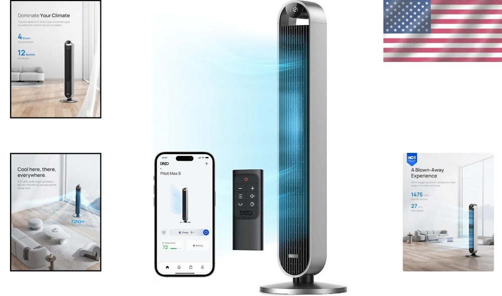 Shape: Rectangle Smart Home Protocol: Wi-Fi, Bluetooth Air Flow Volume: 1475 CFM Product Dimensions: 12.76"d X 12.76"w X 42.52"h Electric Fan Design: Floor Fan Color: Silver Collection Name: Home,office Operating Sound Rating: 25 dB Blade Material: Made In Airfoil Shapes Power: 36 W Air Flow Capacity: 1475 Cubic Feet Per Minute Number of Blades: Bladeless Voltage: 24 V Specification Met: Fcc, Ul, Etl Style: Wifi Wattage: 36 Watts Indoor/outdoor Usage: Indoor Blade Length: 19.13 Inches Special Feature: Works With Alexa/google/app/remote Smart Home Compatibility: Amazon Alexa, Google Home Item Depth: 12.76 in Type: Tower Item Weight: 4.6 kg Power Source: DC, Electric Timer Control: 12 hrs Control Style: Remote Control, Touch Noise Level: 25 Db Switch Type: Touch Theme: Dreo Pilot Max Control Method: Remote, Touch Suitable For: Indoor Material: Plastic, Aluminum gtin13: Does not apply UPC: Does not apply Brand: Unbranded Room: Bedroom, Kitchen, Living Room, Home Office, Nursery Features: Remote Control, Oscillation, Adjustable Height, Timer, 4 different modes, 12 speed settings, Auto Mode, Dreo app compatibility, works with Alexa, works with Google Assistant Blade Orientation: Bladeless Number of Speeds: 12 Mounting: Floor