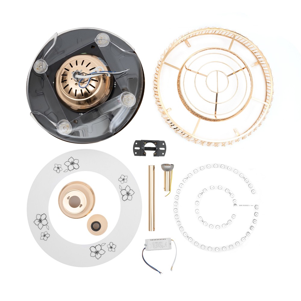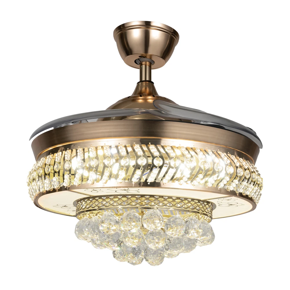 【Remote Control】Integrating turn on light with 3 color changes (white, warm white, neutral white)you can use the remote control to choose the color you like. 【Crystal desige】 the 3-layer body is all decorated with K9 crystal and absolutely stunning when the light is on. Light effect makes your room full of luxury. 【Ceiling Fan】With ABS blades, It can be used as an electric fan, and it can also be used for lighting 【Applications】Ideal for living room, dining room, foyer, villa, bedroom, restaurant, study room, and other places to decorate lighting fixtures. 【Customer Service】If you have any issues, inquiries or need assistance, please feel free to contact us, we will try our best to help you. Style: Modern Type: Ceiling Fan Chandelier Light Source: Led Lighting Board(Include) Switch: remot 42" Luxury Ceiling Fan Light w/ Remote Control LED Fan Lamp Chandelier Fixture ❤Welcome❤ Description The shining lights on the ceiling of your home are also one of the expressions of your aesthetics and taste, and this crystal ceiling fan with lights is your good choice! The unique gold frame, K9 crystals, and ABS material fan blades look elegant and poised, making this product a highlight of your home. The bright and energy-efficient LED strip provides a large enough lighting area to meet your daily lighting needs. With the simple operation of the remote control, you can easily create a cool and bright space. Key Features Durable and Sturdy: An iron frame with an electroplating process, high-quality ABS material fan blades, bright K9 crystal balls, a white acrylic lampshade with printed flower patterns, and a built-in pure copper motor with silicon steel sheet make it more anti-corrosive , wear-resisting , durable and sturdy. Dual Control: You can use the wall switch(not included) to control the lights, or use the equipped remote control to turn on/off the lights and fan within a range of 32ft. Adjustable Wind Speed&Time: Three different fan speeds(low/middle/high) can be set through the remote control, giving a customized experience. Also, the intelligent timing function allows automatically turning off the fan after 1h, 2h, or 4h. Excellent Lighting Effect: The white acryl ic lampshade with flower patterns has a stronger transparency, plus a 107.63-258.33ft ² large illuminated area and three different light colors of 3000-6000K(cold/warm/neutral light), stunning when only turning on the lights and making your room full of luxury and modern sense! Optional Height: Our package contains two down rods (3.93 inches, and 9.84 inches in length), which are suitable for rooms with ceiling heights ranging from 8.2 to 10.5 feet. You can choose the more suitable one to use based on the height of the ceiling in your room. Retractable Design: The ABS material fan blades can automatically stretch/shrink when turned on/off. This design saves space when turned off and makes it stunning for your guests because of the retractable techiness. Low Noise: The noise emitted by the pure copper motor during operation is only about 30 decibels, which does not easily affect you or others. User-friendly Design: Compared with traditional incandescent bulbs, it adopts the LED strip, which can maintain soft, strobe-free lighting effects and bring you higher brightness with lower energy consumption, saving your electricity bills and protecting your eyes. Details Ceiling Plate: It measures 5.7*2.55 inches, increasing the contact area with the ceiling, so that the lamp body is firmly fixed on the ceiling and not easy to fall. Small Indicator: It can help you to have a better grasp of its current operation status and avoid operational errors. Mute Button: During operation, it can help you turn off the sound at key presses and enjoy the quiet environment. Cooling Holes: The cooling holes on the connection plate help timely heat dissipation and reduce noise to a certain extent. Application This crystal ceiling fan with lights is suitable for home and commercial spaces with a ceiling height of 8.2 to 10.5 feet, such as living rooms, restaurants, bedrooms, foyers, farmhouses, bars, galleries, exhibition rooms, hotels, coffee shops, terraces, study rooms, attics, etc, providing 107.63-258.33ft ² of lighting space. Specifications Material: Iron, ABS, Copper, K9 Crystal, Acrylic, Silicon Steel Sheet Color: Gold Remote Control: Yes Assembly Required: Yes Surface Treatment: Electroplating Process; Printed Installation Type: Ceiling Mount Indoor/Outdoor Usage: Indoor Power Source: Corded Electric Control Method: Remote, Wall Switch(Not Included) Battery Type: AAA (Included) Lighting Source: LED Strip Light Color: Cold Light (6000K), Warm Light (3000K), and Neutral Light Timing Function: 1/2/4h Wind Speed: Low, Medium, High Noise: About 30dB Voltage: 110V Max Lighting Power: 36W*2 Fan Power: 65W Remote Control Distance: Within 10m/32ft Illumination Area: 10-24㎡/107.63-258.33ft ² Suggested Installation Height: 2.5-3.2m/8.2-10.5ft Long Down Rod Length: 25cm/9.84inch Short Down Rod Length: 10cm/ 3.93inch Ceiling Plate Size(D*H): 14.5*6.5cm/5.7*2.55inch Gross Weight: 14kg/30.86lbs Net Weight: 12.4kg/27.33lbs Product Size After Unfolding Fan Blades (D*H): 106*69cm/41.73*27.16inch Product Size After Unfolding Fan Blades (D*H): 106*47.5cm/41.73*18.7inch Product Size After Folding Fan Blades (D*H): 48.5*69cm/19.09*27.16inch Product Size After Folding Fan Blades (D*H): 48.5*47.5cm/19.09*18.7inch Package Size: 54.5*53.5*30cm/21.45*21.06*11.81inch Package Included 1*Crystal Ceiling Fan with Lights 1*Remote Control 2*AAA Batteries 1*English Manual All Accessories for Assembly Notes Please carefully read the manual and strictly follow the precautions to have a better experience. It can be installed on a horizontal or inclined ceiling(<25°). Professional installation is recommended. Please do not power on until your fixture is fully assembled. Please allow the slight color difference caused by the shooting light and 1-3cm error du