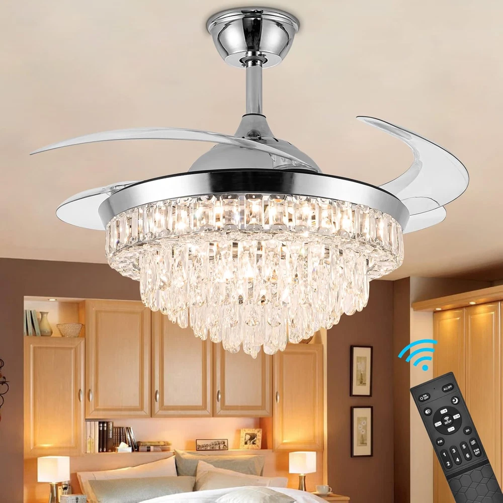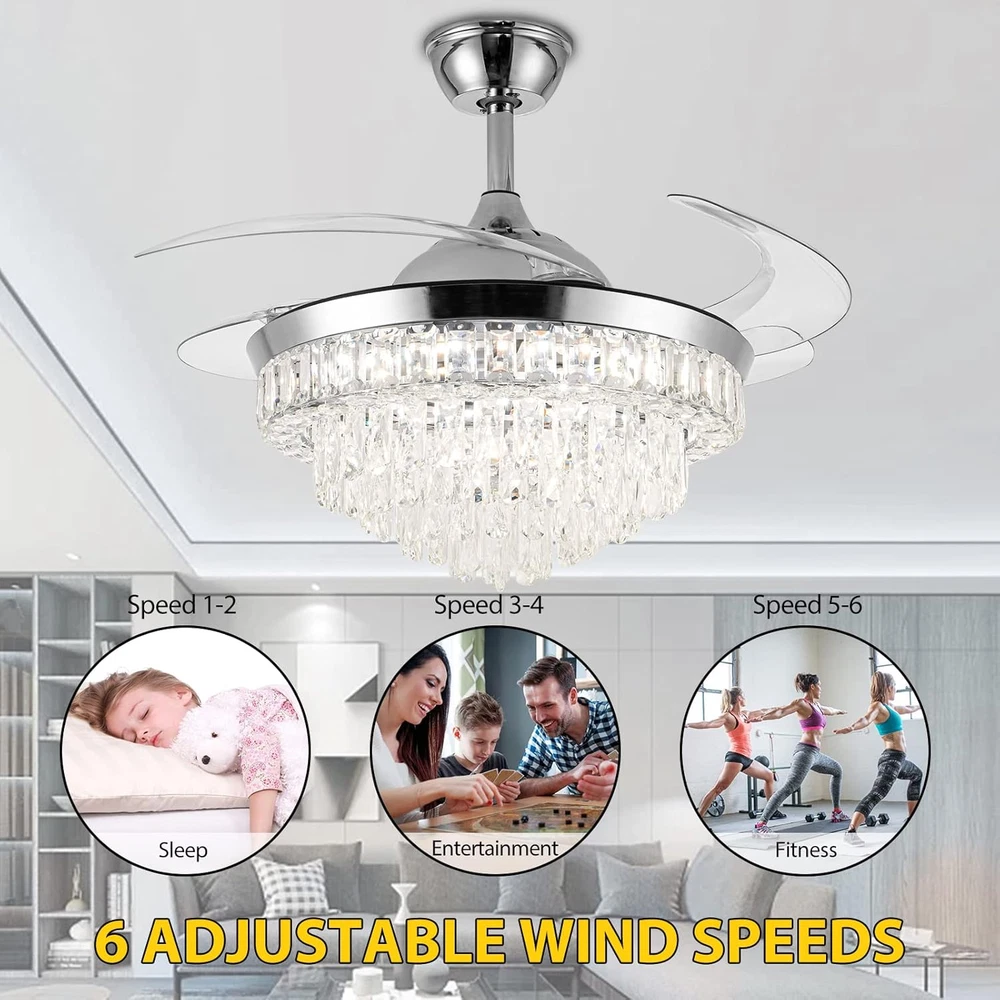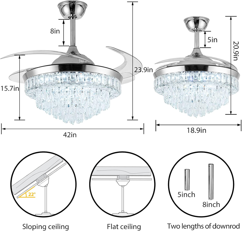 Store New Arrivals Add to Favorite View Feedback Contact Crystal Ceiling Fan with Light,42Inch Luxury Chandelier, Modern Stepless Dimmable Chandelier Ceiling Fan 6 Speed Indoor Fandelier Retractable Blade for Bedroom Living Room Dining Room Description Light Source Type LED Item model number 23 Style Modern Number of Items 1 Power Source Corded Electric Number of Light Sources 1 Control Method Remote Embellishment Crystal Batteries Included? No Lighting Method Remote Controller Type Remote Control Unit Count 1.0 Count Room Type Bedroom, Living Room, Dining Room Finish Chrome Finish Assembly Required Yes Installation Type Semi Flush Mount Material Metal Efficiency energy efficient Switch Type Remote Model Name Ceiling Fans Finish Type Chrome Finish Specific Uses For Product Home Included Components Remote Item Package Quantity 1 Indoor/Outdoor Usage Indoor Brightness Adjustable (10% to 100%) Country of Origin China Light Color Cool White, Nature White, Warm White Water Resistance Level Not Water Resistant Batteries Required? No Item Weight 24.6 pounds Light fixture form Ceiling Special Features Remote Controlled Special Feature Remote Controlled Bulb Base E26 Medium Shade Color silver Mounting Type Ceiling Mount Color Silver4 Wattage 36 watts Voltage 110 Volts Plug Format A- US style Recommended Uses For Product Remote control, Retractable fan blades,Color temperature changes & adjustable,Brightness dimmable,6 fan speed, Reversable blades,Timer, Silent motor Shade Material Metal Fixture Type Non Removable Size 42Inch Product Dimensions 42"L x 42"W x 23.9"H Number Of Pieces 1 【Unique Crystal Ceiling Fan with Light】It's the perfect combination with a crystal ceiling fan and chandelier light.42-inch silver chandelier fan with top k9 round crystal, acrylic clear retractable blades*4, metal lamp body. A variety of decoration styles can be a perfect match. Crystal ceiling fan with natural soft wind provides a healthy and super quiet living environment for family 【Two Rotation Modes and 6 Speed】chandelier fan provides 6-Gear fan speed. Reversible fan blades keep your room cooler in summer and improve indoor air circulation in winter 【Dimmable Brightness and Adjustable Color Temperature】Dimmable light brightness from 10% to 100%, and color temperature can be gradually adjusted from 3000K to 6000K(warm white, nature white, cool white). The chandelier ceiling fan also has a timer function (2h automatically turns off). All functions can be controlled by remote control 【Retractable and Reversible Fan Blades】The acrylic invisible blades will automatically extend/retract when the crystal fandelier is turned on/off. Diameter 42" when extended and 20" when closed 【Customer Service】The appearance of the fandelier is exquisite, Suitable for Indoor living rooms, bedrooms, dining rooms, corridors, etc. The fan needs basic assembly skills, a professional would be highly recommended. Any questions, please leave us a message, and we will handle it immediately Notice: Only ceiling fans with light controlled by a remote have memory function( It means, you set up natural lights by remote control before you turn off the light. and when you open it again, you will get the same natural lights) Product Description Color Temperature Dimmable (3000K-6000k) Light Wattage 36W Voltage 110V Dimensions 42 Inch, 4 Retractable Blades Brightness Adjustable(10%-100%) Applicable area 100-300 sq.ft. Timing Function 2hours automatically close Light Source Type LED(Light Kit Included) ABOUT US We offer the best prices around on high quality products. Our E-store includes media such as books, movies, music and games while offering electronics, toys, sporting apparel, clothing, tools, general home, garden items and more. SHIPPING We are always working hard to ensure your package arrives as soon as possible. Please understand that some factors like weather, high postal traffic, and the performance of shipping companies are outside of our control. We offer free shipping to the lower 48 states and ship within 2 business days of payment, usually sooner. We do not accept P.O. Boxes. Please provide a physical address. For shipping outside of the continental USA, we only use eBay's Global Shipping Program.The item is shipped to KY and then sent to the rest of the world. International customers are responsible for all duties and taxes. Continue to check out in order to calculate costs for shipping the item to your country. Messages regarding eBay's Global Shipping Program MUST be directed at eBay EXCLUSIVELY. RETURNS We offer a 30-Day Return Policy on items which you are not completely satisfied with. You have the option for a full-refund or an exchange of the item. No returns are available on items shipped outside of the USA. PAYMENT We accept PayPal. CONTACT US This page content is yet to come Please ad us to your favorite seller and visit again later Thank You CUSTOMER SATISFACTION We try our very best to make sure every customer is completely satisfied. If there's a problem, message us! We're happy to help. WE ACCEPT Copyright © 2021 AutoDS. | All Rights Reserved