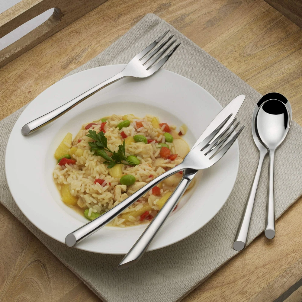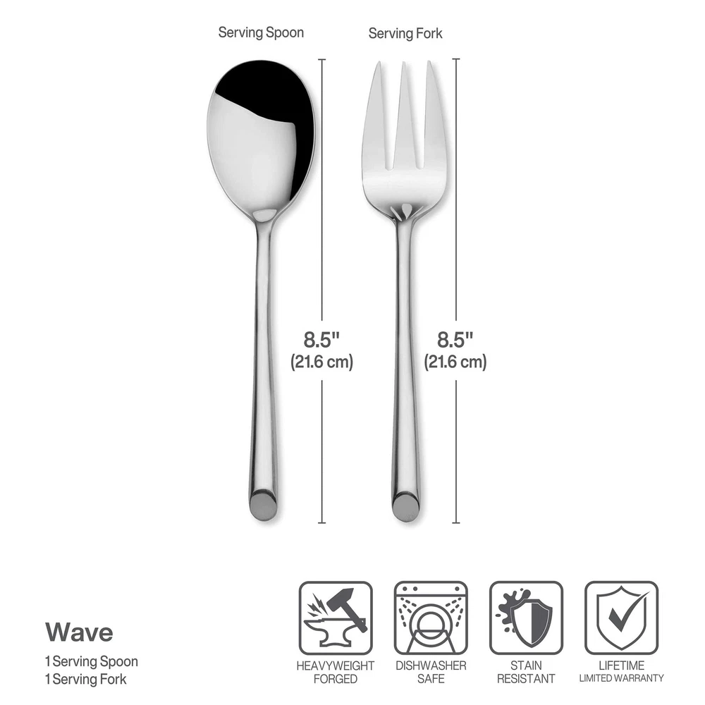 This Wave flatware is produced from heat-treated steel to create a heavier gauge with superior definition. This flatware set is crafted from superior 18/0 stainless steel, with a mirror-finish. Features a contemporary rounded handle with bias cut base giving your table setting a modern look. This 42 piece set, service for eight includes (8) each: dinner fork, salad fork, dinner knife, dinner spoon and teaspoon. Also included in a large serving spoon and large cold meat fork. Dishwasher safe. High Quality Stainless Steel: Crafted from food-grade stainless steel, this flatware set is durable and resistant to corrosion. The high-quality stainless steel ensures long-lasting performance, making it ideal for daily use and resistant to tarnishing or rusting over time. Additionally, this set is Dishwasher Safe. Classic Sophistication: Embrace the traditional beauty of this silverware set, an essential addition to any kitchen. Whether dining solo or entertaining guests, these utensils elevates the ambiance of any table setting, creating unforgettable moments and cherished gatherings around the dinner table. Uncompromising Strength: Unlike lesser-quality alternatives prone to bending or warping, these utensils maintain their structural integrity over time, promising reliable functionality that surpasses expectations. Rest assured, these heavy-duty utensils are tough and reliable, ready for any dining task. Ergonomic Handling: Embrace the ease of use provided by this set's comfortable design. Whether slicing through tender meats or delicately scooping up sides, the well-balanced distribution and rounded edges of these utensils make them a pleasure to hold. Silverware Set for 8: (8) 8-inch dinner forks, 7-inch salad forks, 9.25-inch serrated dinner knives, 7.5-inch dinner spoons and 6.25-inch teaspoons. Also includes a 2-piece serving set with 1 tablespoon and 1 cold meat fork. This set is indispensable for daily meals, as well as for hosting dinners or parties, making it a versatile dining essential.