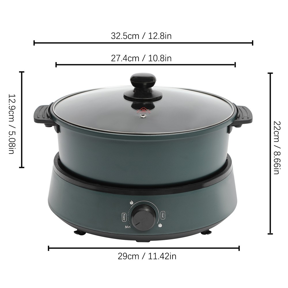Enjoying a Steaming Hot Pot at Home with Friends and Family on a Cold Winter Day Is a Great Pleasure and Happiness. This High-powered and Easy-to-clean Non-stick Electric Hot Pot Is an Excellent Choice for Family/Friends Gatherings, Adding More Fun to Your Leisure Time. It Has Functions of Frying, Boiling, Steaming, Stewing, Baking, Hot Pot, and More, Which Is Also Your Right Hand to Complete Various Cuisines. Large Capacity 4.2QT Multi-Cooke Split Electric Hot Pot Non Stick Fry Soup Stew Description Enjoying a Steaming Hot Pot at Home with Friends and Family on a Cold Winter Day Is a Great Pleasure and Happiness. This High-powered and Easy-to-clean Non-stick Electric Hot Pot Is an Excellent Choice for Family/Friends Gatherings, Adding More Fun to Your Leisure Time. It Has Functions of Frying, Boiling, Steaming, Stewing, Baking, Hot Pot, and More, Which Is Also Your Right Hand to Complete Various Cuisines. Key Features Non-stick Coating : the Non-stick Coating on the Surface of the Cooking Pot and Grill Pan Reduces Food Stickiness , Thus Allowing the Food to Maintain Better Flavor While Reducing Grease and Smoke, Which Is Environmental-friendly and Healthy. and the Smooth Non-stick Coating Is Easy to Clean, Bringing You an Easy-to-use Experience. Spilt Design: with a Split Design, This Product Be Used As a Barbecue Pot, Saucepan, Stockpot, Milk Pot, Steamer, Etc., Which Is Convenient to Meet Different Needs and Easy to Clean/Store. It Is Also the Ideal Choice for Business and Travel. Infinite Temperature Control : Simulating the Regulation of Traditional Gas Stoves, This Product Allows You to Infinite ly Adjust the Temperature from 356-5 36℉ Through the Control Knob to Help You Easily Grasp the Right Temperature and Improve the Taste of Food. Efficient and Even Heating : the Large 1350w Power, Upgraded Iron Heating Tube , and Ring-shaped Aluminum Heating Plate Can Realize Efficient and Uniform Heating, Making Delicious Food for You in a Short Time and Enhancing the Overall Taste and Flavor of the Food. Large Capacity : the 10.79 " Widened Cooking Pot and 10.63*1.18 Inches Grill Pan Give You 4.2qt Capacity to Cook More Food for 1 to 5 People , so Everybody Has an Opportunity to Try out Various Ingredients, As Well As Enjoy Their Favorites . Excellent Heat Dissipation : This Product Adopts Self-circulating Air Ducts on the Bottom to Enhance Internal Heat Dissipation, Thus Reducing the Internal Temperature to Extend the Service Life. Details Anti-scalding Handles : the Anti-scalding Handles on the Cooking Pot, Grill Pan, and Lid Make It Easier for You to Hold and Move, and Also Protect Your Hands. Clear Lid: the Clear Explosion-proof Tempered Glass Lid Is Convenient for You to Check the Food Situation and Make Adjustments in Time to Reduce Food Burning. Its Steam Hole Can Timely Eliminate Excess Steam and Heat, Prevent Spilling, and Maintain Balanced Air Pressure Inside the Pot to Effectively Guarantee Safety During Use Non-slip Feet : the Non-slip Feet at the Bottom Can Avoid Slipping and Scratching the Tabletop. Plug Organizer : the Plug Organizer on the Bottom Effectively Protects the Plug While Convenient Storage. Hidden Dual-display Indicator: the Two Hidden Indicator Lights Allow for an Independent Display of Power and Heating Status, so You Can Get a Clear Indication at a Glance. Round Corners: Compared with Traditional Square Corners, an Arc Design Can Better Take Care of Your Skin. Application It Is Suitable for 1-5 People. It Can Be Widely Used in Families, Parties, Dormitories, Offices, Apartments, Barbecues, Camping, Travel, Business Trips, Snack Bars, Roadside Stalls, Hotels, Shops, Restaurants, Cooking Schools, Etc. to Make Porridge, Pancakes, Grilling Meats, Fried Rice, Vegetables, Simmer, Soup, Cooking, Sauté Steak, Chicken, Noodles, Oatmeals, Eggs, Dumplings, Fishes, Hot Pot, Etc. Specification Model: Tkm-001 Color: Green Material: Abs, Aluminum, Iron, Tempered Glass Surface Treatment: Die-casting, Non-stick Coating Shape: Round Style: Modern Number of Items: 1 Applicable People: 1-5 People Assembly Required: No Mounting Type: Countertop Product Care Instructions: Hand Wash Control Method: Knob Power Source: Corded Electric Plug Standard: Us Standard Voltage: 110v Frequency: 60hz Power: 1350w Capacity: 4l/4.2qt Temperature Range: 180-280℃/356-5 36℉ Power Cord Length: 1m/ 3.28 ft The Total Height of the Cooking Pot and Lid: 12.9cm/5.08inch Cooking Pot Diameter: 27.4cm/10.79inch Grilled Pan Size(D*H): 27*3cm/10.63*1.18inch Product Size: 32.5*22*29cm/12.8*8.66*11.42 Inch Package Size: 34*22*36cm/13.39*8.66*14.17 Inch Net Weight: 3.3kg/7.28 Lbs Gross Weight: 3.7kg/8.16 Lbs Package Included 1* Base with Power Cord 1* Cooking Pot 1* Grill Pan 1* Clear Lid 1* English Manual Other Accessories for Assembly Notes Please Note That the Package Does Not Include Food. Please Note That the Insulation Time Will Vary According to the Climate of Different Regions and the Temperature of Foods. The Heating Plate Is Still Very Hot After Use, Do Not Touch It Before Cooling. and Keep It Away from Children to Prevent Combustion Accidents. Please Do Not Heat the Pan for a Long Time Without Water, Otherwise, It Will Be Damaged. Please Do Not Touch or Move the Product While Working. When the Product Is Working, Sometimes It Is Normal for the Indicator Light to Turn off Because the Dynamic Adjustment of the Temperature Controller Is Triggered. at This Point, the Product Is Exerting Its Insulation Function. Please Wait for 1-3 Minutes, or Rotate the Knob to a Higher Power to Allow the Product to Start Heating Again and the Light Will Light up. In the Initial Few Uses, It Is Normal to Generate Smoke or a Burning Odor on the Heating Plate at High Temperatures, Which Is Caused by the Protective Oil Left on the Spare Parts and Screws. After Several Uses, the Odor Will Gradually Disappear. Please Clean This Product Before First Use. Please Unplug the Power Cord First and Ensure That the Cooking Pot a