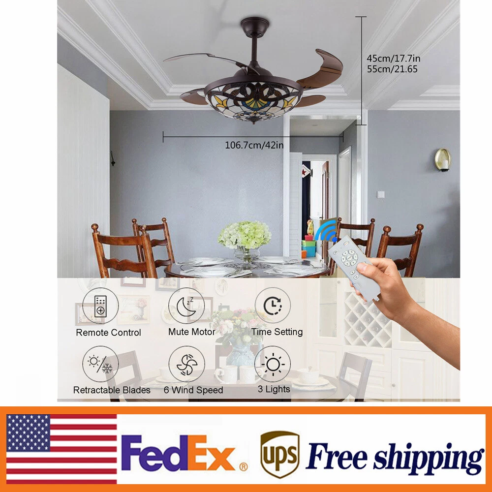 Specification Color temperature: CCT 3 light cycles Light source type: LED(Light Kit Included) Control: Remote Control Included Dimensions: 42 Inch, 4 Retractable Blades Light Wattage: 36W-48W Motor Wattage: 56W Speed: 6 Voltage: DC 110 -240V Average Service Life: 5~10 Years Suitable for rooms of 15-25 square meters. Installation Instructions ♥Please check the dimensions before ordering, just to ensure it is suitable for your room. ♥Ceiling Chandelier Suitable for Flat Roof Concrete Ceiling House, for Gypsum Board and Wood Ceiling, You Need to Buy a Remodeling Bracket; Identify and Connect Electrical Wires; Ceiling height is greater than 110", Lift 110 Pounds. 42"Vintage Ceiling Fan Light Retractable Blade LED Chandelier & Remote Control ♥♥ Welcome to my store ♥♥ 42'' Tiffany Invisible Ceiling Fan w/LED Light Retro Stained Glass LED Chandelier HG-HCX7016-871US Product description ▶ Modern Invisible Fan Chandelier Fan and chandelier combined into one with remote control, automatic telescopic fan blade, LED lamp beads ▶ Modern Fan Light Chandelier 42 inches when the fan is extended, and 19 inches when the fan blade is retracted. Includes two lower bars, one for 4.8inches and the other for 9.8inches, you can choose one to install. ▶ Bedroom Ceiling Fans Material Metal body +Glass lamp cover + ABS retractable blades + pure copper motor(providing powerful air flow, quiet and durable. With vents, it can reduce the internal temperature of the main unit and extend the life of the motor. ▶ Pure Copper Mute Motor Quiet motor, create a comfortable space. Safe and Energy saving, long used life, strong power, Unique design Modern style. ▶ Energy Saving and Durable A combination of classic and innovative technology, new LED light source, life expectancy up to 50,000 hours, replaceable LED driver for convenient and durable use. ▶ Multi-Function Setting All operations can be controlled by the remote control, adjust the lighting switch of the ceiling fan (white light - warm light - yellow light), wind speed (low - medium - high), The fan or illumination can be turned on separately. ▶ Fandeliers with Remote The ceiling fan has 6 variable speeds and natural wind function. Two Fans Modes: Forward and reverse mode. Freely change the direction from downdraft mode during the summer to updraft mode during the winter. This retractable fan will keep you to stay comfortable throughout the year. ▶ Wide Application Mount Ceiling Fan with Light is perfect for cafes, restaurants, bedrooms, living rooms, children's rooms, kitchens, hotels, apartments, offices, corridors, shops, etc. Color temperature: CCT 3 light cycles Light source type: LED(Light Kit Included) Control: Remote Control Included Dimensions: 42 Inch, 4 Retractable Blades Light Wattage: 36W-48W Motor Wattage: 56W Speed: 6 Voltage: DC 110 -240V Average Service Life: 5~10 Years Suitable for rooms of 15-25 square meters. Installation Instructions ♥ Please check the dimensions before ordering, just to ensure it is suitable for your room. ♥ Ceiling Chandelier Suitable for Flat Roof Concrete Ceiling House, for Gypsum Board and Wood Ceiling, You Need to Buy a Remodeling Bracket; Identify and Connect Electrical Wires; Ceiling height is greater than 110", Lift 110 Pounds. What you get Ceiling fan x 1 Screws sets x 1 Down rods x 2 (12CM & 25CM) Remote control x 1 Instruction Manual x 1 Suggestion Note: The Fan is Reversible. 1️⃣For a safe and secure installation, please ensure that the electrical box to which this fixture will be mounted is properly attached to a structural member of the building. 2️⃣All wires are connected. When unpacking, be careful not to pull with wires as a bad connection may result. 3️⃣Do not connect electricity until your fixture is fully assembled. Dear Customer, Thank you very much for your orders. I'mpleased that you entrusted us as your supplier foryour project and am grateful that you continue toput your faith in our services. I hope our productsmet your expectations. As always, we are happy to support you with anyfuture projects you may undertake. I wish you thebest with your current project and look forward toseeing the outcome. Thank you again, and I lookforward to working with you in the future . Best regards. Payment Delivery details Terms of sales About us Contact us Payment We accept ebay payment 。 Fees such as import duties, taxes are not included in the item price or shipping costs. These charges are the buyer's responsibility. Delivery details Shipping: 2-9 working days to: USA Terms of sales We maintain high standards of excellence and strive for hundred percent customer satisfaction. Feedback is very important to us. We hope that you contact us immediately before you give neutral or negative feedback, so that we can address your concerns. It is impossible to address issues if we do not know about them! About us Your satis faction is our ultimate goal. We work hard to earn your trust and future business. Our certified technicians have tested each item before shipping. The unit comes with 1 year limited warranty on all manufacturing defects. a) If you receive a defective item, you may return it or ask for a discount. Please contact us within 14 days after you receive the package. b) What you returned must be intact and in its original packaging as re? u. Customer is responsible for shipping costs of the returned item. c) We will cover the cost of shipping back t with the shipping rate indicated in the registration page. We will send you a new unit or refund the full payment you paid. Thank you. Contact us Business Hour Business Hour: Monday To Friday: 8:30 AM to 5:00 PM (Beijing China time) Due to time zones, our reply to your questions may not be immediately. But within above working time, we will reply your email within 24 hours. If it's non-workdays, please kindly be patient and wait till Monday. Please contact us with ebay message. Please feel free to contact us if you have any