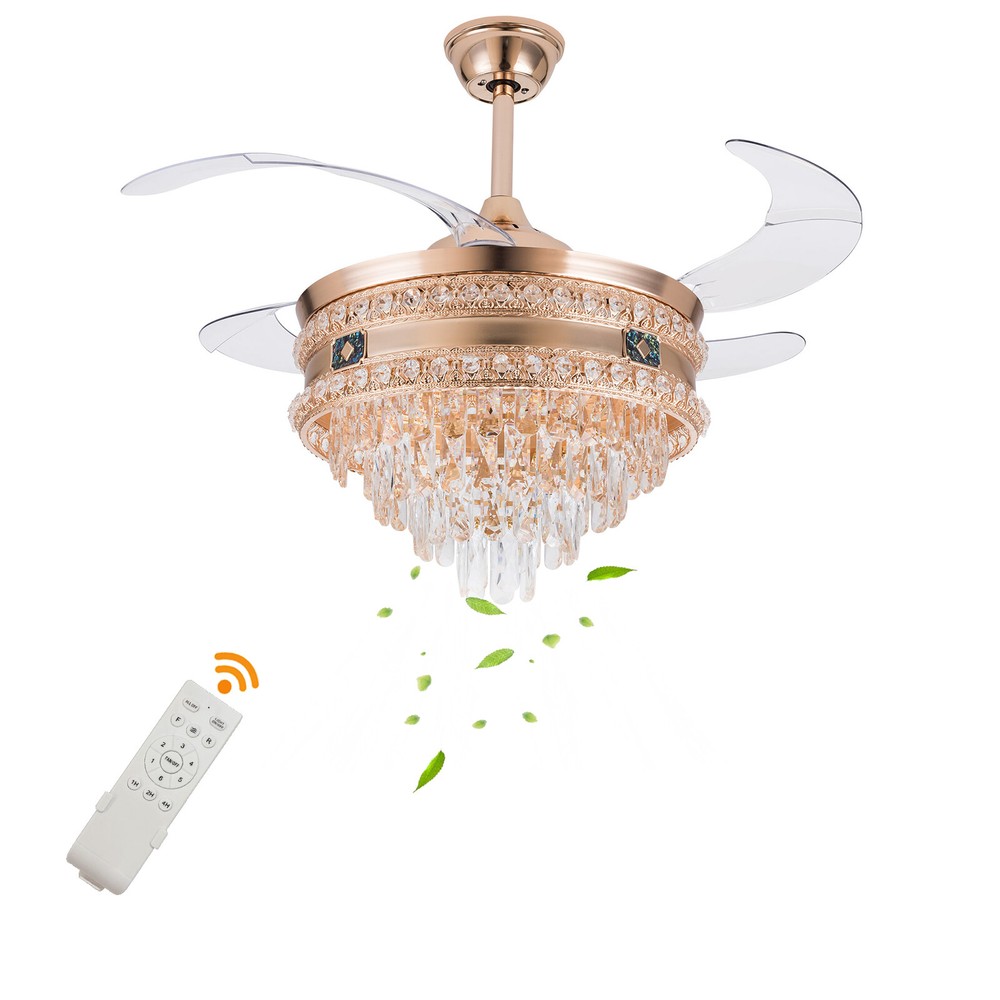 Specification Material: Aluminum, Acrylic, Glass Process: Polishing Color: Gold Style: Modern Shape: Circular Assembly Required: Yes Indoor/Outdoor Use: Indoor Light Fixture Form: Chandelier Installation Type: Ceiling Mount Light Source Type: LED (Included) Light Color: Cold, Neutral, Warm Motor Type: Pure Copper Motor Timing: 1/2/4 Hours Wind Speed: 6 Voltage: 85-265V Power: 45W Noise: 35 dB Lumen: 180lm Battery Type: 2 * AAA Batteries (Included) Color Temperature: 3000-4500-6000K Applicable Room Height: 2.8m/9.19ft Lighting Area: 15-20m²/ 161.46-215.28ft² Remote Control Distance: 3-5m/9.84-16.4ft Pole Length: 10cm/3.93in, 20cm/7.87in Overall Height: 50cm/19.68in, 60cm/23.62in Lampshade Size (D*H): 46*30cm/18.11*18.81in Base Diameter: 15cm/5.91in 42in Dimmable LED Ceiling Fan Light Foldable Fan Blades Fan Lamp w/Remote Gold Description Let's add a fresh breeze to the dull room! Our ceiling fan light uses a pure copper motor, and the adjustable wind speed can quietly help air circulation. You can control the fan speed and time-setting through the remote control, which is smart and convenient. Generous crystal pendants and an exquisite lampshade can also add luxury to your room. Key Features High-quality Material: It is made of aluminum, glass, and acrylic, which is durable and safe, and has strong resistance to corrosion, high temperature, and shock. Magnificent Appearance: The luxurious and elegant golden bracket and sparkling crystal decorations make the light cast a fascinating effect of light and shadow, adding a luxurious atmosphere to your home. Excellent Light Source: The LED light source provides more stable and even lighting. The three light colors (warm, neutral, and cold) with a color temperature range of 3000K, 4500K and 6000K , which can fully meet your usage needs in different scenarios, making it more convenient. Smart Control: The timing function(1/2/4H), 6-speed wind speeds, and reverse function can be adjusted through the remote control, which can simplify your daily routine and enhance your overall living experience. High Safety: The semi-open lampshade and the heat dissipation holes on the top of the fan ensure quick heat dissipation during use, protecting the circuit from short circuits or open circuits caused by overheating, making your use safer. Reversible Function: In addition to enjoying a cool environment in summer, you can also reverse the direction of the fan in winter, blowing hot air into the room from the top and increasing the room temperature. Adjustable Height: You can choose between 3.93-inch and 7.87-inch lamp poles to accommodate rooms of different heights. Exquisite Gift: With good performance and a modern appearance, it can be used as a housewarming gift for parents, friends, and lovers so that they can also enjoy a more exquisite life. Details Foldable Fan Blades: When the fan function is not in use, the fan blades will automatically fold up to prevent dust accumulation while ensuring a beautiful decoration effect. Stable Base: The 5.91" thickened and enlarged base ensures stronger load-bearing capacity and stability. Application With a lighting area of 161.46-215.28ft ², this product is suitable for rooms with a height of 9.19 feet, such as the living room, bedroom, study room, office, cafe, restaurant, hotel, foyer, and other places. Specification Material: Aluminum, Acrylic, Glass Process: Polishing Color: Gold Style: Modern Shape: Circular Assembly Required: Yes Indoor/Outdoor Use: Indoor Light Fixture Form: Chandelier Installation Type: Ceiling Mount Light Source Type: LED (Included) Light Color: Cold, Neutral, Warm Motor Type: Pure Copper Motor Timing: 1/2/4 Hours Wind Speed: 6 Voltage: 85-265V Power: 45W Noise: 35 dB Lumen: 180lm Battery Type: 2 * AAA Batteries (Included) Color Temperature: 3000-4500-6000K Applicable Room Height: 2.8m/9.19ft Lighting Area: 15-20m²/ 161.46-215.28ft² Remote Control Distance: 3-5m/9.84-16.4ft Pole Length: 10cm/3.93in, 20cm/7.87in Overall Height: 50cm/19.68in, 60cm/23.62in Lampshade Size (D*H): 46*30cm/18.11*18.81in Base Diameter: 15cm/5.91in Fan Diameter: 107cm/42in Package Included 1*Ceiling Fan Light 1*Remote Controller 1*English Manual Other Accessories for Assembly Notes Please make sure that the size of the ceiling fan matches your room and carefully make a choice. Normally, the expansion screw will blow up after the force is applied. Please make sure the power is cut off before installation and when you clean the light. It cannot be installed on a sloped ceiling. The surface of the product and the electric wire should avoid scratching when mounting, and electric insulation gloves (not included) must be worn when installing. To ensure your safety, professional ones with an electric license are recommended to carry out the installation if possible. The wall control (not included) can only control lights, not ceiling fans. Please allow the slight color difference caused by the shooting light and 1-3cm error due to manual measurement, and make sure you do not mind before ordering. Payment Delivery details Terms of sales About us Contact us Payment We accept ebay payment 。 Fees such as import duties, taxes are not included in the item price or shipping costs. These charges are the buyer's responsibility. Delivery details Shipping: 2-9 working days to: USA Terms of sales We maintain high standards of excellence and strive for hundred percent customer satisfaction. Feedback is very important to us. We hope that you contact us immediately before you give neutral or negative feedback, so that we can address your concerns. It is impossible to address issues if we do not know about them! About us Your satis faction is our ultimate goal. We work hard to earn your trust and future business. Our certified technicians have tested each item before shipping. The unit comes with 1 year limited warranty on all manufacturing defects. a) If you receive a defective item, you may return it or ask for a discount. Please 