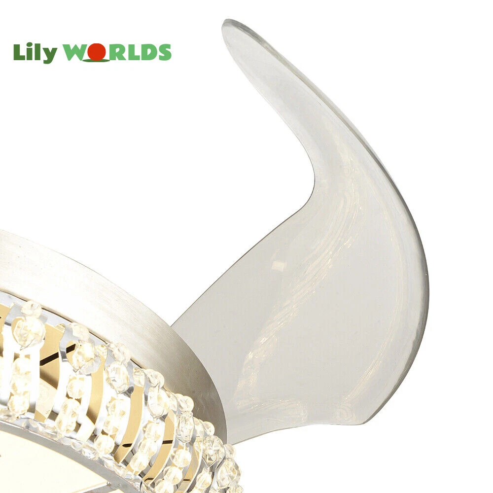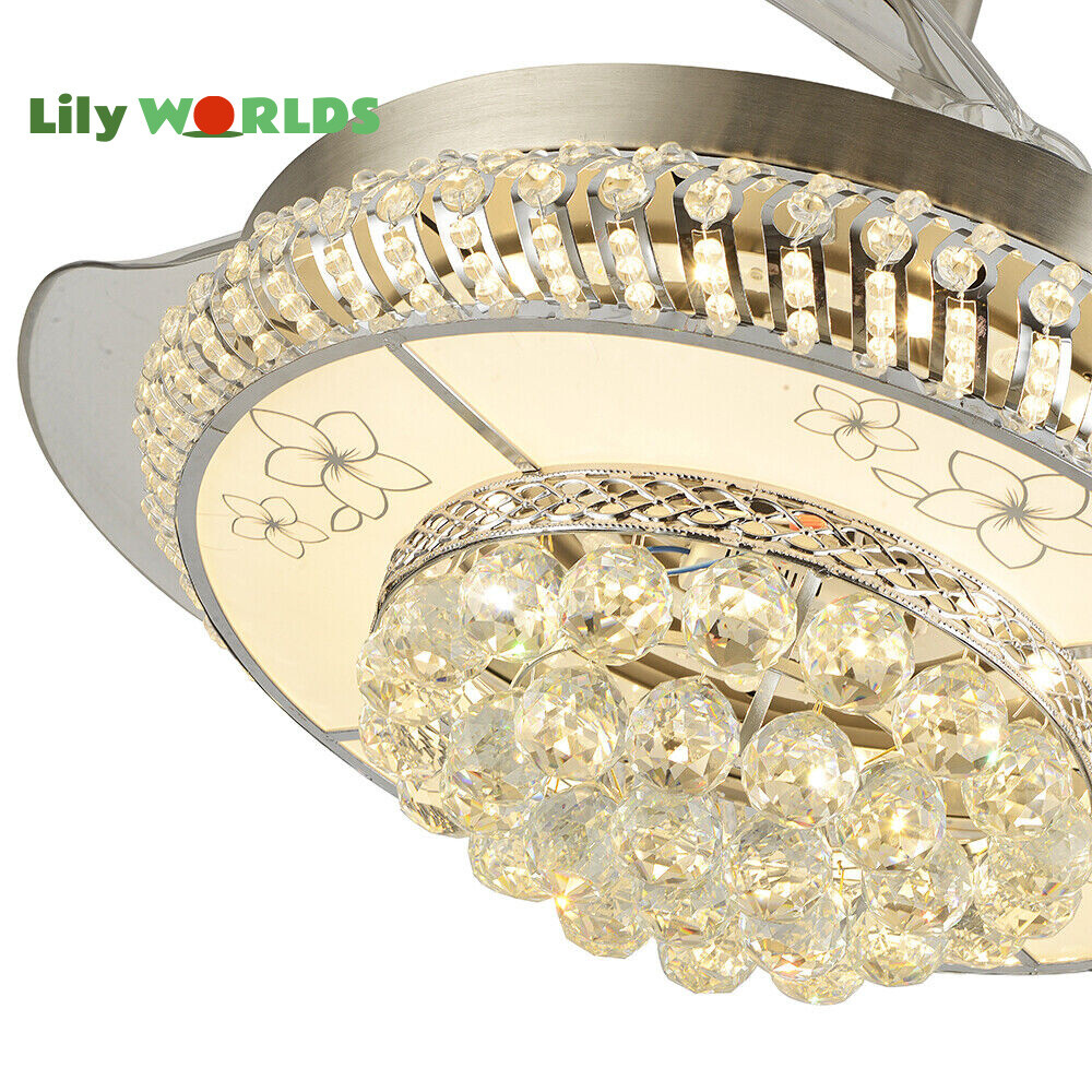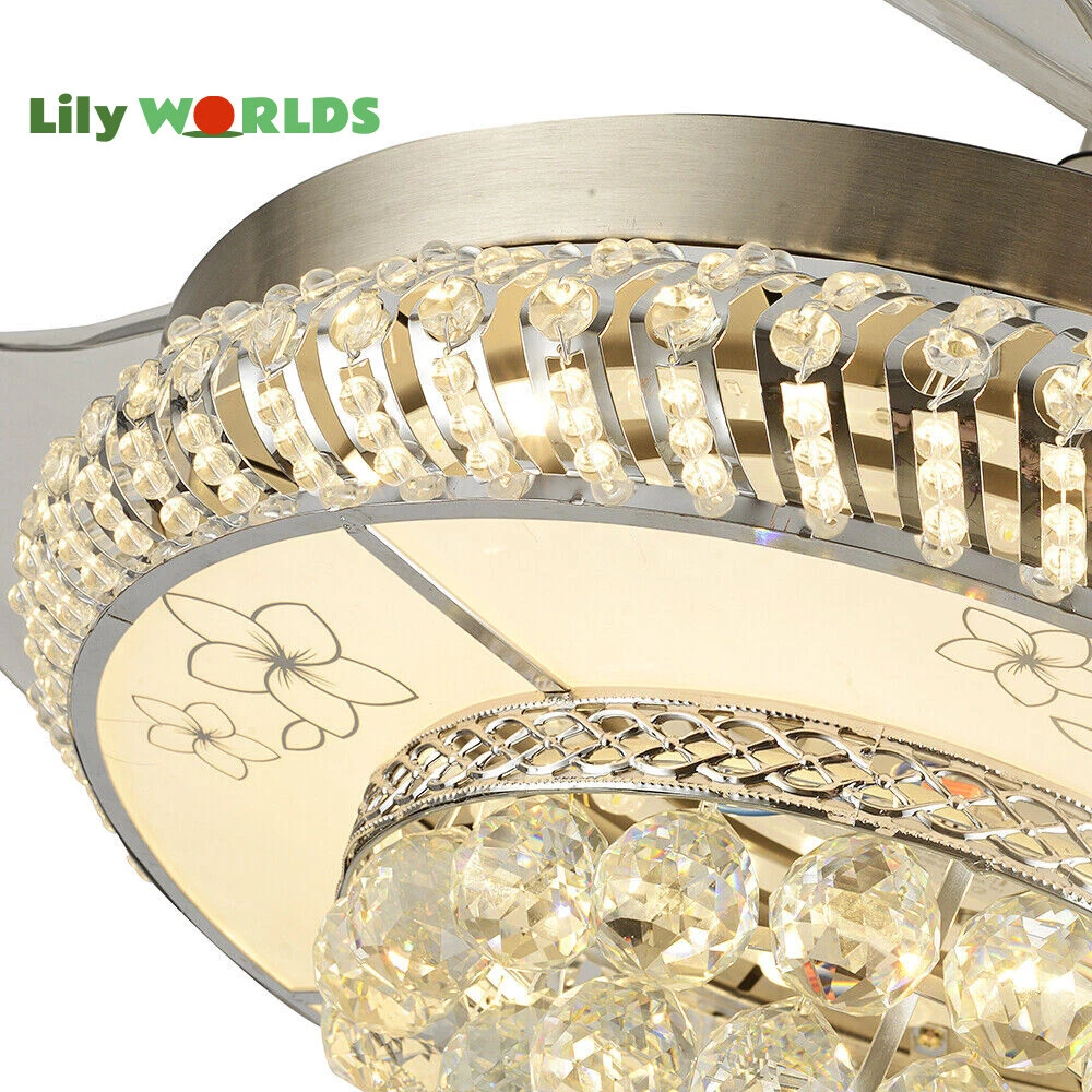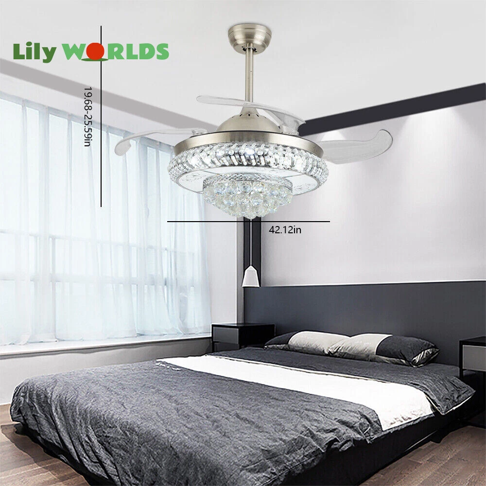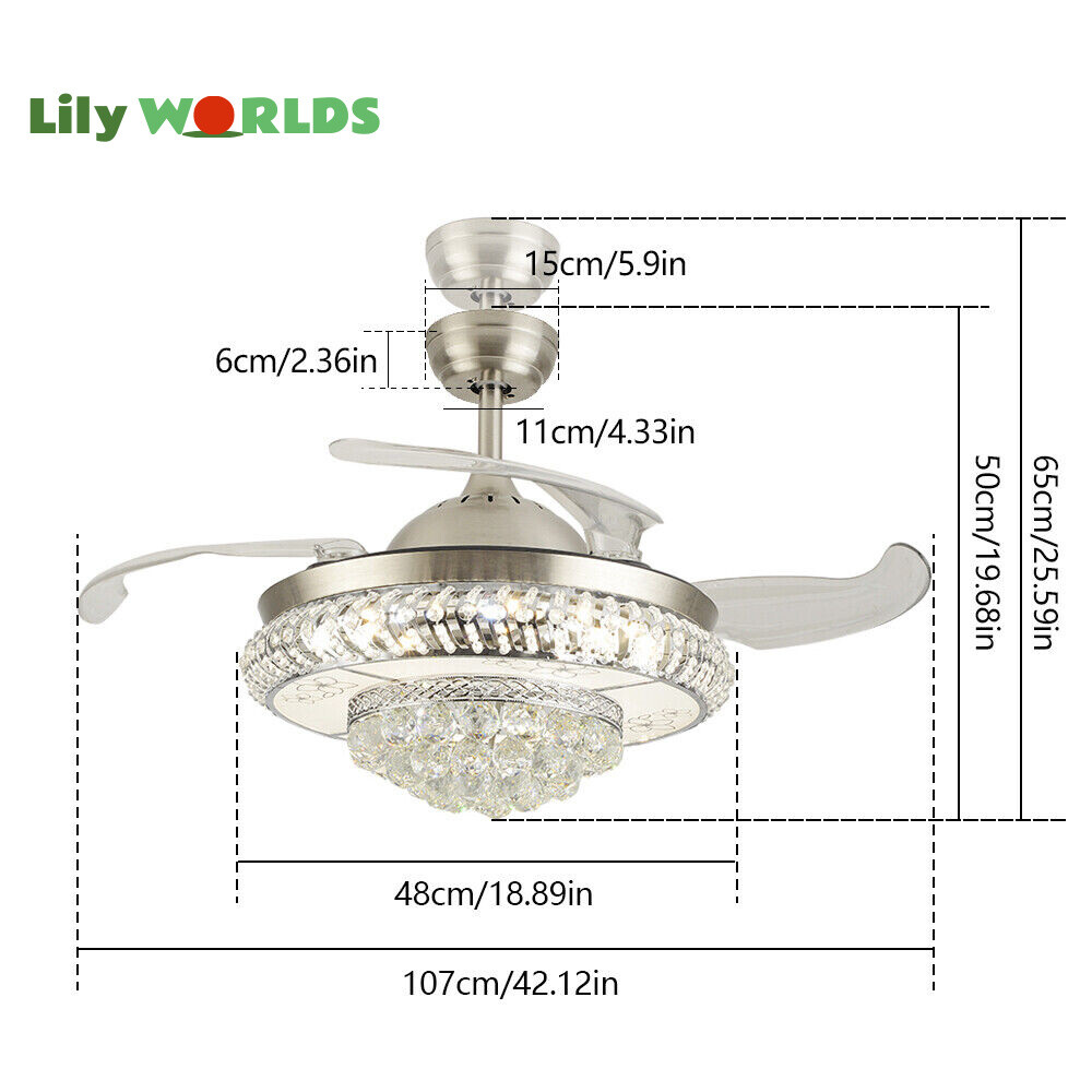 42in LED Crystal Chandelier Invisible Ceiling Fan Light Retractable Blade&Remote Welcome to our store! 42'' Invisible Ceiling Fan Light LED Crystal Chandelier Retractable Blades With RC Description A beautiful house needs a lamp that is very suitable for it. A family needs warm lighting to create an atmosphere at dinner. Light up a lamp, warm the family, you deserve the best. This crystal ceiling fan with light is designed to be elegant and light, and the style is versatile. It has a quiet fan, which allows you to enjoy deep sleep. At the same time comfortable eye protection. Soft light and bright. It is your best choice. Key Highlightss Remote Control: This item is equipped with remote control, so you don't have to stand up to change the three lights, three wind speeds or timer settings at will. This will bring a lot of convenience to your life. Timing Device: This crystal ceiling fan with light can be timed for 1 hour, 3 hours, or 6 hours with a single button. If you often forget to turn off the power, you don't have to worry about wasting electricity with this product. Great Durability: The entire light is made of copper, ABS Blade, and K9 Crystal. Under normal use, the product has a lifespan of 5-10 years or longer. Compared with ordinary lights, this crystal ceiling fan with light is more durable and you can buy it without comprehension. Wide Range: The item's lights and fans can serve an area of ten to twenty square meters. So even if your room is as big as 20 square meters, you don't have to worry about the lights being too dim or not blowing the wind. Crystal Design: You will be stunning when the lights are on, which will give your room a sense of luxury. Adjustable Total Height: The length of this crystal ceiling fan with light is 15 inches (38 cm) / 21 inches (53 cm). You can choose the right length of the pole according to your needs. Diverse Functions : With ABS blades, this crystal ceiling fan with light can be used as an electric fan and also for lighting. It can be multi-purpose and has superb cost performance. High-quality Service : We also provide you with high-quality pre-sales and after-sales services for free. If you have any problem with using it, please feel free to contact us and we will try our best to help you. Specfications 4 Retractable Acrylic Ceiling Fan Blades: This item contains 4 retractable acrylic ceiling fan blades, a material with crystal-like transparency, high surface hardness, and surface gloss. In addition, it will automatically retract and fit into the room when closed, which is a great home decoration. Fans and lights in One : This design is a great space saver while Highlightsing a sense of sophistication. ABS Blades: This material Highlightss high strength and the ABS fluid resistance is low, which makes it a low energy consumption. It is beautiful, thin, light, and durable to use. Applications This crystal ceiling fan with light is ideal for the living room, dining room, foyer, cottage, bedroom, dining room, study, and other places as a decorative lighting fixture. Specfication Light: 3 Colors (neutral white72W, warm white36W, pure white36W) Wind Speed: 3 Wind Speed (high / medium / low) Voltage: 110V Style: Modern/Luxury Switching Power Supply: Remote Control Material: Metal + ABS Blade + K9 Crystal Product Type: Crystal LED Invisible Fan Light Light Source: LED Color: Chrome Silver Switch: Remote Control Motor Material: Copper Number of Blades: 4 Diameter:42inch /107cm(blades unfolded) Long Downrod Length: 9.8" (25 cm) Short Downrod Length: 3.9" (10 cm) Total Height: 19.6" (50cm)/ 25.5" (65cm) Illuminated area: 10-25㎡/107.64-269.1ft² Installation 1. Fixed the bracket on the ceiling. 2. Install the lamp holder, and follow the correct wiring steps. (Tips: Make Sure to Cut Off the Power Supply). 3. Fixed the lamp plate on the bracket. 4. Hang the hollow metal lampshade on the lamp plate. Package Included 1* Ceiling Fan with Light 1* Remote 1* English Manual All Accessories for Assembly Notes 1. Always turn off the power before installing, servicing, repairing. 2. Be sure to securely tighten the wiring studs to prevent loosening or leakage. 3. To avoid the danger of heights, choosing a solid installation surface will be better. 4. The boom has two lengths for choosing, depending on your actual situation. 5. Floor height is greater than 102 inches, ceiling load is greater than 30kg. 6. This chandelier requires a basic simple installation (highly recommended by professional electricians). If you have any questions, please contact us. We are happy to serve you. 7. Please allow slight color difference due to shooting light, and 1-3mm error due to manual measurement, please make sure you don't mind before ordering. Dear Customer, Thank you very much for your orders. I'mpleased that you entrusted us as your supplier foryour project and am grateful that you continue toput your faith in our services. I hope our productsmet your expectations. As always, we are happy to support you with anyfuture projects you may undertake. I wish you thebest with your current project and look forward toseeing the outcome. Thank you again, and I lookforward to working with you in the future . Best regards. Payment Delivery details Terms of sales About us Contact us Payment We accept ebay payment 。 Fees such as import duties, taxes are not included in the item price or shipping costs. These charges are the buyer's responsibility. Delivery details Shipping: 2-9 working days to: USA Terms of sales We maintain high standards of excellence and strive for hundred percent customer satisfaction. Feedback is very important to us. We hope that you contact us immediately before you give neutral or negative feedback, so that we can address your concerns. It is impossible to address issues if we do not know about them! About us Your satis faction is our ultimate goal. We work hard to earn your trust and future business. Our certified technicians have tested each item before shipp