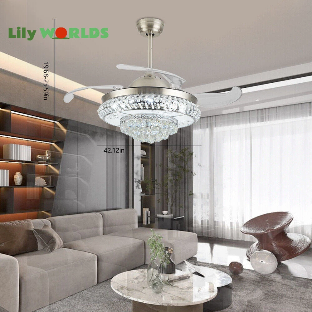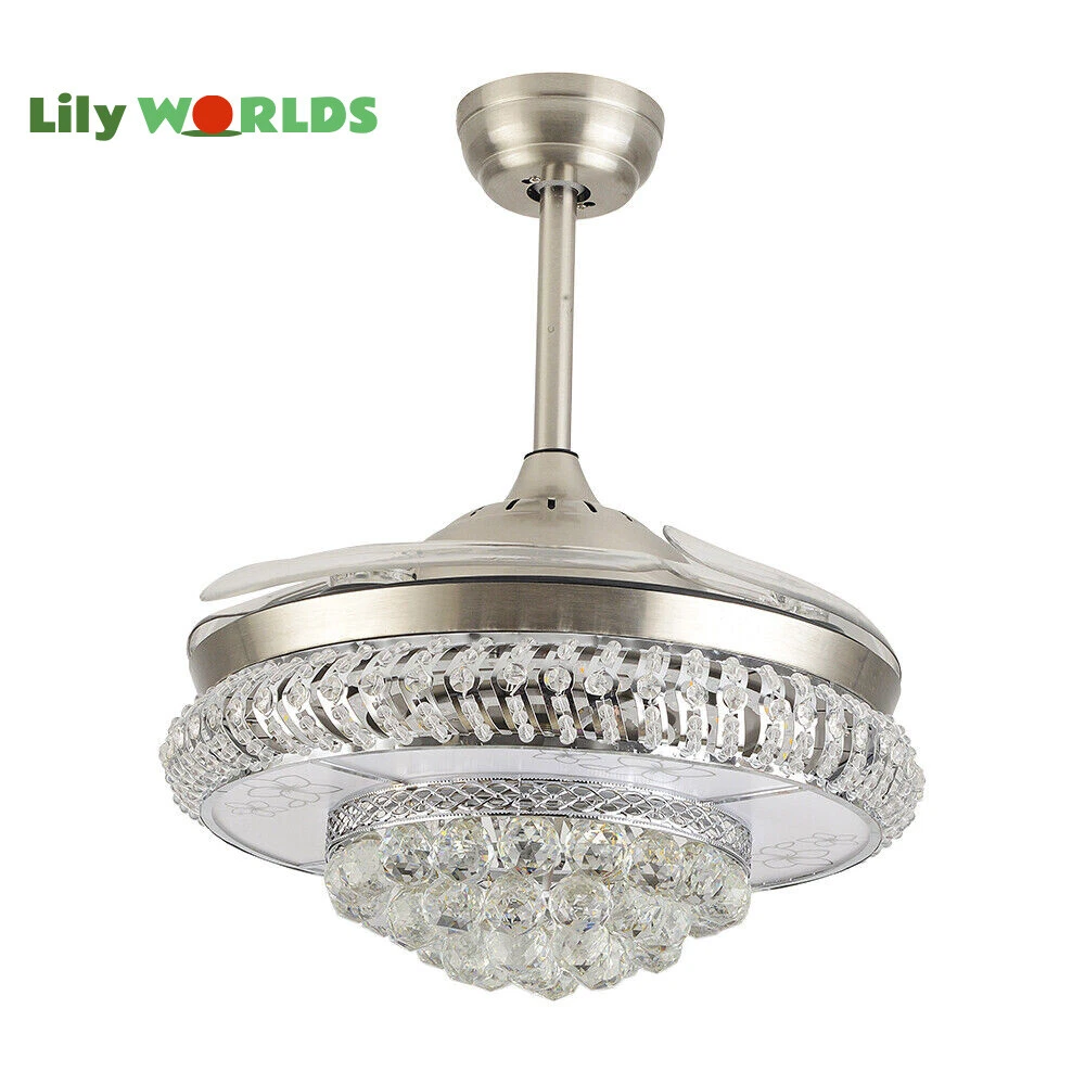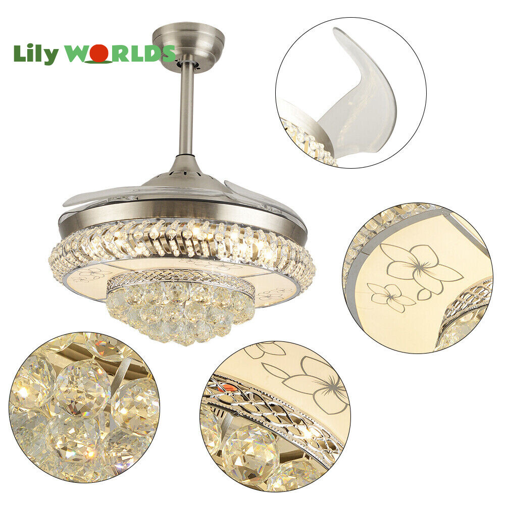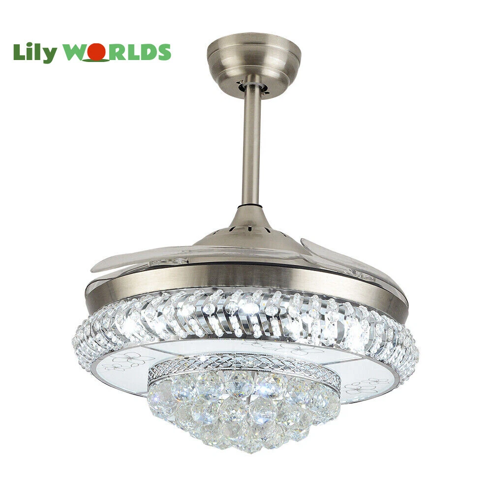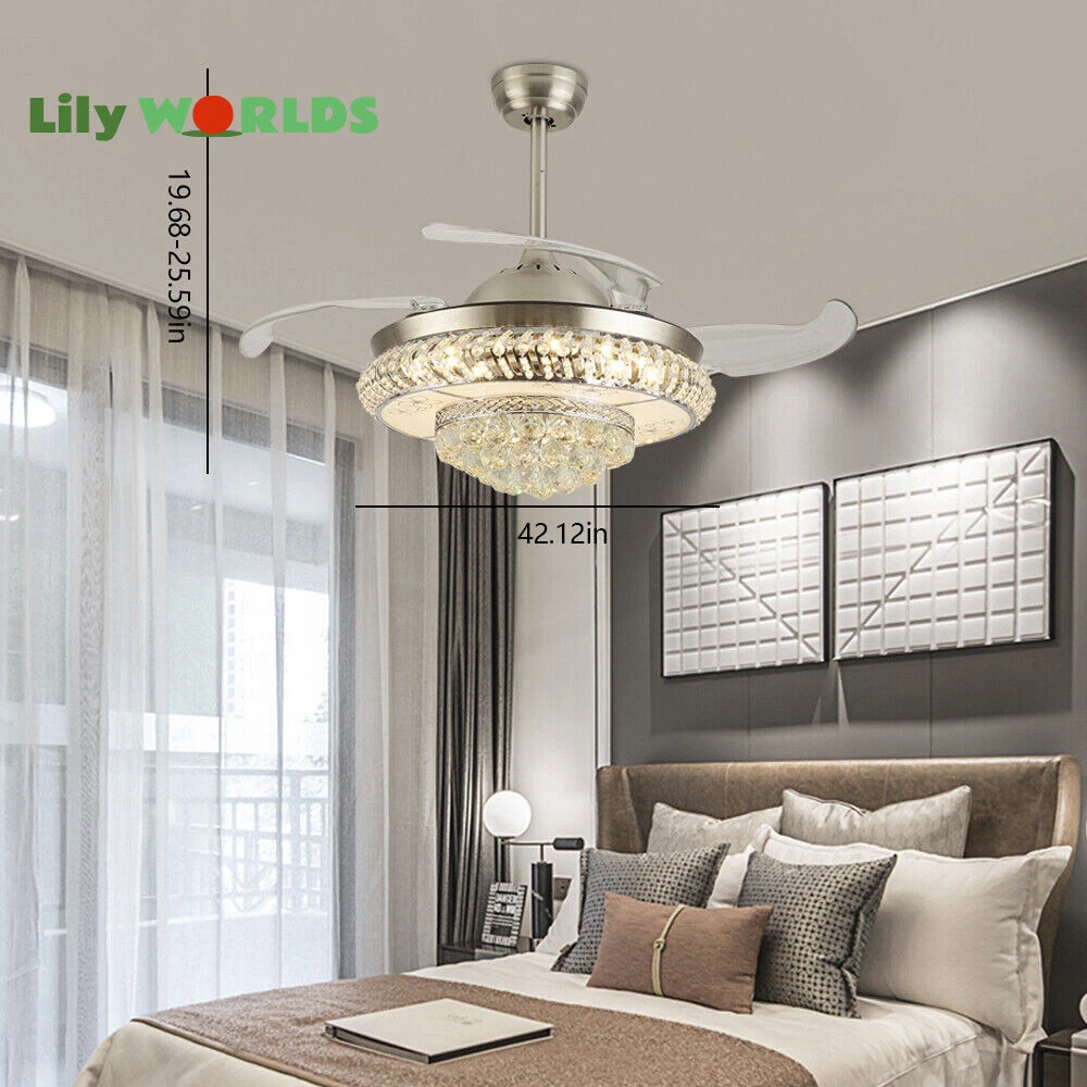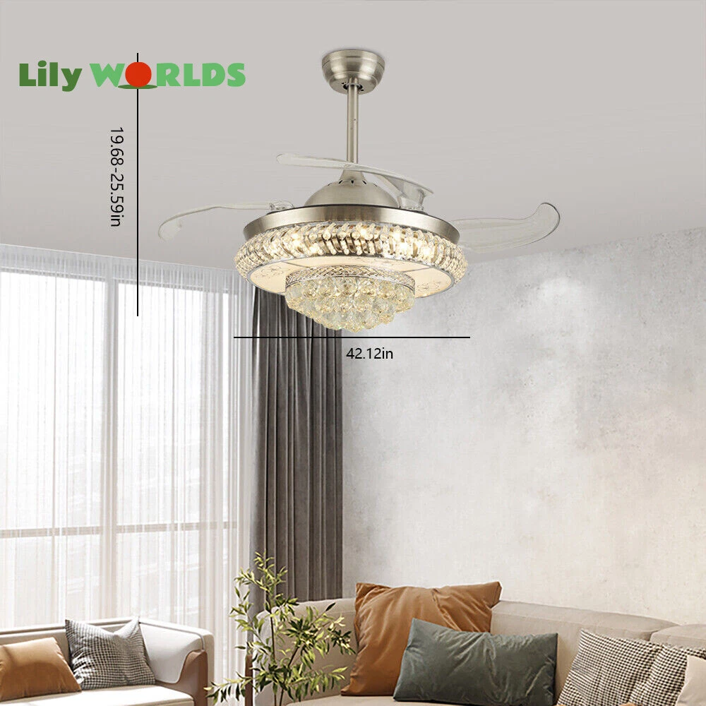 42in LED Crystal Chandelier Invisible Ceiling Fan Light Retractable Blade&Remote Welcome to our store! 42'' Invisible Ceiling Fan Light LED Crystal Chandelier Retractable Blades With RC Description A beautiful house needs a lamp that is very suitable for it. A family needs warm lighting to create an atmosphere at dinner. Light up a lamp, warm the family, you deserve the best. This crystal ceiling fan with light is designed to be elegant and light, and the style is versatile. It has a quiet fan, which allows you to enjoy deep sleep. At the same time comfortable eye protection. Soft light and bright. It is your best choice. Key Highlightss Remote Control: This item is equipped with remote control, so you don't have to stand up to change the three lights, three wind speeds or timer settings at will. This will bring a lot of convenience to your life. Timing Device: This crystal ceiling fan with light can be timed for 1 hour, 3 hours, or 6 hours with a single button. If you often forget to turn off the power, you don't have to worry about wasting electricity with this product. Great Durability: The entire light is made of copper, ABS Blade, and K9 Crystal. Under normal use, the product has a lifespan of 5-10 years or longer. Compared with ordinary lights, this crystal ceiling fan with light is more durable and you can buy it without comprehension. Wide Range: The item's lights and fans can serve an area of ten to twenty square meters. So even if your room is as big as 20 square meters, you don't have to worry about the lights being too dim or not blowing the wind. Crystal Design: You will be stunning when the lights are on, which will give your room a sense of luxury. Adjustable Total Height: The length of this crystal ceiling fan with light is 15 inches (38 cm) / 21 inches (53 cm). You can choose the right length of the pole according to your needs. Diverse Functions : With ABS blades, this crystal ceiling fan with light can be used as an electric fan and also for lighting. It can be multi-purpose and has superb cost performance. High-quality Service : We also provide you with high-quality pre-sales and after-sales services for free. If you have any problem with using it, please feel free to contact us and we will try our best to help you. Specfications 4 Retractable Acrylic Ceiling Fan Blades: This item contains 4 retractable acrylic ceiling fan blades, a material with crystal-like transparency, high surface hardness, and surface gloss. In addition, it will automatically retract and fit into the room when closed, which is a great home decoration. Fans and lights in One : This design is a great space saver while Highlightsing a sense of sophistication. ABS Blades: This material Highlightss high strength and the ABS fluid resistance is low, which makes it a low energy consumption. It is beautiful, thin, light, and durable to use. Applications This crystal ceiling fan with light is ideal for the living room, dining room, foyer, cottage, bedroom, dining room, study, and other places as a decorative lighting fixture. Specfication Light: 3 Colors (neutral white72W, warm white36W, pure white36W) Wind Speed: 3 Wind Speed (high / medium / low) Voltage: 110V Style: Modern/Luxury Switching Power Supply: Remote Control Material: Metal + ABS Blade + K9 Crystal Product Type: Crystal LED Invisible Fan Light Light Source: LED Color: Chrome Silver Switch: Remote Control Motor Material: Copper Number of Blades: 4 Diameter:42inch /107cm(blades unfolded) Long Downrod Length: 9.8" (25 cm) Short Downrod Length: 3.9" (10 cm) Total Height: 19.6" (50cm)/ 25.5" (65cm) Illuminated area: 10-25㎡/107.64-269.1ft² Installation 1. Fixed the bracket on the ceiling. 2. Install the lamp holder, and follow the correct wiring steps. (Tips: Make Sure to Cut Off the Power Supply). 3. Fixed the lamp plate on the bracket. 4. Hang the hollow metal lampshade on the lamp plate. Package Included 1* Ceiling Fan with Light 1* Remote 1* English Manual All Accessories for Assembly Notes 1. Always turn off the power before installing, servicing, repairing. 2. Be sure to securely tighten the wiring studs to prevent loosening or leakage. 3. To avoid the danger of heights, choosing a solid installation surface will be better. 4. The boom has two lengths for choosing, depending on your actual situation. 5. Floor height is greater than 102 inches, ceiling load is greater than 30kg. 6. This chandelier requires a basic simple installation (highly recommended by professional electricians). If you have any questions, please contact us. We are happy to serve you. 7. Please allow slight color difference due to shooting light, and 1-3mm error due to manual measurement, please make sure you don't mind before ordering. Dear Customer, Thank you very much for your orders. I'mpleased that you entrusted us as your supplier foryour project and am grateful that you continue toput your faith in our services. I hope our productsmet your expectations. As always, we are happy to support you with anyfuture projects you may undertake. I wish you thebest with your current project and look forward toseeing the outcome. Thank you again, and I lookforward to working with you in the future . Best regards. Payment Delivery details Terms of sales About us Contact us Payment We accept ebay payment 。 Fees such as import duties, taxes are not included in the item price or shipping costs. These charges are the buyer's responsibility. Delivery details Shipping: 2-9 working days to: USA Terms of sales We maintain high standards of excellence and strive for hundred percent customer satisfaction. Feedback is very important to us. We hope that you contact us immediately before you give neutral or negative feedback, so that we can address your concerns. It is impossible to address issues if we do not know about them! About us Your satis faction is our ultimate goal. We work hard to earn your trust and future business. Our certified technicians have tested each item before shipp