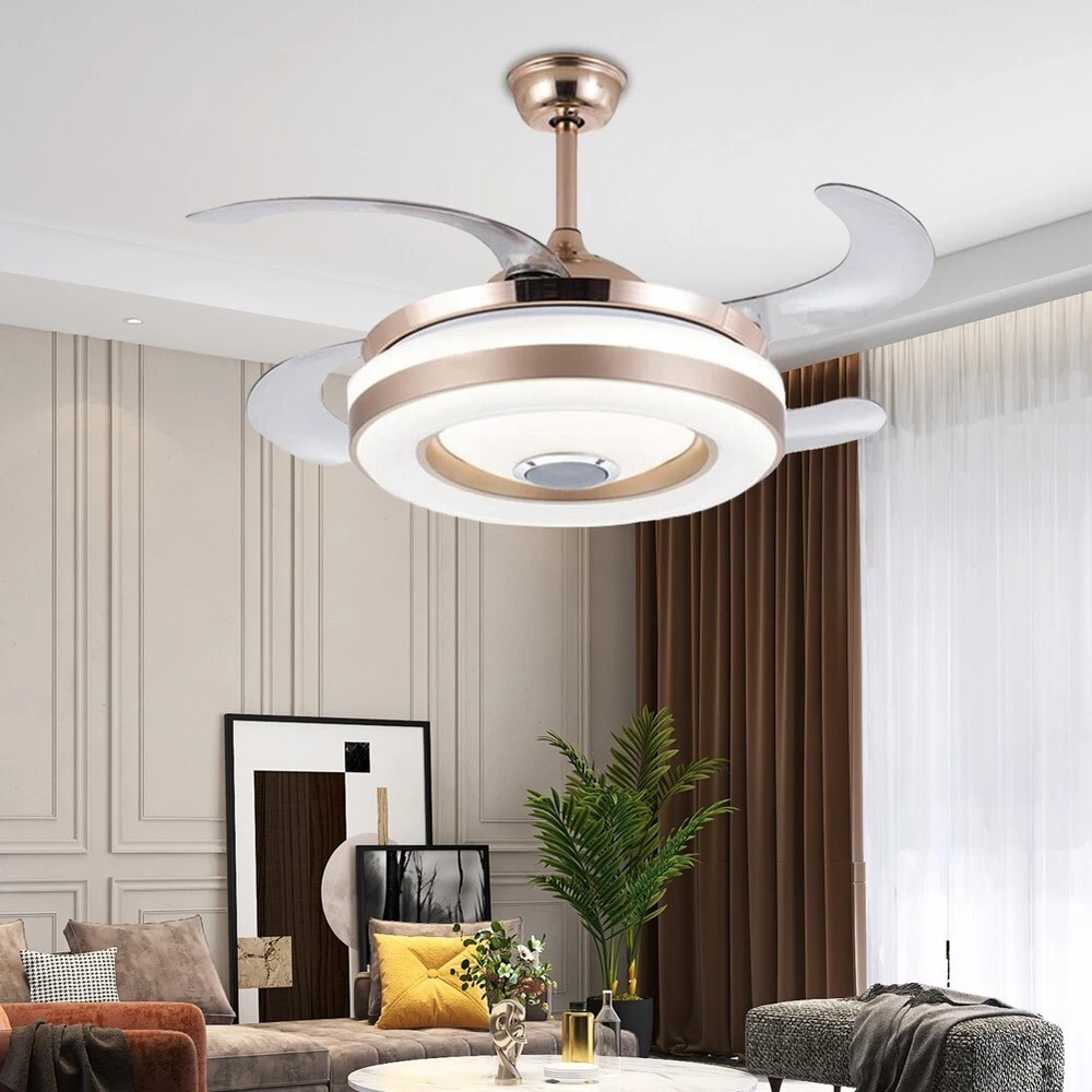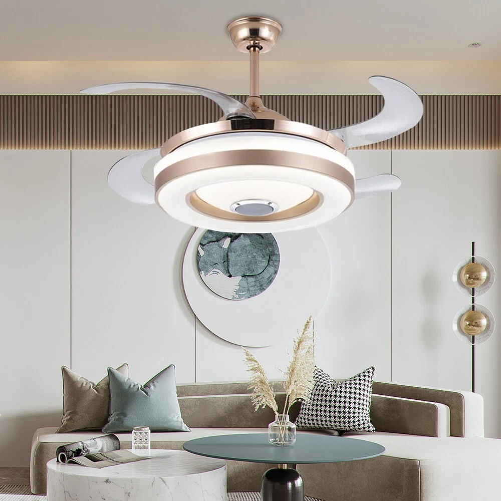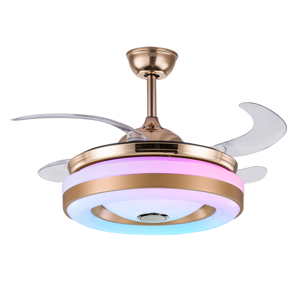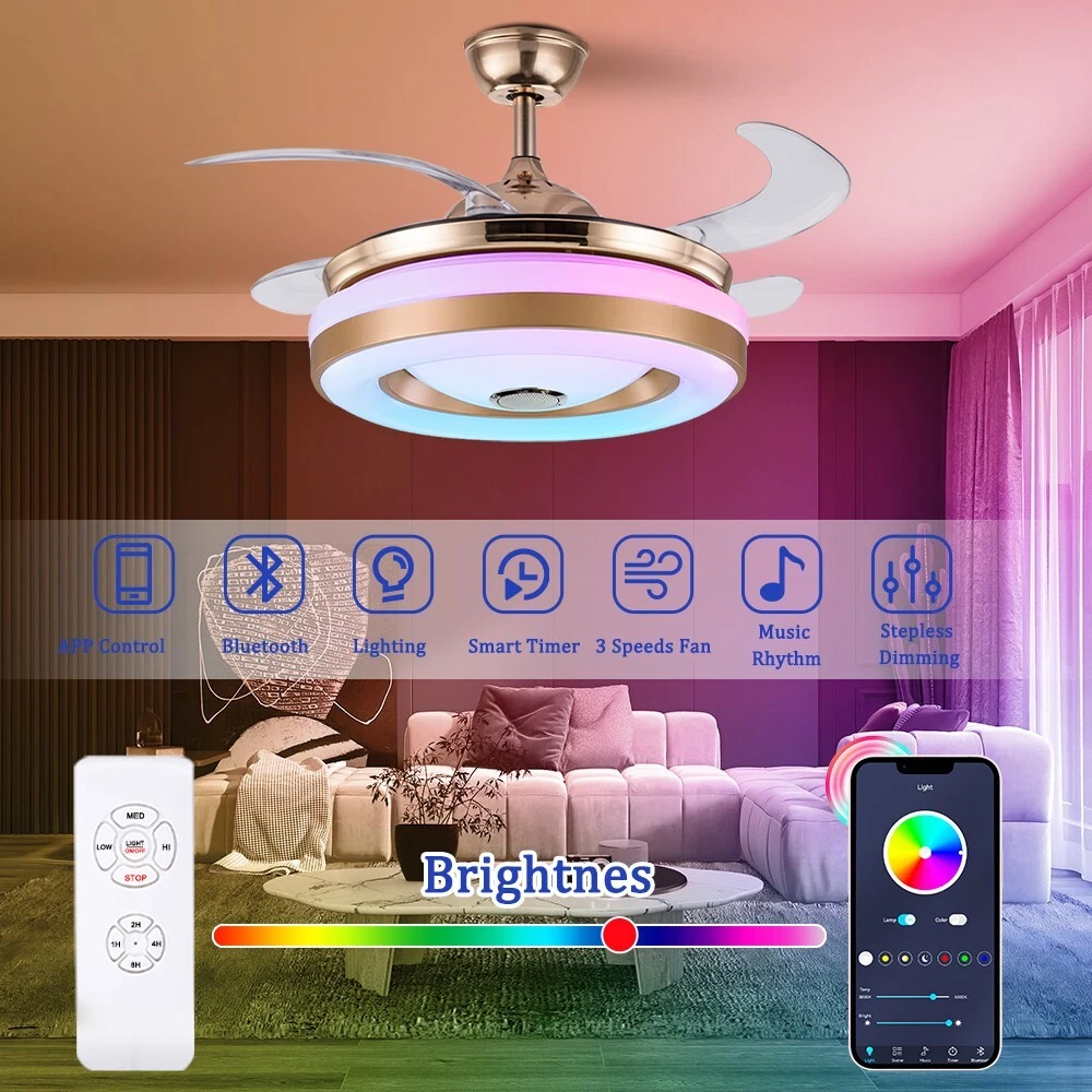 42"Retractable Ceiling Fan Light Bluetooth Speaker RGB Color Changing Chandelier Singing Ceiling's Fan Lights: New Design Multi-Functional Ceiling Fan Lights, With Bluetooth audio function, Mobile Smart Remote Control (Need to Download Smart APP). Function: Bluetooth: Connect Bluetooth to play any music you want. Smart App : Download Smart APP, the you could use the mobile device to change the atmosphere light color.(7-colors change) Remote control: To control normal light color(White light,neutral light and warm white light).Change fan speed(L-M-H). Color:Gold Material: Metal+ABS+Acrylic Blade expansion diameter is: 108CM/42inch Source: LED Light(Included) Voltage: 110V-120V Superior features: no radiation, no flicker, no glare, no dark areas, green, low emissions, 50000h life, low power consumption. Control Mode: Wall Control / Remote Control / Wireless Bluetooth(Don't come with wall control) Applicable: living room, bedroom, restaurant, etc. Suggest: Ceiling weighing ≥50KG Floor height ≥3m Packaging details 1 * Multifunctional color fan light Introduction: ▲ High-Transmittance Acrylic Lampshade: The Lampshade Adopts High-Quality Acrylic, Uniform Thickness, Strong Light Transmission, No Glare Transmission Rate of more than 92% ▲ Bluetooth Stereo: Built-in Bluetooth stereo, mobile phone just need to download APP to control music, atmosphere, lanterns, etc., subtle exchange of music. ▲ Plating Hardware Suckers / Suspensions: Thick metal materials, Bright Color, Strong, Durable, Good Bearing Capacity, Anti - Corrosion Rust, Durable. Inverted mute silicon Steel motor, Fast heat dissipation, long life. ▲ High - Quality ABS Blades: The blades are made of high-quality ABS Material, which has good toughness, Light Weight, Greater Wind power and Beautiful Lines. High-Quality Metal Shell, Frequency Conversion Mute Steel Sheet Copper Motor, Fast Heat Dissipation, Long Life. Built-In Bluetooth Audio, Mobile Phone Just Need to Download The APP to Control the Music, Atmosphere, Lanterns, and so on.