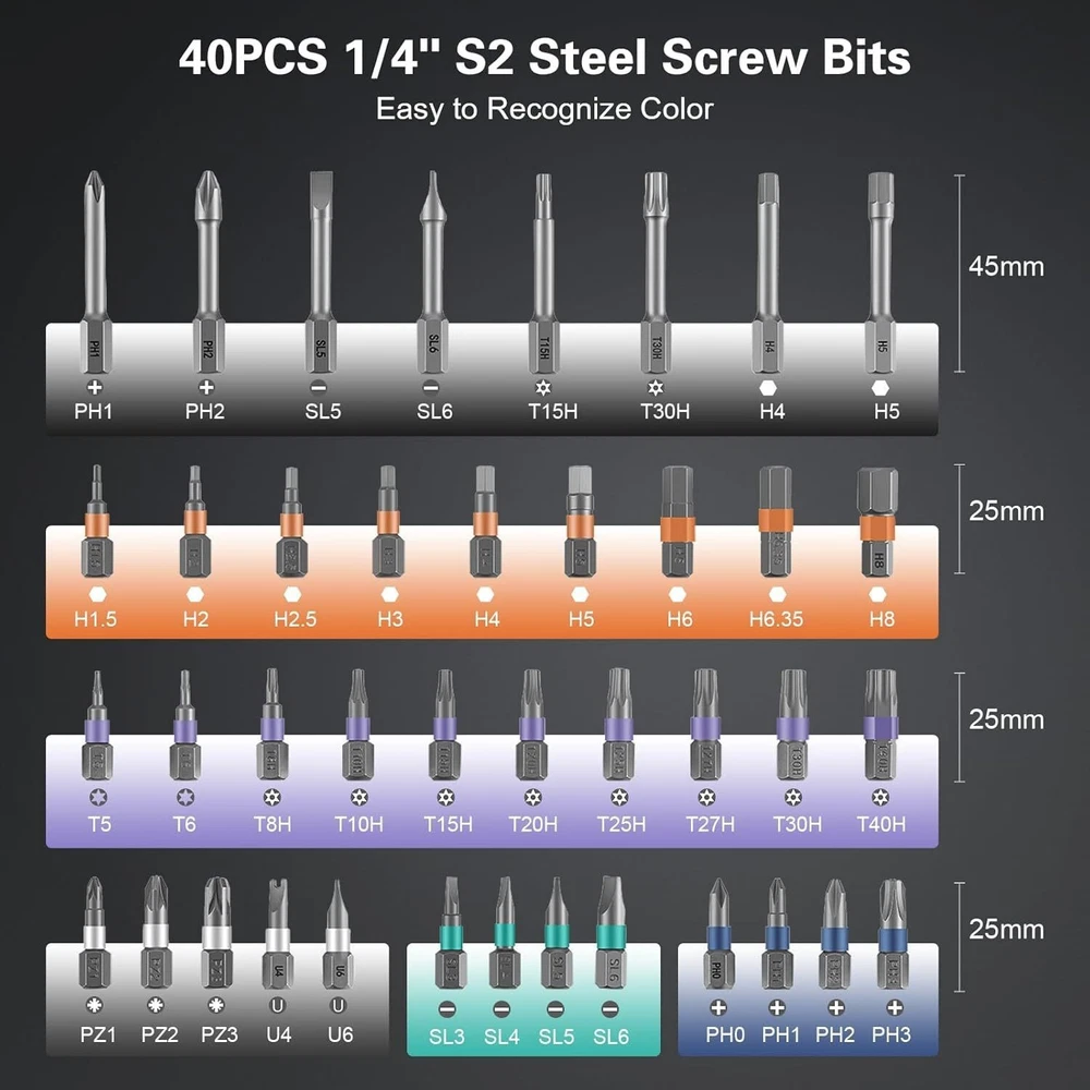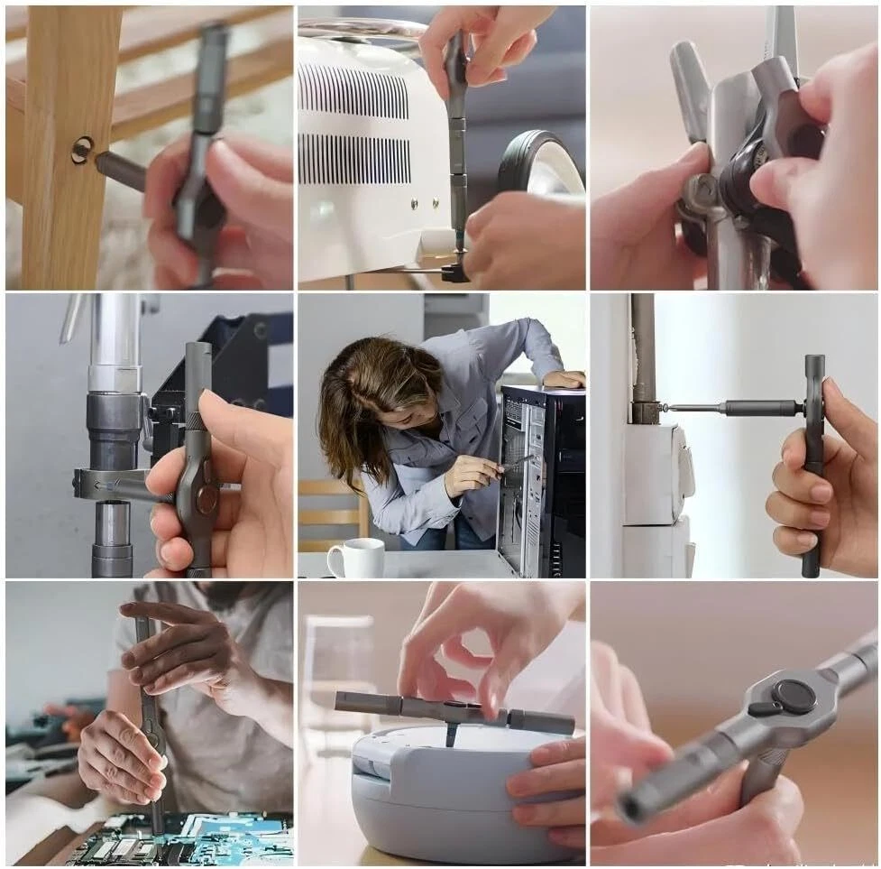About this item Flexible Ratchet Handle Design - The handle features a detachable structure, allowing for various combinations and multifunctional adjustments to fit different situations, like using in narrow spaces. The ergonomic aluminum handle design is lightweight yet rugged, crafted from hot-forged aluminum alloy with high-precision CNC molding for durability and oxidation resistance. Its lightweight construction ensures ease of handling, making it perfect for extended use without fatigue. Effortless Ratcheting Mechanism - Equipped with a 6.2-degree ratchet and 58-tooth forward-reverse ratchet mechanism, offering 80% effort savings. With a 50N.m torque, Bomivoi ratcheting screwdriver set tool makes it simple to tighten or loosen screws without wrist adjustments, saving time and effort in every repair job. 42-in-1 Screwdriver Set - Bomivoi handy screwdriver set includes 40PCS S2 magnetic chromium-molybdenum alloy steel bits, featuring a 6.35mm (1/4") diameter, one handle, and a magnetic slot. the bit driver set comprises 32 short bits (25mm) and 8 long bits (45mm), including various types like PH, SL, Torx, Hex, PZ, and U-shape. Ideal for home, work, DIY projects, professional task, and repairs, providing the right tool for any task. Strong Magnetic & Easy Identification - Features a magnetic handle for secure bit placement and a convenient magnetic slot within the case to recharge the bits’ magnetism as needed. Color-coded bit rings ensure quick and easy identification, improving work efficiency and simplifying organization. This magnetic screwdriver set effectively tackles various tasks, including home appliance repairs, home furniture repairs, and automotive maintenance. Compact Case, Perfect Gift Choice - Housed in a sturdy, compact storage case (6.6 x 3.7 x 1.6 inches, 15.6 oz), this mini screwdriver set is an excellent gift for professionals and DIY enthusiasts alike. Whether for furniture, electronics, appliance, computers, motorcycle or bike repairs, it's a practical present for Christmas, holidays, birthdays, Father's Day or any special occasion.
