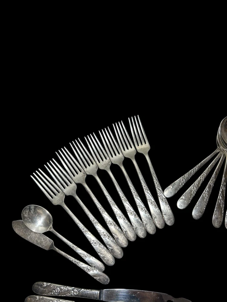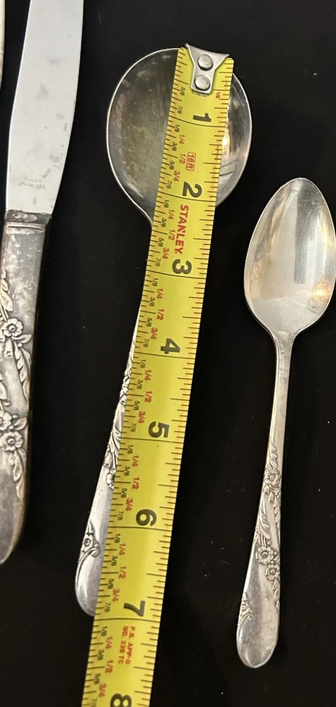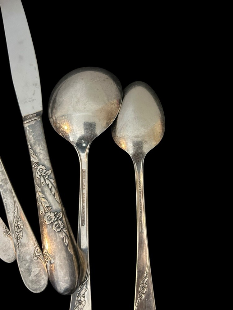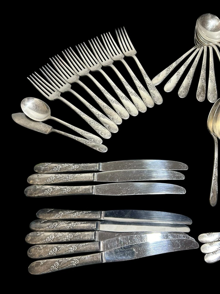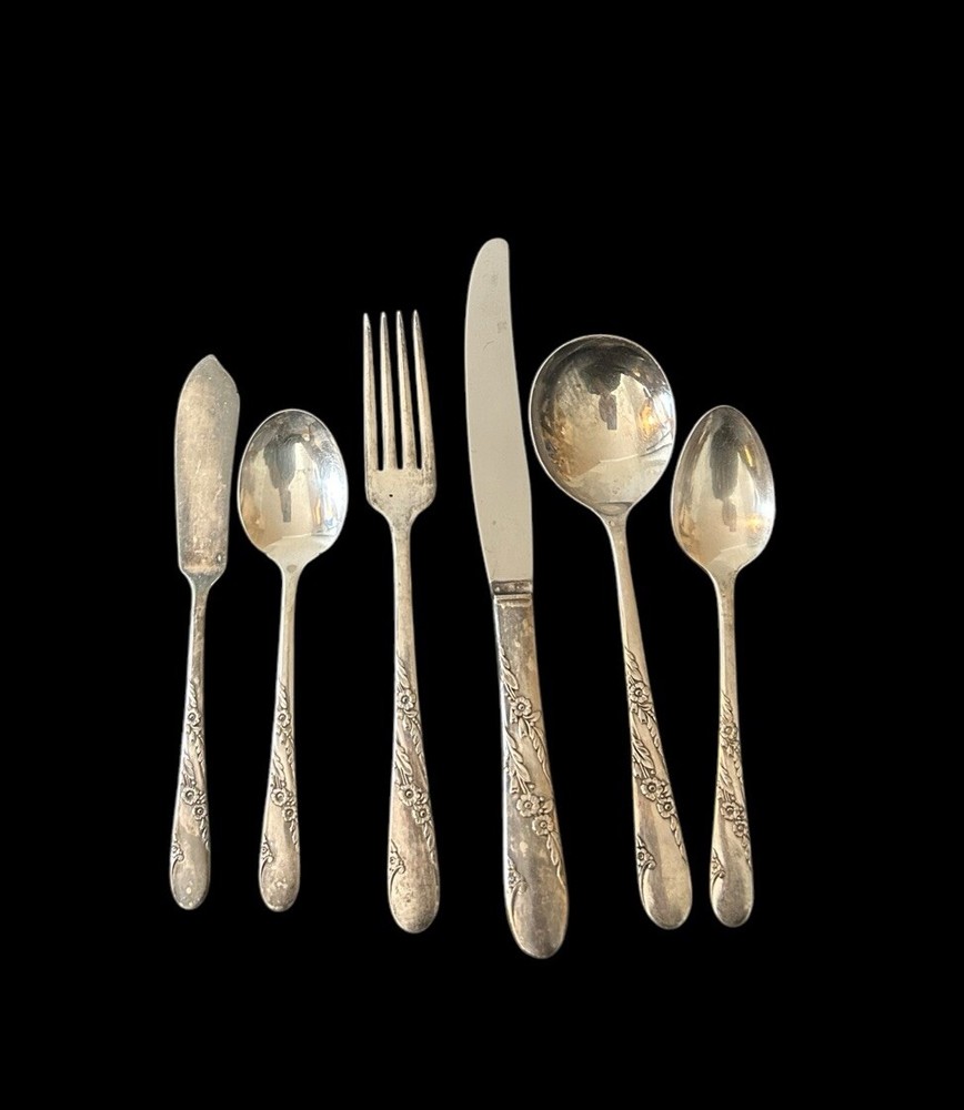 42pc Oneida Community Bridal Wreath Tudor Plate Silverplate Flatware 1950s 8 Dinner Forks 8 Dinner Knives 8 Dinner Gumbo Spoons 16 Dessert Spoons Teaspoons 1 Butter Knife 1 Sugar spoon Good vintage condition. Normal signs of wear and aging. Minor scratches, patina throughout and some minor discolorations. Please study pictures carefully before purchasing Feel free to ask us any questions. Thank you for visiting our store! Bag77A