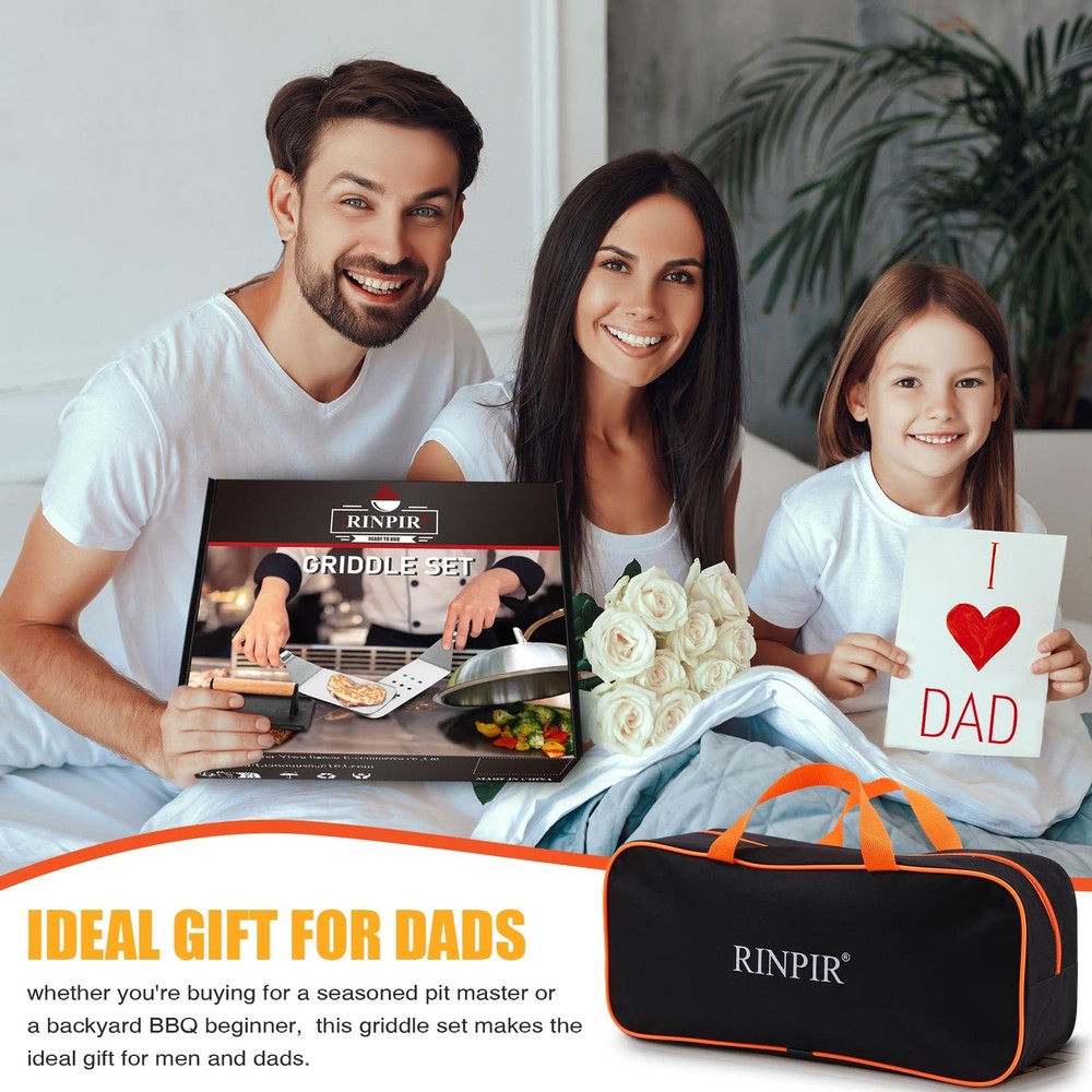 Elevate your grilling experience with 42pcs flat top grill accessories set 【MOST COMPLETE 42pcs FLAT TOP GRILL ACCESSORIES SET】: A complete set of flat top griddle accessories includes: 1*Extra-wide Burger Spatula, 2*Professional Long Spatulas, 1* Slant Edge Scraper, 1*Horizontal Chopper, 1*Locking Tongs, 1*Steak Knife, 1* Basting Cover, 1* Rectangle Bacon Press, 1*Kitchen Shears, 1*Cleaning Pad with Handle, 2*Squeeze Bottles,2*Spice Shakers, 2*Silicone Basting Brushes,4*BBQ Skewers, 4*Egg Rings,8*Corn Holders,8*Hanging Hooks,1*Portable Bag with Gift Box. 【PREMIUM HIGH QUALITY STAINLESS STEEL】: Our 42pcs metal griddle tools set is made of food grade stainless steel which is rust-resistant and long-lasting, Heavy duty metal material is tough and will hold up for a long time. All of the griddle utensils are thick enough to prevent bending or cracking. This griddle accessories set is compatible with Blackstone griddles, Camp Chef flat top grills, or any other cast iron griddles for indoor and outdoor cooking 【EASY TO STORE AND EASY TO CARRY】: Each griddle tool is easy to clean with hot water and cleaner. It’s also dishwasher safe. Hand wash recommended for the cast iron burger press. Please remember to wipe each tool dry before storage and rub some oil on the cast iron to protect it, maintain non-stick and extend its’ life. Easy to store with the included storage bag to keep all your griddle tools organized and tidy. It’s also convenient to carry out for picnic camping or backyard BBQ 【MUST-HAVE FOR GRILL MASTER】: This complete and versatile teppanyaki griddle accessories set includes everything you need to create the perfect outdoor feast and will satisfy all your flat top grill needs. If you are looking for the perfect gift for the BBQ lover, look no further than the 42pcs griddle spatulas set. An ideal gift for any professional or novice chef, grill master, or BBQ lover. Perfect for Birthday, Anniversary, Father's Day, Christmas, and any other special holidays. 【MONEY-BACK GUARANTEE】: Your ideal black stone breakfast griddle accessories kit. Risk-free to choose professional griddle spatula set. If there are any issues with your purchase, do not hesitate to contact us. We will offer a money-back guarantee for any unsatisfied orders to ensure your complete satisfaction of shopping experience with BBQ utensils. Go ahead and do not hesitate to fire up the barbecue and share the moment together with your family and friends.