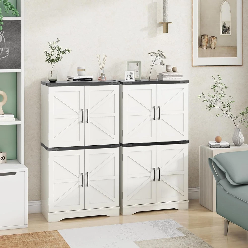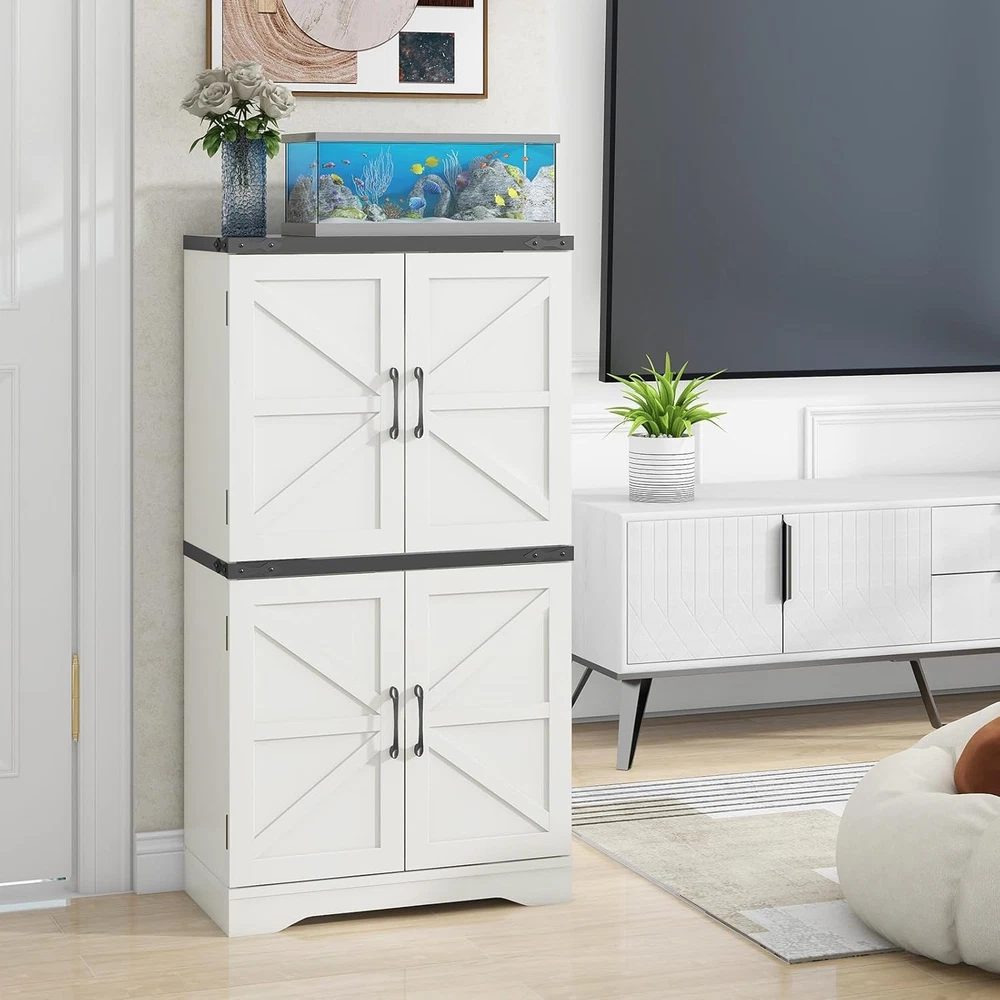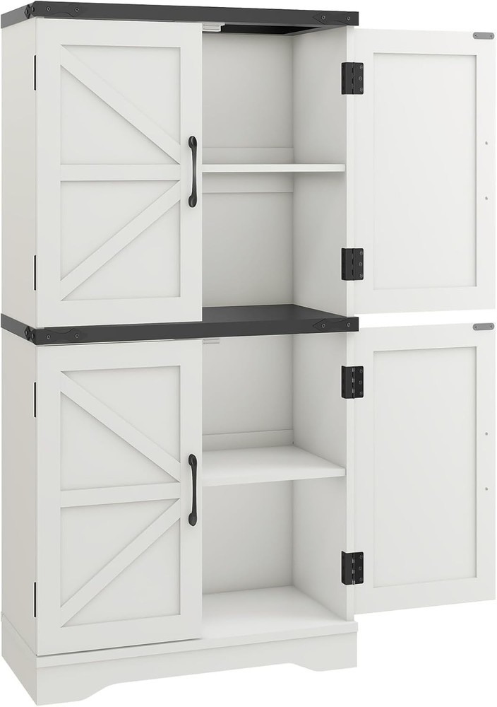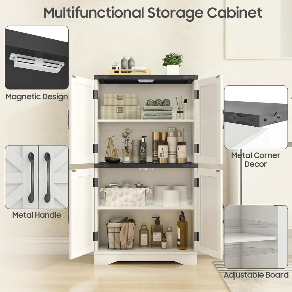 43" Tall Farmhouse Kitchen Pantry, Floor Storage Cabinet with Adjustable Shelves, Farmhouse Storage Cabinet for Bathroom, Kitchen, Living Room, Rustic Style Cabinet product Description Farmhouse Kitchen Pantry Enhance your home with our versatile farmhouse-style storage cabinet, ideal for kitchen and general storage. This charming piece features a two-tier design with classic white cabinets. The top panel, available in rich brown or sleek black, is accented by decorative corner irons. Inside, adjustable shelves offer customizable storage. Crafted from durable materials, this cabinet combines rustic elegance with practical functionality, making it a stylish and reliable addition to any room. Feature Metal Handle Adjustable Shelves Sturdy Base Thickened Top Board What materials is the cabinet made from? Yes, the wooden shelves inside both the upper and lower cabinets are adjustable, allowing you to customize the storage space to fit items of various sizes. Is the cabinet suitable for use in a bathroom? Yes, the cabinet's versatile design makes it perfect for use in bathrooms, kitchens, or any other room where you need additional storage. Its farmhouse style adds a rustic charm to any space. Is the cabinet difficult to assemble? No, the cabinet comes with detailed instructions and all necessary hardware for easy assembly. Most users can assemble it in under an hour with basic tools.