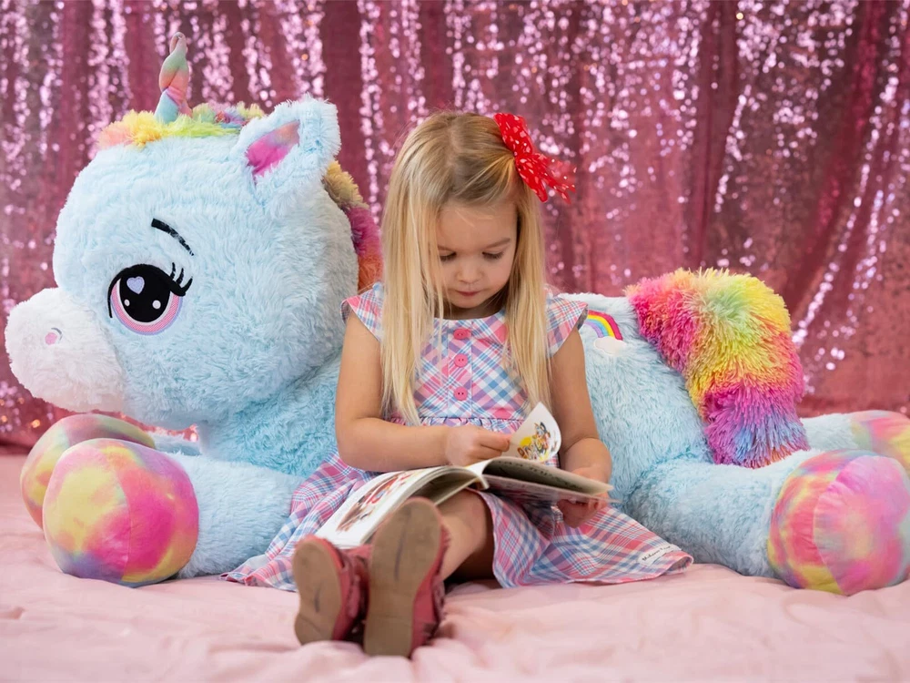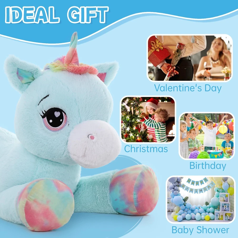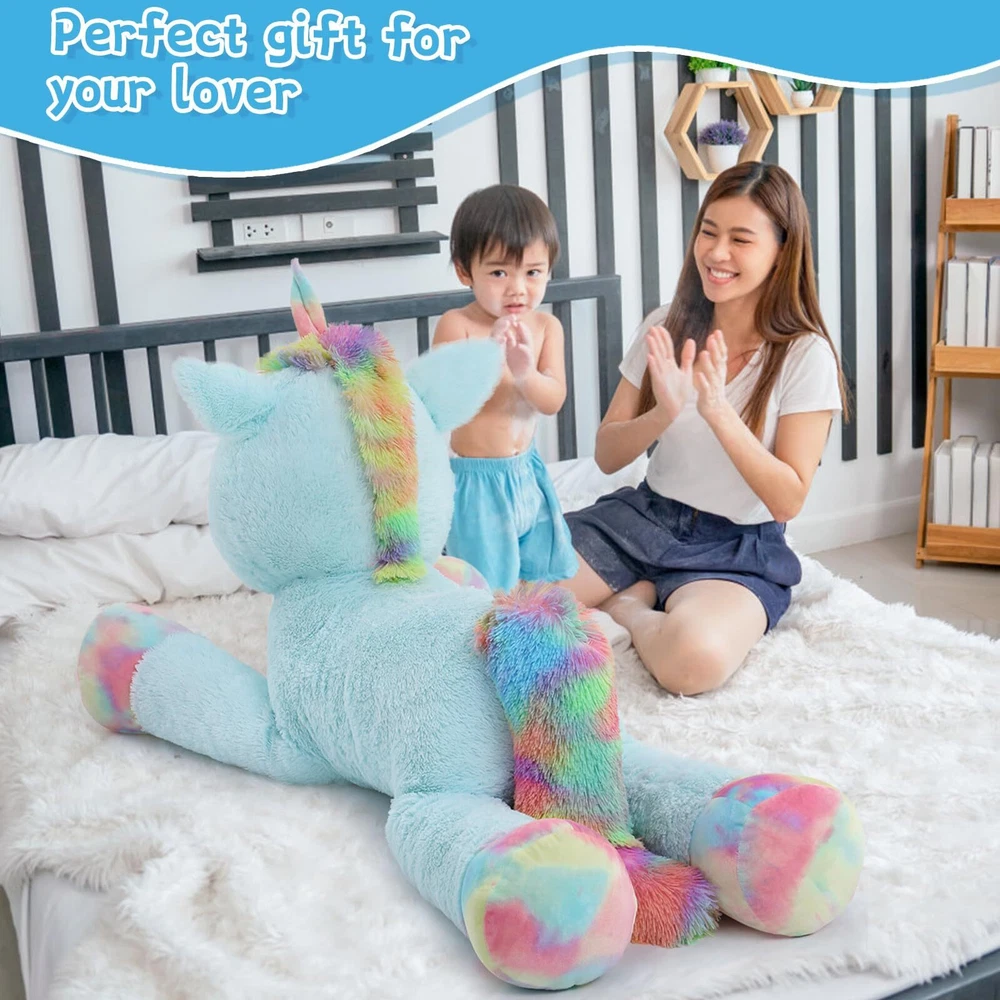 Welcome to , has been committed to creating the most comfortable, softest, and safest plush toy. Whether it's a or an adult, choose Tezituor, choose the best gift for your loved . Large unicorn's message: “Hello, nice to meet you and thank you bring me home. I don't know if I am your most special stuffed animal but you are special to me. I want you to treat me not only as a gift so many on special occasions such as birthdays, Valentine’s Day, Christmas or just as an unexpected gift for cheering a loved , but also to be your loyal friends, whether you are sad or happy, I can accompany you. I love you." Big unicorn identity registration: Type: Plush blue unicorn from the Tezituor family. Color: Blue Size: 43inch Material: Smooth plush fabric, PP cotton. Safety is our top concern Lock-washer eyes are beads that are secured by a facet from the inside, so the eyes cannot be chewed or picked off easily from young children, which ensures safety and durability. It is safe enough as there are no small parts to detach. More functions! This adorable stuffed animal is the best choice for decorating your house or playroom. And is a great gift for any occasion, such as Thanksgiving Day, Valentine's Day, Christmas, Birthday, or any anniversaries. Our large stuffed unicorn is always ready for naptime, playtime, and any time in between. Large Size Unicorn: Our blue unicorn stuffed animal has a total length of 43.3 inches. The interior of the unicorn plush pillow is filled with 5.4 pounds of cotton, and its heavy weight meets the expectations of a hug, giving you the warmest hug. Soft Friendly Material: Our cute stuffed unicorn plush toy with super soft fabric is made of plush and PP cotton, the material is very soft. The belly of the unicorn plush pillow comes with a zipper for easy cleaning. Perfect Gift for Unicorn Lovers: The giant unicorn plush pillow is a great gift idea for children's birthdays, Valentine's Day, Christmas, Thanksgiving, Easter. It can also be used to decorate your party, house, sofa.You can also put her in bedroom or playroom as unicorn theme decoration. Home Decoration: The cute giant unicorn stuffed animals not only a toy for children but also a very good pillow. When you are resting, sleeping, watching TV, quietly accompany you, very comfortable. It can be placed on the sofa, bed, children's room and so on. Good Service: Compressed packaging. When it is first opened, there may be a lack of filling at the joints, product wizened, and messy fur. Simply tap and adjust the position of the filling, and let it bask in the sun for a while to quickly restore its cute shape. If you have any other questions, feel free to us at any time.