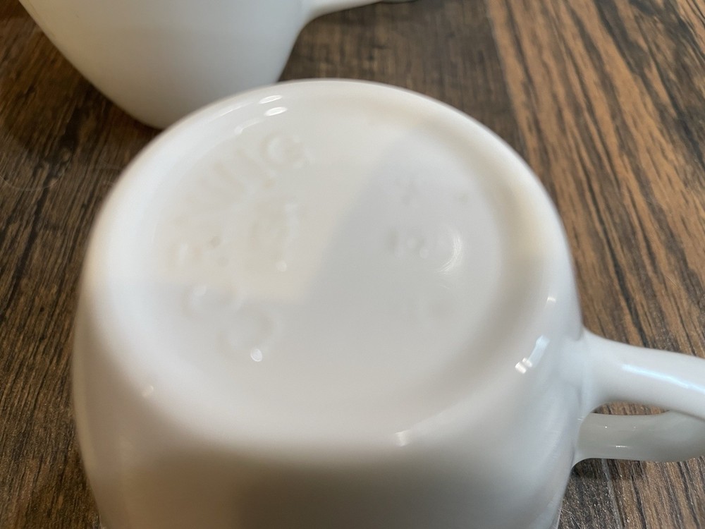 This is for 8 Corning stoneware solid all white cups mugs. They measure 2 3/4" tall, 3 1/2" across the openings, and 4 3/8" across with the handles. Excellent. No chips, cracks, or scratches. Some light stains on the inside of one. 285E