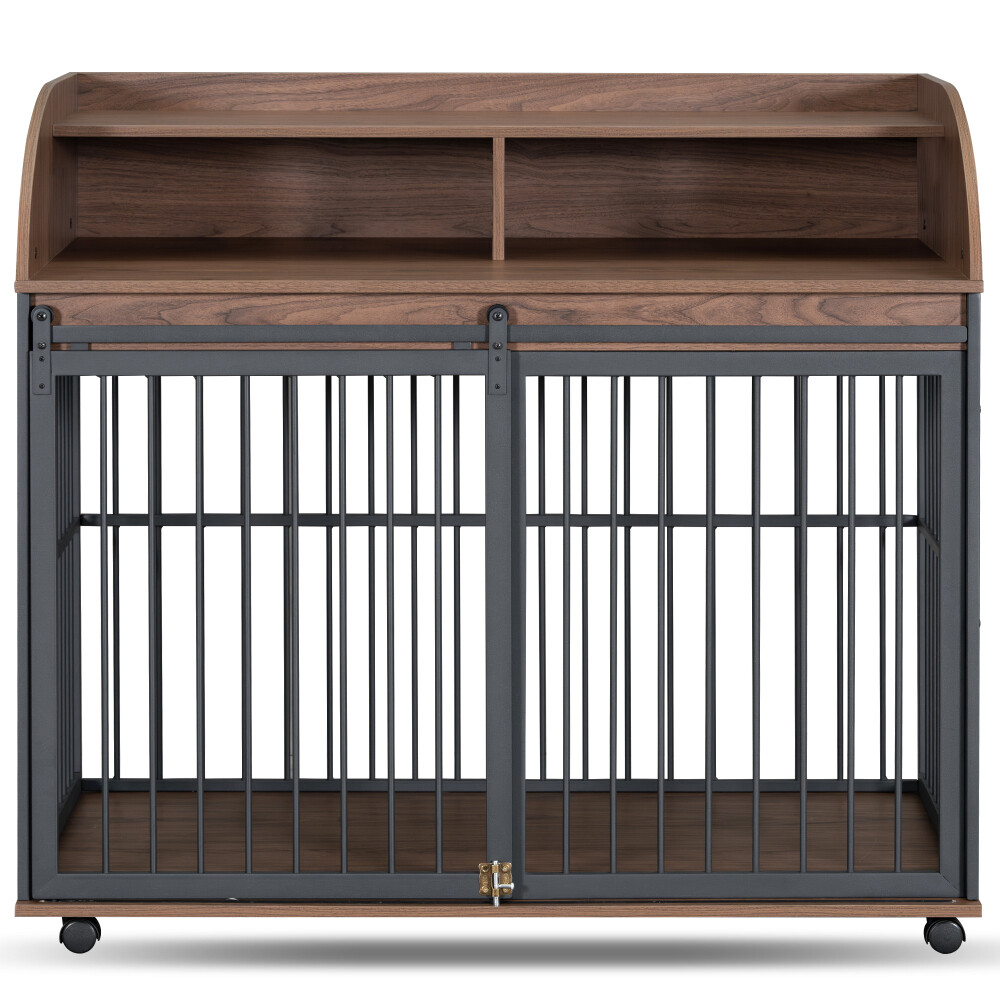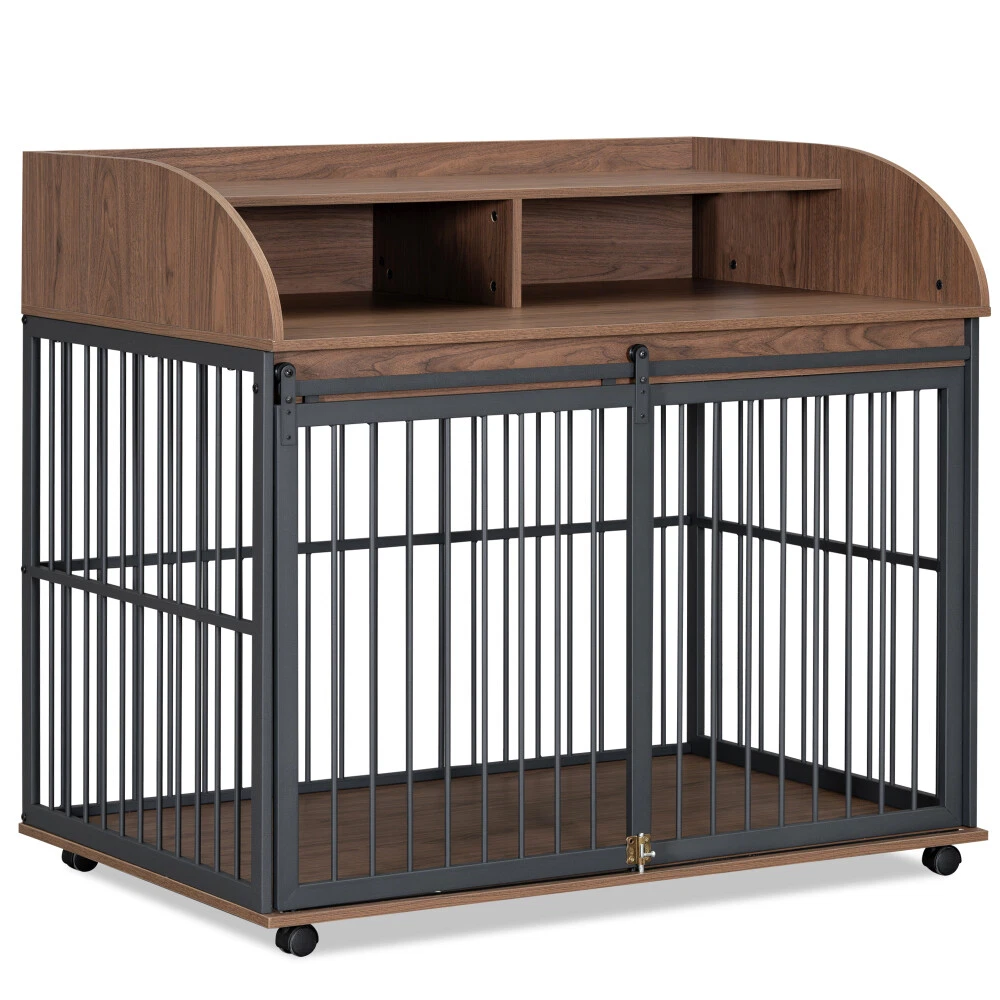 44'' Heavy Duty Large Dog Crate Furniture with Lockable Wheels, Double Storage Features Furniture-Style Design: The dog crate combines the beauty of furniture with the practicality of a pet house, making it a perfect addition to any home decor. It can be used as a dog crate, dog kennel, or even as a stylish end table, offering a comfortable and cozy space for your dog while enhancing the aesthetics of your living space. Sliding Door Design & Space Saving: The sliding barn door is designed to allow for easier entry and exit for dogs, with a lock for security. When in a small space, you don't have to worry about the door of the dog cage not being able to open fully. Ample Storage: Double layer desktop offers ample space to showcase your small or medium plants, magazines, family picture frames, and lots of pet supplies without cluttering up your home. Strong Construction: The cage body adopts a stronger steel tube structure, ensuring its long-lasting durability. The surface is smooth and non-toxic to prevent dogs from chewing. Lockable Wheels: Dog crate furniture is equipped with lockable wheels, you can easily pull or press their tails to make them movable or unmovable. They can also rotate 360 degrees, making it easy to move the cage around your home. Choose the Right Size: Choosing the right size dog crate is critical to ensuring your dog's safety and comfort. Our dog crate is suitable for medium dogs up to 90 LBS. And it's heavy enough that you don't have to worry about the dog crate tipping over. Descriptions Description Introducing our Furniture-Style Dog Crate, a blend of elegance and functionality perfect for any home. Its stylish design seamlessly integrates with your decor, doubling as a dog crate, kennel, or chic end table. The sliding barn door ensures easy access while maximizing space efficiency. With ample storage on the double-layer desktop, it accommodates plants, magazines, and pet supplies without clutter. Crafted with a robust steel tube structure, it guarantees durability and safety, while lockable wheels provide mobility and stability. Choose the right size for your medium-sized dog, up to 90 LBS, ensuring both comfort and security. Features Product Type Dog Cage Material Engineered Wood + Steel Color Brown Weight Capacity 150 LBS Assembly Time 0.5 hour