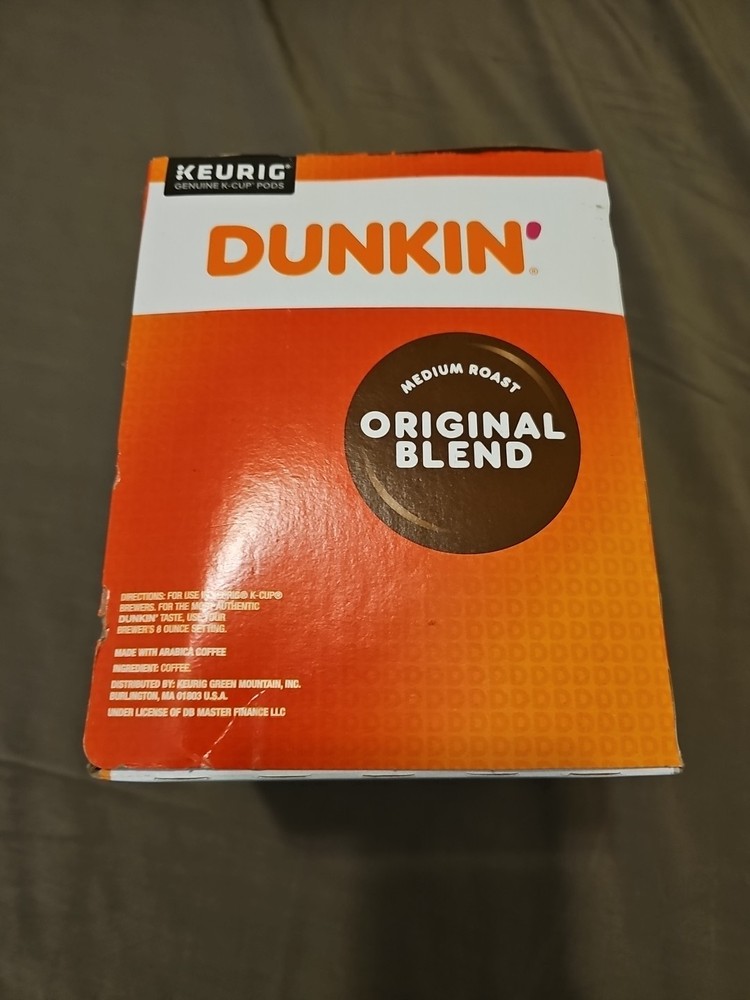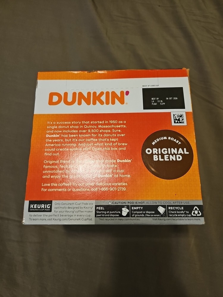 The product is a pack of 44 Dunkin' Donuts Original Blend medium roast coffee in K-Cup style for use with Keurig machines. The coffee is made in the United States and has an expiration date of 10/06/2026. This pantry item offers a classic coffee flavor from the well-known Dunkin' Donuts brand, providing convenience and variety for coffee lovers.