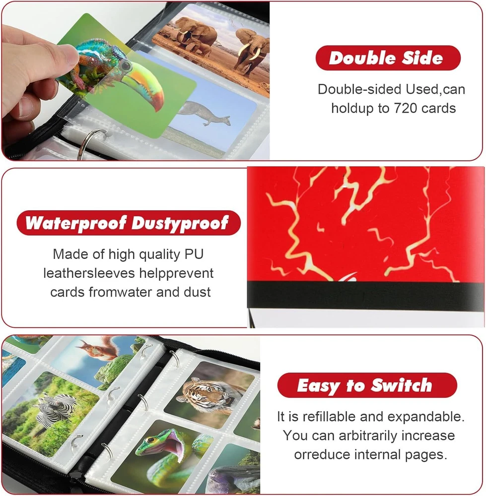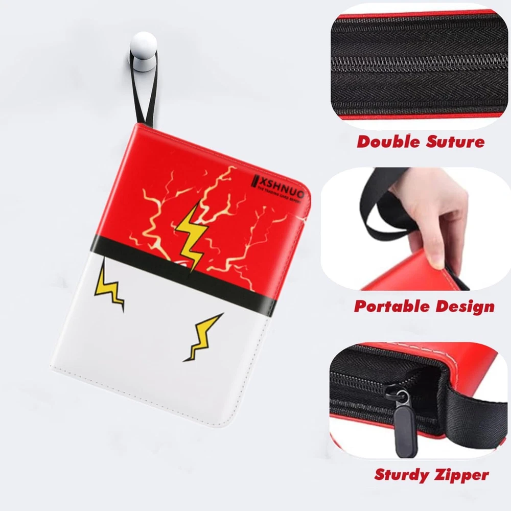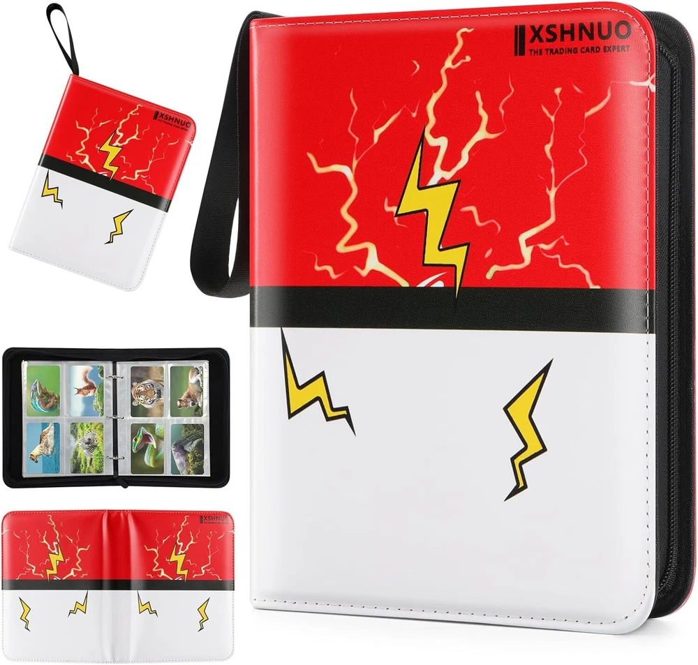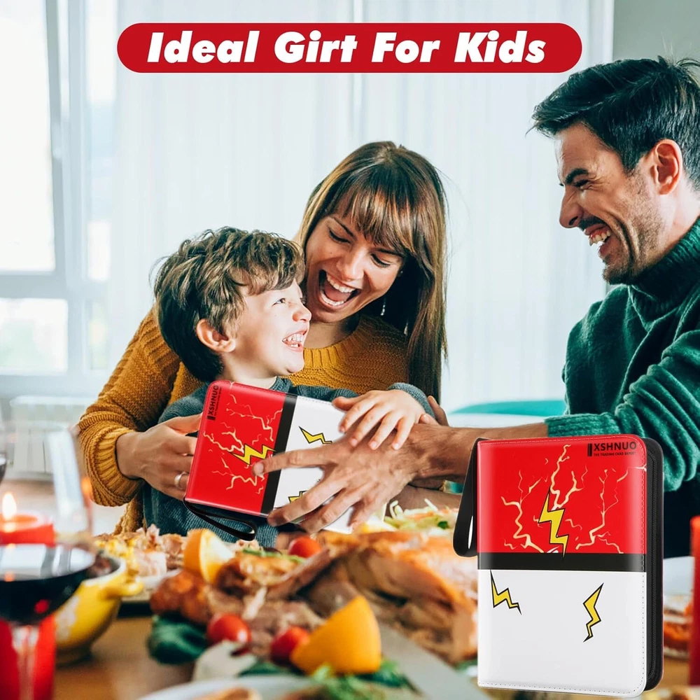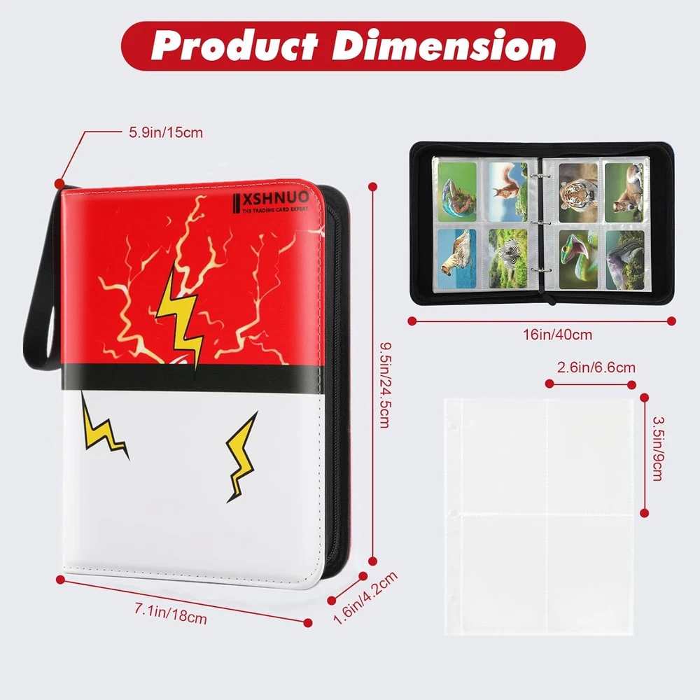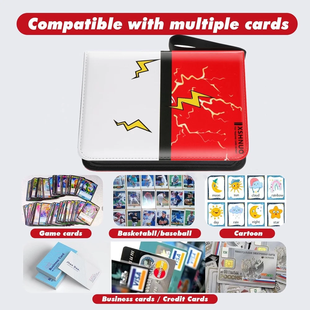 More Cards Storage Space: This card binder comes with 55 removable sleeves, which can hold up to 400 trading cards with 4 pockets per page. The trading card binder storage case is compatible with Fuji mini Polaroid photos, svarious standard-sized cards, MTG Card Game, Yu-Gi-Oh, Star Wars X-Wing, Football cards, Baseball cards, Playing cards, etc. Waterproof and Protective: Made from waterproof PU fabric, the cover of the card binder ensures your cards stay safe from damage and loss due to creases or tears. The sleeves also offer extra protection to your cards. Easy to Manage: We use sturdy removable 3-ring switch inside the card book, you can add and reduce sheet at any time.This design allows you to quickly organize your cards and flip through them with ease. Convenient and Portable: The sturdy zipper design can effectively prevent the card from being lost when carrying it. With a zipper closure and wrist strap, this card holder is easy to carry around wherever you go. The compact size is perfect for both adults and children. Special Gift: Our cards binder case has exquisite design,simple and easy to use. This card holder is the perfect gift for friends! It is popular especially children. Birthday gifts,Thanksgiving Day Gifts, Christmas Gifts and New Year Gifts for your children and your friends. Product Description 440 Pockets Large Capacity Trading Card Binder Holder 4-Pockets Trading Card Binder 4-pocket each page, double-sided used, it can hold up a total of 440 cards; Waterproof PU material, excellent sewing technology with zipper closed, keep your trading cards don’t fade, organized and waterproof; Unique cute design, colourful cover. The card holder binder is the special gift choice for children and someone who likes to collect cards. Why do you need XSHNUO 4-Pocket Binder for Trading Cards with sleeves? Compatible with standard size trading cards Stores 440 Cards Refillable / Expandable Durable and Waterproof Special Gift Theme design, a great gift choice for young collectors, 4 pocket binder with 55 Sleeves,Hold up to 440 cards. Portable hand strap-Convenient for you to carry them everywhere. Keeps your cards Safe, Protected, and Organized. Protect your card from fading,bending, tearing or losing. Ultra soft Exterior, comfortable to carry around with wrist strap. Transparent pages for display, see through every artwork and detail Trading Card Binder card holder Perfect Match Standard Binder : 1.XSHNUO 4-Pocket cards binder for trading cards with PU leather 2. cards holder for trading card with sleeves with plenty of room to hold 440 trading cards 3.binder for trading cards with sleeves have all cards in the binder and not all over the place 4.card binder for trading cards with 55 sleeves compatible with universal standard size trading cards, game cards, sports cards and more. Our card binder for trading cards with sleeves is great for trading cards storage, keeps your trading cards safe, protected, and organized! perfect for most. Perfect Gift for Children Special Gift Our cards binder case has exquisite design,simple and easy to use.This card binder is the best gift for the collector! It is popular especially children. A good school stationery Gifts, Thanksgiving Day Gifts, Christmas Gifts, Halloween Gifts, New Year Gifts and Birthday gifts for your children and your friends. 440 pockets card binder holder is compatible with Cards, and it is perfect fit all kinds of game cards and standard sized cards, like MTG, Yu-Gi-Oh, Monopoly, Phase 10, Football cards, Baseball cards, Basketball Game Card, Basketball Cards, Yu-Gi-Oh Card Game, MTG Card Game, Cards Against Humanity, Unicorns Base Game, Monopoly Deal Cards, Phase 10 Card Game, Dutch Blitz Card Game cards etc. Specifications: Product name: Card collection binder Binder Size: 9.5 x 1.6 x 7.1 inches Pocket size: 3.5 x 2.6 inches Total pockets: 440 Weight: 300g Package Included: Trading Card Binder with 55 pages x 1. Trading cards are not included Extra Wristband Design Wrist band and zipper design. Easy Carrying Around it is Easy to Carrying Anywhere. Waterproof PU leather Waterproof PU material prevent cards from water. Double-sided storage design Cards can be collected on both sides of the inner page. 3-Ring Design Easy adding and removing. It can arbitrarily increase or reduce the internal pages. Meet your card collection needs.