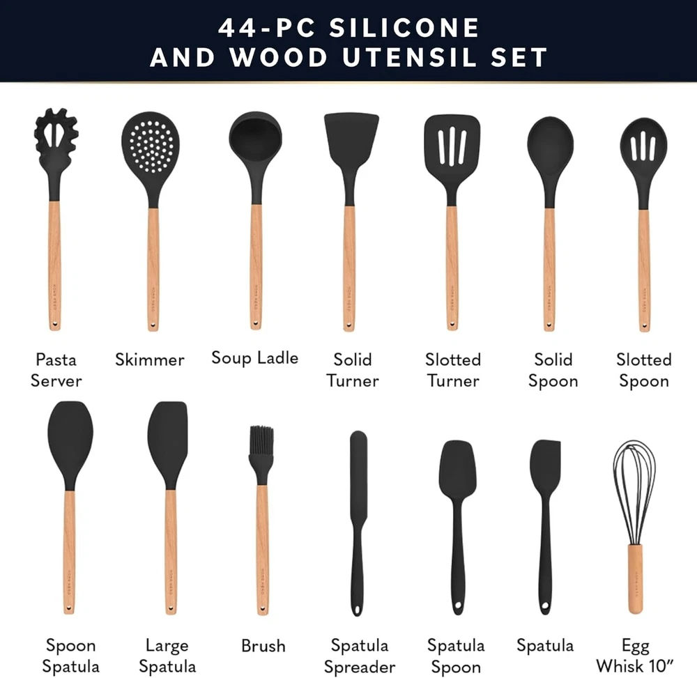 44-Piece Silicone Kitchen Utensils Set with Ergonomic Wooden Handles - Black ‹ › ‹ › ‹ › ‹ › ‹ › ‹ › ‹ › ‹ › ‹ › ‹ › ‹ › 44-Piece Silicone Kitchen Utensils Set Elevate Your Cooking Experience Discover the ultimate kitchen companion designed for both novice cooks and culinary enthusiasts alike. Our comprehensive 44-piece kitchen utensils set includes all the essentials you need to conquer every culinary challenge with style and ease. What’s Included: Solid Turner Slotted Turner Spoon Spatulas Solid Spoon Slotted Spoon Spatula & Large Spatula Soup Ladle Skimmer Egg Whisk Pasta Server Brush, Tongs & more! Unique Ergonomic Wooden Handles: Say goodbye to hand fatigue! Our utensils feature all-natural beechwood handles designed with your comfort in mind. The uniquely smooth, flat-edged ergonomic shape provides a soft, comfortable, non-slip grip, allowing you to focus solely on your culinary creations without discomfort. Hassle-Free Storage: This set comes complete with a stylish utensil holder equipped with drainage holes and 10 stainless steel hooks for effortless organization. Enjoy your clutter-free kitchen, where elegance meets functionality. Safe and Durable: Crafted from BPA-free, food-safe silicone, our utensils are heat-resistant from -22° to 410°F, ensuring they remain intact without melting or emitting harmful fumes. The soft silicone tips are gentle on your non-stick cookware, preserving your pots and pans for years to come. Exceptional Customer Service: Your satisfaction is our priority. Should you have any questions or concerns, our responsive team is just a message away on Amazon, ready to assist you within 24 hours. Why Choose Our Kitchen Utensils Set? Transform your culinary space with our 44-piece silicone kitchen utensil set, where usability, elegance, and durability coalesce. These utensils not only enhance your cooking experience but also add a touch of sophistication to your kitchen. Make every meal a masterpiece – order your set today! Shipping Free & Fast Shipping - We offer free shipping to most of the USA with a normal delivery time of 3-7 days. However, due to the current situation, additional delivery time (up to 3 weeks) may be required for some items. Alternative Carriers - We may use alternative carriers (e.g. USPS, FedEx, UPS, etc.) to ensure your package arrives safely and on time. Due to the use of multiple carriers, we are unable to provide a tracking number automatically. Handling Time - Orders are processed and shipped within 1-2 business days of receiving cleared payment. Shipping Restrictions - Shipping to Alaska, Hawaii, Puerto Rico, Guam, and other US territories may incur shipping charges or delivery restrictions. Please contact us before ordering, or your order can be refunded/cancelled. State Restrictions - There may be restrictions based on your state of purchase. For example, certain items may not be shipped to California due to state regulations. Contact for Tracking Updates - If you require tracking updates or have any concerns about the delivery of your order, please feel free to contact us, and we will be happy to assist you. Return Please see our eBay Return Policy. Thank you. Payment We accept all major credit cards, PayPal, and Apple Pay for your convenience. Your payment information is secure and encrypted to ensure a safe and seamless transaction. Please complete your payment within 3 days of purchase to avoid any delays in shipping. Feedback Your feedback is extremely important to us. We strive to provide the best products and customer service possible. If you are satisfied with your purchase, please take a moment to leave us a positive review. If you have any concerns or issues with your order, please contact us before leaving negative feedback. We are committed to resolving any problems and ensuring your satisfaction. Contact Us If you have any questions or concerns, please feel free to reach out to our customer support team. You can contact us through the eBay messaging system. We are available Monday to Friday, 9:00 am to 5:00 pm EST, and we will do our best to respond to your inquiry within 24 hours. Thank you for supporting our small family business! UPC: Not Set Model: Silicone Kitchen Utensils Set Unit Quantity: 2.37 kg Set Includes: Spatula,solid turner,slotted turner,spoon spatulas,solid spoon,slotted spoon,large spatula,soup ladle,skimmer,egg whisk,pasta server,brush,tongs,measuring cups,measuring spoons,scissor,grater,spreader,peeler,masher,can opener,pizza cutter,bottle opener,ice cream spoon Material: Silicone,wood,beechwood,stainless steel Features: With Handles,ergonomic handle,non-stick,heat resistant,hassle-free storage,includes utensil holder,includes hooks,food safe,non-scratch Brand: Unbranded Type: Cooking Utensils Set Handle Material: Wood Color: Black Number of Items in Set: 44 MPN: Not Set Theme: Not Set Country/Region of Manufacture: Not Set Pattern: Not Set Making Method: Not Set Unit Type: Not Set Personalize: Not Set