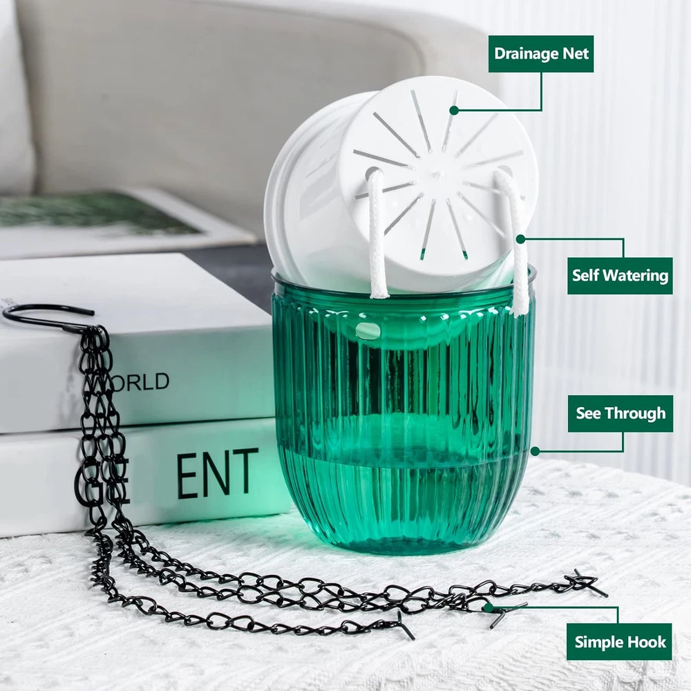 Clear As Glass: High quality transparent PET materials make our plastic hanging pot for plants as clear as glass. Visible water level from any angle. Easy for you to see how much water in the hanging flower pot. Hanging Self Watering Planters: The hanging baskets for indoor plants come with 16.5 inch long enough chains and cotton string wicks ropes. Transfer and soak up water from outer pot to inner pot to keep consistent moisture. Outer pot base like a water reservoir allows you to add extra water to offer you more time in between watering for a couple of weeks at least. Water Ecosystem: Our self watering planter pot for indoor plants is 2 in one by lifting the inner pot. The inner planting pot has enough drainage holes to drain water to the bottom of outer pot where the excessive water is accumulated like a water reservoir. Perfect to prevent the problem of drowning plants in water too much, in turn the water reservoir is soaked up by the wick rope to feed plants. Multi Scenario: The indoor plant hanger can be set on table without hanging chains, also be hanging anywhere you want, Great for hanging plants indoor outdoor, suitable for all most plants. Premium Materials: Sturdy coating, thick plating hanging chains can help avoid rusting for outdoor use. Light weight and decently sturdy can coexist due to the thickened high dense PET raw material. Also can be exposed to the sun, harsh winter and they will not fade or crack. Product Description See Through Easily Our hanging plant baskets unique feature high-quality transparent PET, clear as glass, easy to see through and tell how much water in. Good compromise between opacity and hiding the water, keeping an eye and easy monitoring on water level. The hanging outdoor planters, well made and truly give the appearance of real glass but are actually plastic. High Dense Plastic & Durable Coating Chains for Outdoor Hanging wire of the outdoor hanging pots coated with durable plating thoroughly to prevent rusting. 3 hooks make sure of stability and stay secure for wind-resistance. Super thick, high dense PET material realize lightweight and sturdy coexisting. The hanging plant pots exposed to the sun, harsh winter will not fade, crack or peel. Hanging Anywhere or Set on Table Hanging basket planter with removable hanging wire which is easy to be disassembling. Specially-made bottom also make it suitable to be set on table without wires. Attractive color, perfect jewel tone mix of blue and green. Hook large enough to hang on a curtain rod, perfect in house. Innovative Gifts for Plant Enthusiasts, Garden Lovers! High grade transparency plastic gives clear appearance of glass. Fresh, elegant match with lovely plants. Perfect home decor partner for porch, windowsill, kitchen, balcony, garden, office, etc. Self Watering Water is transferred from outer pot to inner pot to help offer consistent moisture. Through a cotton string wick to soak up water, the outer pot base like water reservoir allows you to add extra water because it’ll be soaked it up slowing. You have more time in between watering! Inner Pot with Drainage Net- Plants Grow Healthily Simple Hooks Design Perfect Coexisting of Hanging & Glass Look Well made of plastic actually, sturdy and truly give the appearance of real glass. However, it doesn’t take away too much from the look. It actually ends up being for the better because they're not too heavy for hanging. A great idea and cuts down on the total weight once you add a plant and water to it. Beautiful color looks like glass, perfectly sized for your needs. Inner planting pot hold surprising amount of soil, drainage net drain excessive water to outer pot base which mainly work like a water reservoir. Perfect to prevent problem of drowning plants. Easy to assemble the hooks. Just pass an end of it transversely through a hole on the hanging indoor planters