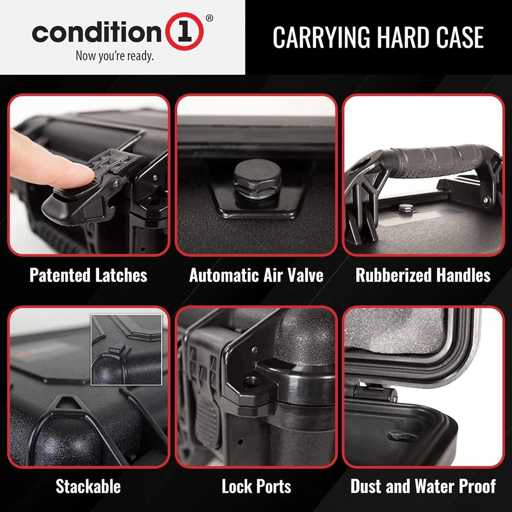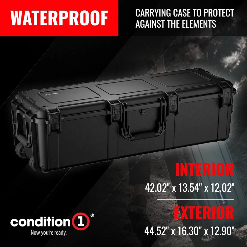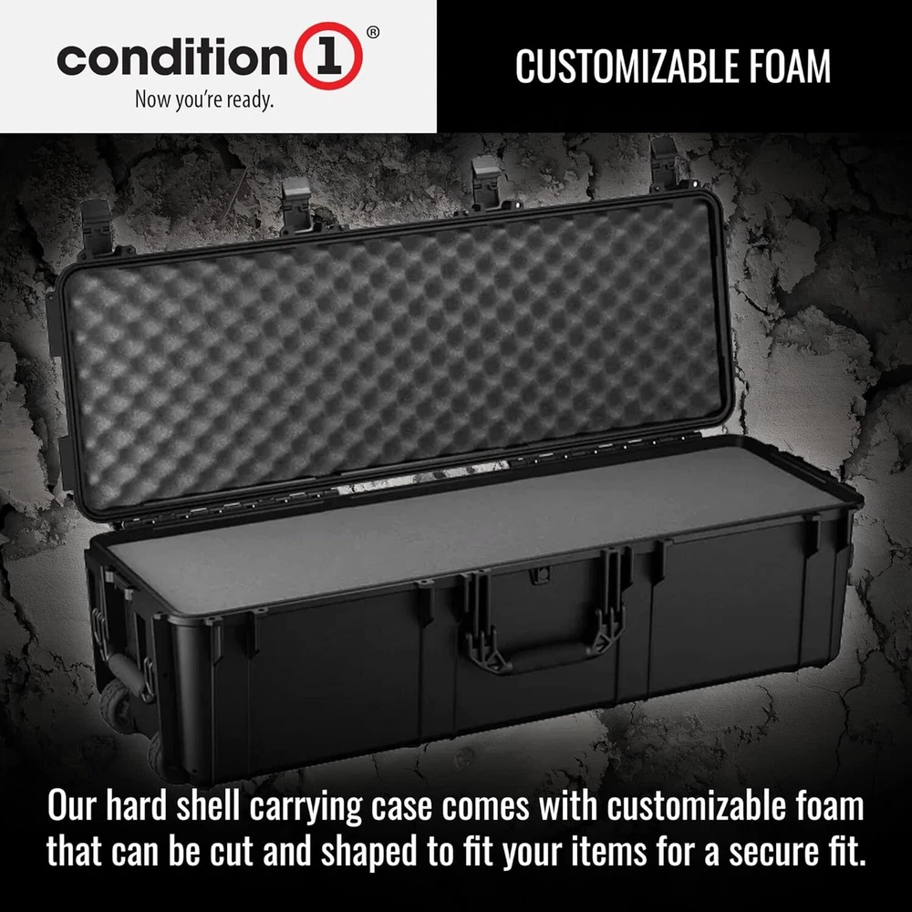 45" Long Hard Shell Carrying Case Model 2191 with Wheels, Waterproof, Protective, Storage for Music Equipment, Camera, Travel Case, Made in USA, 44.52"x16.30"x12.90" Black 45” LONG PORTABLE STORAGE CASE WITH WHEELS - 45” long black hard case with wheels, includes patented latches and rubberized handles for a comfortable grip. A lockable case for maximum security. WATERPROOF AND DUST PROOF CASE - This hard carrying case features an automatic air pressure release valve which makes the case airline friendly. An IP67 dust and waterproof hard case with a rubber gasket for an airtight seal. CUSTOMIZABLE FOAM - Our hard shell carrying case comes with customizable foam that can be cut and shaped to fit your items for a secure fit. The portable hard case is stackable and features steel pin hinges for added strength. OFF ROAD STYLE WHEELS - Condition 1 hard storage case is made in the USA from crush-resistant, virtually indestructible polypropylene copolymer with off road style wheels to reduce vibration. MULTIPLE USES - Use the hard travel case for electronics, as a scientific instrument case, video equipment case, camping storage case, military hard case, and more!