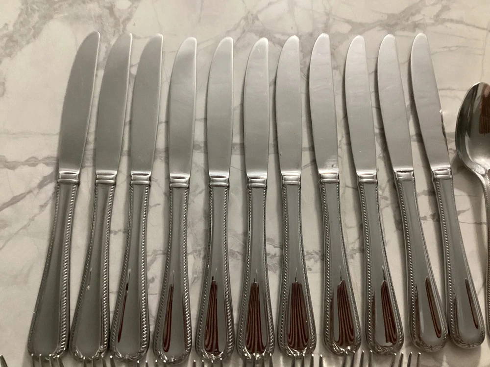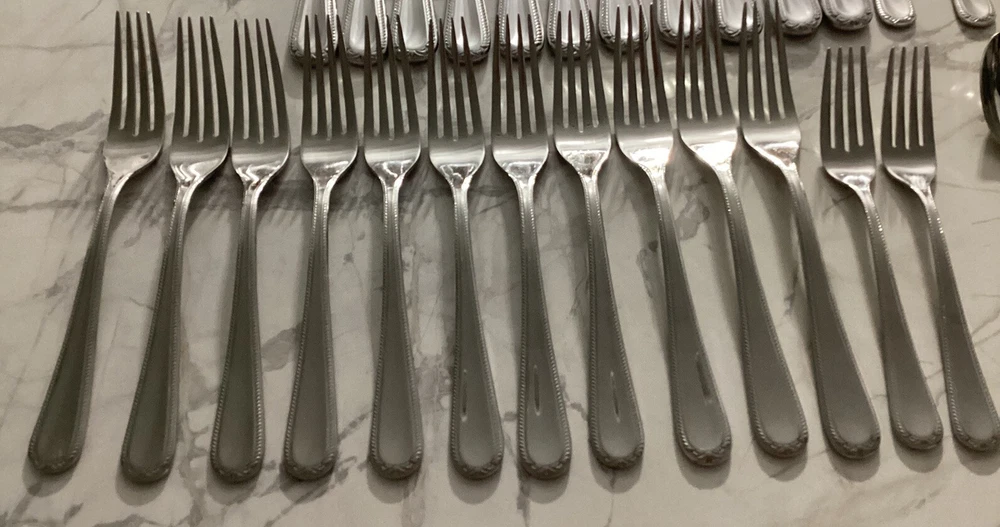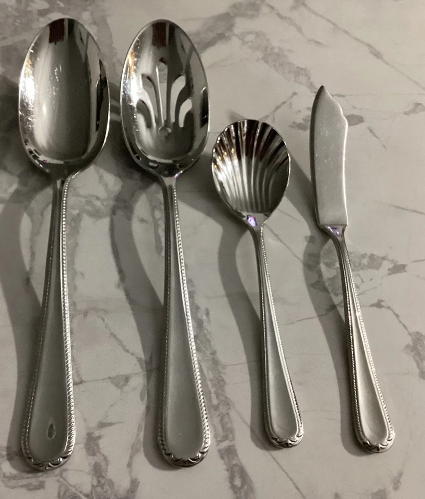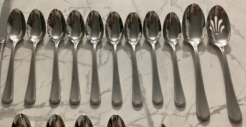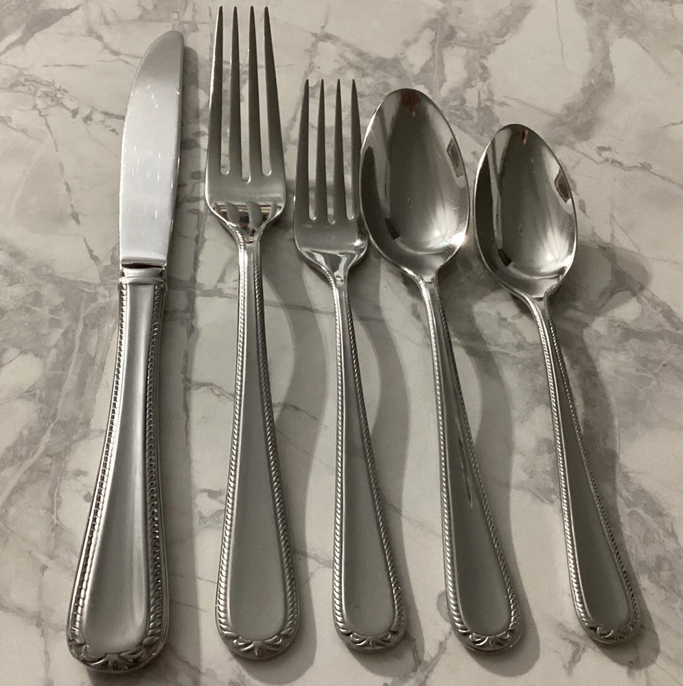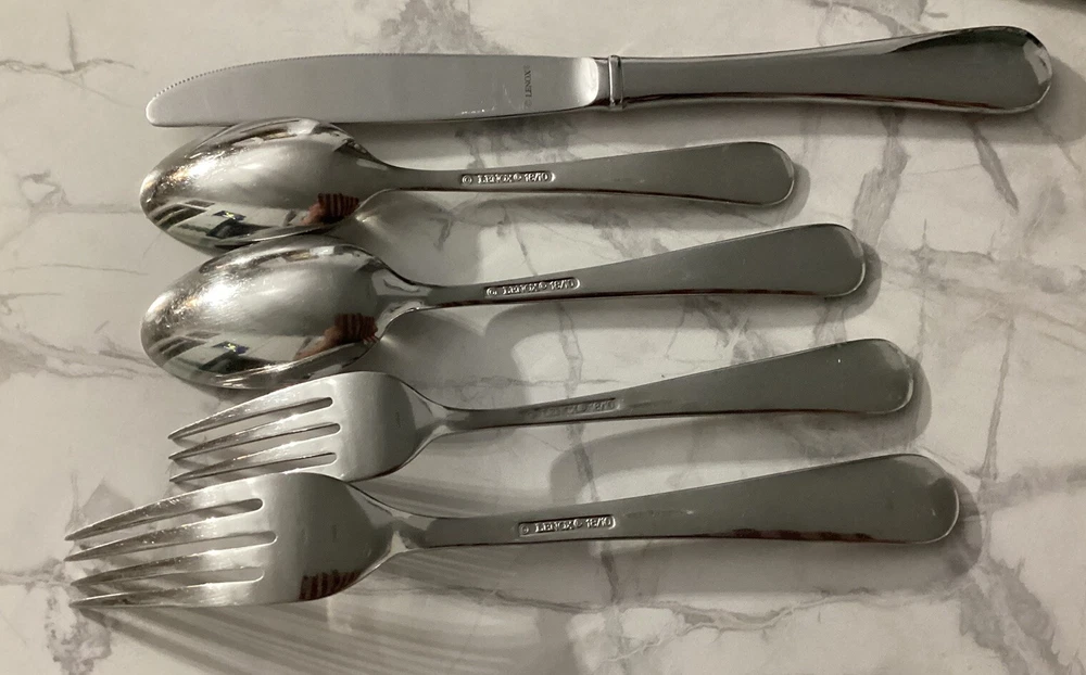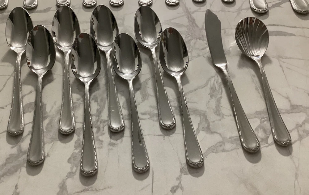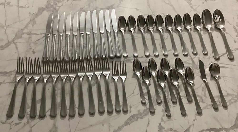 DISCONTINUED PATTERN PRE-OWNED - NOT NEW - SEE ALL PICTURES SWEDISH LODGE 18/10 STAINLESS FLATWARE BY LENOX NICE AND GLOSSY. Description: Stainless, 18/10, Glossy Pattern: Swedish Lodge Status: Discontinued. Actual: 2002 - 2008 45 PC. LOT: 11 dinner knives 11 dinner forks 2 salad forks 9 place/soup spoons 8 teaspoons 1 solid serving spoon 1 pierced serving spoon 1 sugar spoon 1 flat handle master butter knife Thanks for looking 👀