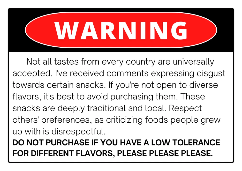 PLEASE READ BEFORE YOU PURCHASE Contains rotates weekly, pic is always for references only We change contains often to bring freshness for our customers! 🧡💛Free shipping across the USA with extra pieces included in every package. Over 3 years of experience selling on other platforms!🧡💛 🎊Explore a World of Snacks🎊 Delightful assortment of Asian treats that may include chocolates, cookies, chips, crackers, traditional Asian desserts, breads, and exotic candies. ✨Why Us? We offer the broadest selection on the platform due to regular trips to Asia. We shop three times a week to maintain freshness, ensuring our snacks rotate quickly. Each bag provides a unique mix for a varied experience, and of course, ALWAYS getting more pieces than what you bought ! 📌Important Details:📌 ❗ Manufacturing Dates: Some products may display manufacturing dates for freshness. ❗ Illustrative Purposes: Images shown are for illustration only. Actual products may vary due to our rotating stock. ❗Variety: Photos are examples of what may be included as some snacks in our rotation may change. ❗Size Variation: Please note that snack sizes vary. While some snacks are small yet premium (like many Japanese snacks), others may be larger. We focus on flavor and quality over size. ❗You will get a mix of sweet & savory snacks/ candies, if you have preference, please contact me! Also please note there will be repeat items. ❗❗You will receive snack samplers individually packed for freshness, not full packages of snacks. Our selection prioritizes flavor and quality over size. If you prefer large, budget-friendly snacks, we suggest exploring alternatives like cotton candy. 🎈🎇🎈🎇Seller's Note🎈🎇🎈🎇 Please respect diverse cultural foods; personal taste varies widely. Let's appreciate cultural diversity and understand that taste is subjective. Please avoid low ratings based solely on personal preference. My goal is to offer affordable opportunities for everyone to explore different cultures and foods. Again, please DO NOT purchase if you have low tolerance of different flavors and having trouble being respect to other cultures. No food is "nasty", people grew up and live with these foods, so please behave like a cultured and educated person, you don't like it doesn't mean it is nasty, other people like it. 🛑Shipping Disclaimer🛑 Please note that while we label all packages as fragile and hand-pick each item for quality, occasional mishandling by shipping carriers may result in damaged or open snacks. If you encounter any issues, please contact your local postal service for assistance. Feel free to reach out to us directly as well, and we'll work to find a solution for you CLICK ME FOR MORE BUNDLES Disclaimer Product packaging, specifications, and prices are subject to change without notice. All information about the products is provided for information purposes only. Please always read labels, warnings, and directions provided with the product before use. Shipping We will ship all orders within 2 business days of payment, we provide free upgrade USPS shipping service up to 2-DAY Priority if Urgent Contact We can be contacted at any time through eBay messages if you have any questions, comments or product requests. We will respond to you within 24 hours and do our best to help you out! Further details CONTAINS MILK, SOY, WHEAT, CASHEW. MAY CONTAIN TRACES OF EGG, PEANUT, ALMOND. PLEASE DO NOT PURCHASE IF YOU HAVE ANY FOOD ALLERGY
