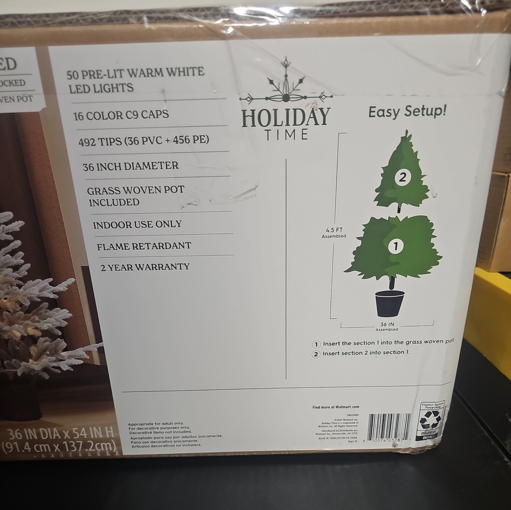 The 4.5 foot Artificial Christmas Tree Pre-lit Charlie Flocked Glow Tree that includes a Christmas tree,. This modern style tree features a green and white color scheme, with realistic winter forest features. It is designed for indoor use and requires assembly. The tree weighs 11.3 lbs and is from the brand Holiday Time, known for its quality holiday decor. Perfect for adding a festive touch to your home during the Christmas season. T10