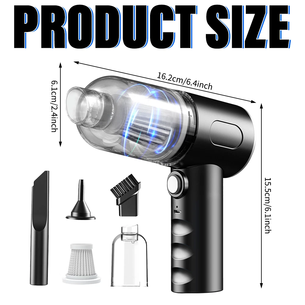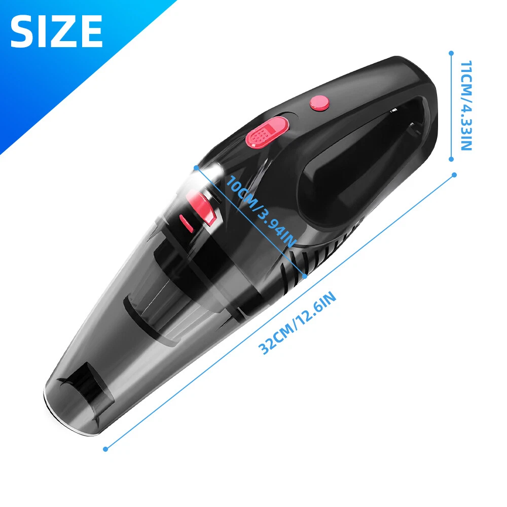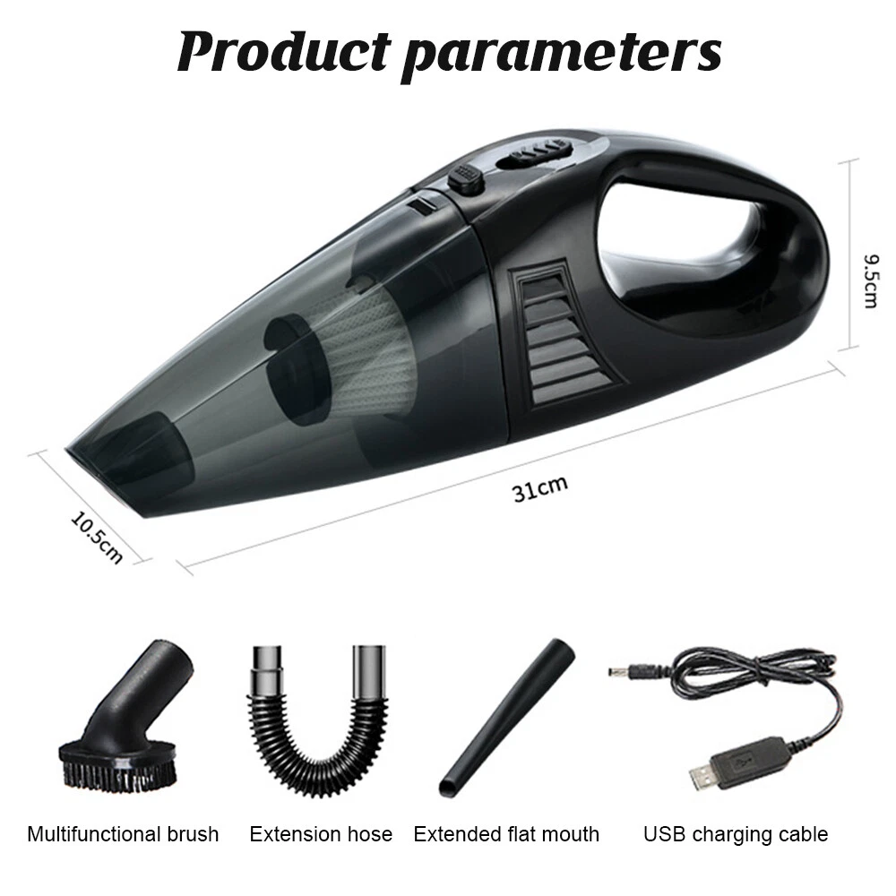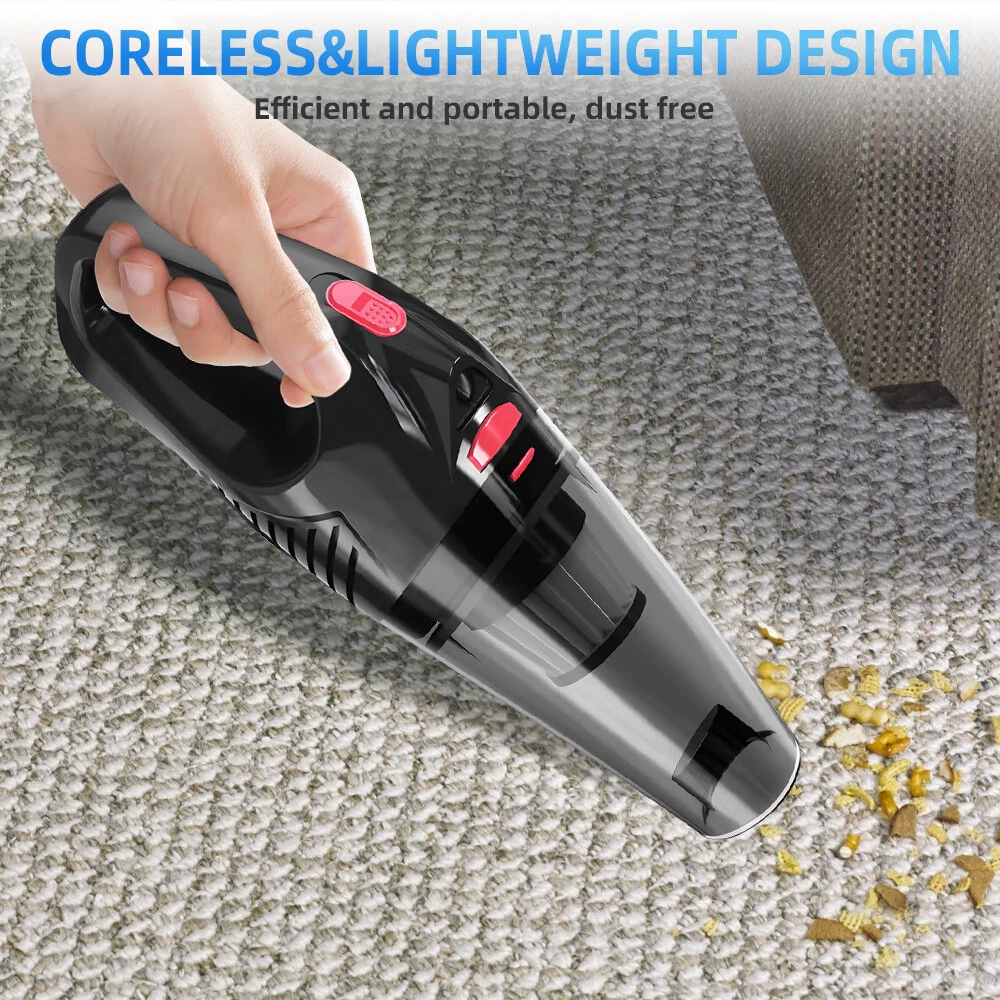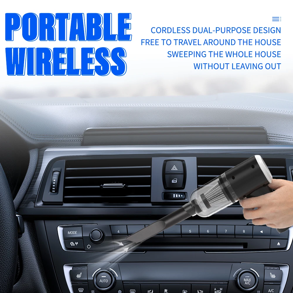 A:120W 4000mAh With LED Vacuum Cleaner Fe ature : 【5500PA POWERFUL SUCTION VACUUM CLEA NER】 : This super powerful handheld vacuum is equipped with a high-speed brushless motor with a steady output of 120W, this handheld hoover has a suction power of up to 5500PA, which easily removes pet hair, dust, crumbs, and confetti from your home, car, and office. 【2 IN 1 SUCTIONS HEAD HANDHELD VACUUM】 :This mini hoover of ours comes with a crevice nozzle, an extended hose and a cleaning brush, . The crevice nozzle effectively removes dust and dirt from narrow crevices and tight spaces. The brush nozzle is designed to remove hair from carpets, sofas or dust from keyboards. And with a long hose with connector can be extended for flexible cleaning of hard-to-reach places, ensuring that every corner is thoroughly cleaned. 【LONG LASTING & FAST CHARGING】 :This large capacity car hoover uses large capacity rechargeable lithium batteries, single battery capacity of 2000 mah, dual capacity of 4000mah, more durable, full charge can last 20-30 minutes, and with fast charging technology, full charge in just 3-4 hours 【Efficient Filtration System】 The handheld vacuum cordless cleaner provides one mini brush and two washable HEPA filters to extend the product's lifespan.(Note:Cleaned filters must be well dried before re-installation) 【Compact and Portable】 The portable car vacuum cleaner is designed to be lightweight, weighing only 1.15lbs, and can be operated with one hand.It is compatible with all cars, trucks, vans and SUVs. 【Ideal for Travel Essentials】 Car vacuum makes you clean the interior of your car anytime,which gives you a nice and comfortable experience on long trips. Specifi cation : Material: ABS Battery: built-in 2000 * 2 mAh lithium battery Power:120W Charging: DC port charging Speed:39000-45000rpm Features: wireless, small size portable, can suck can blow Rated power: 12 0W Rated frequency: 65w (HZ) Rated voltage:≤36V(V) Suction power: 55 00Pa Packag e list: Nozzle*5 Charging Cable*1 H ost *1 English manual *1 Filter *2 Cleaning Brush*1 Storage bag *1 =========================================== B:120W 2200mAh Vacuum Cleaner Details: Power Mode: USB Charging Operating Voltage: 100V-240V rated power:120W Included Components: Accessory Kit Body Material: Plastic Filter Type: Cartridge special nozzle type: Flat-billed bird Dust cup volume: <0.1L Battery Properties: Rechargeable Battery Package content: 1x 120W Car Vacuum Cleaner with 3.28ft Power Cord. 1x Brush Mouth. 1x Long Mouth. 1x Soft Long Tube. 1x User Manual. ====================================== C:120W 3000mAh Vacuum Cleaner Features: 6000Pa strong suction power, with rotating speed up to 39 000rpm. Dry wet amphibious & Strong suction. Easy to vacuum dust, debris, hair, liquid, paper... etc. D ifferent vacuum nozzles to work on any desired area. Portable, light-weight, easy to store and carry. USB charging, convenient and fast. Specifications: [product name]: hand held vehicle vacuum cleaner [product color]: black Vacuum degree: about 6 000kpa Rated power: 120W Product noise: less than 70db Rated voltage: 7.4V Product battery: built -in 1500 mAh*2 lithium battery Rating speed: 39000 (R/min) Packa ge Included: 1 x Cleaner 1 x Brush nozzle 1 x extension hose 1 brush head 1 x User Manual ============================================ D:120W 1200mAh Vacuum Cleaner S pecificatio ns : Material:ABS Battery: Built-i n 1200 mAh lithium battery Power:120W Charging: Type-C intelligent direct charging Relevant export certificates: fcc, ce Product Rotation: 39000-45000 rpm Rated power: 60W Rated frequency: 65w (HZ) Rated voltage: ≤ 36V (V) Product suction power: 5500Pa Advantageous features: wireless, small size portable, can suck can blow. Main scope of application: small cars vans SUVs SUVs homes offices dormitories, etc. Package included: 1 X long flat nozzle 1 X brush nozzle 1 X charging cable 1 X tail nozzle 1 X host 1 X English manual 1 X filter