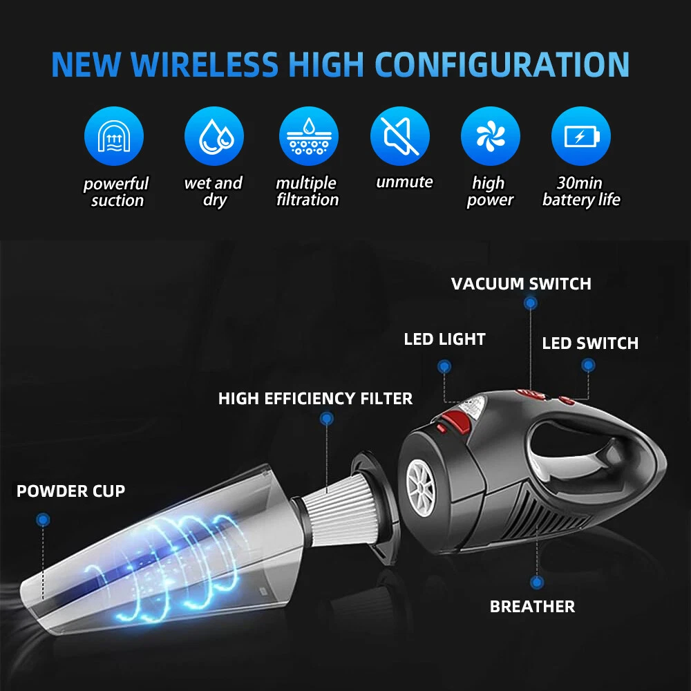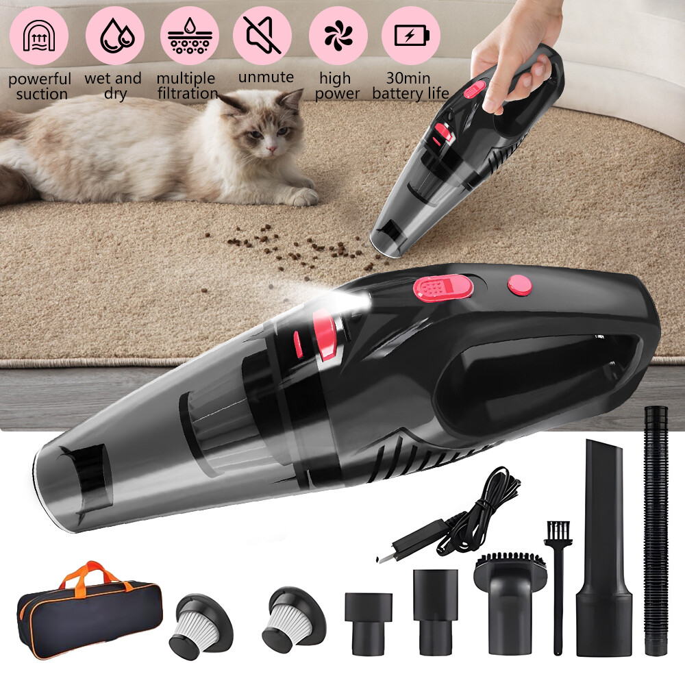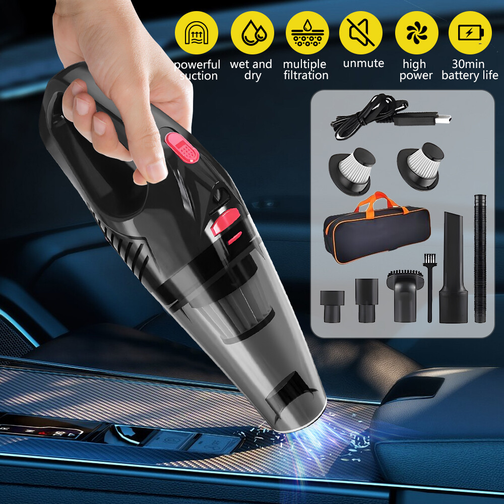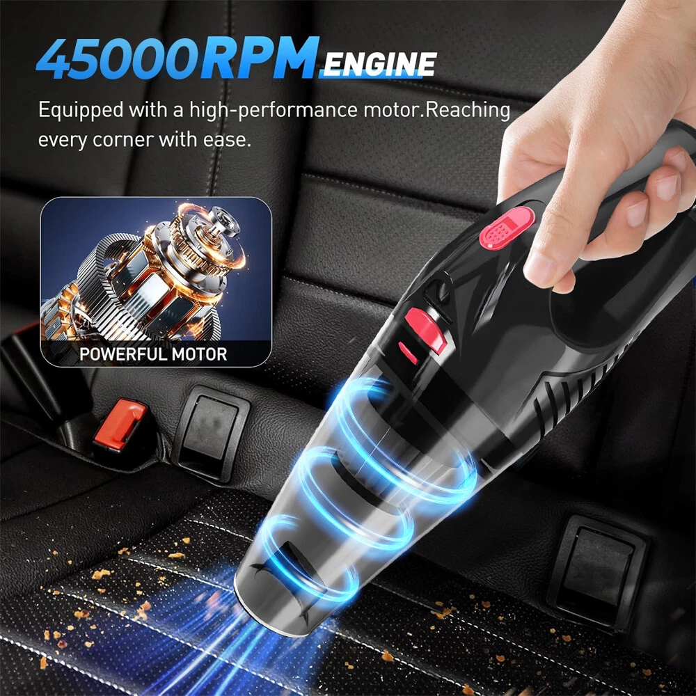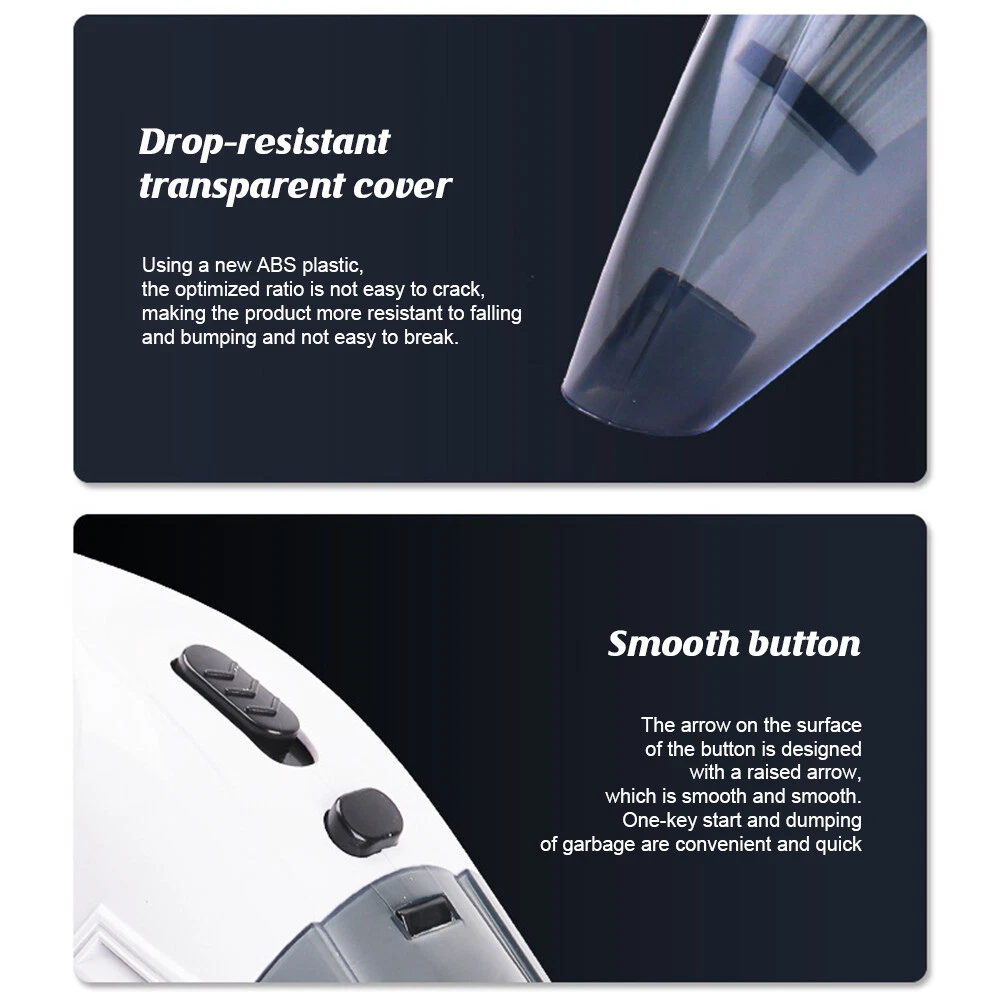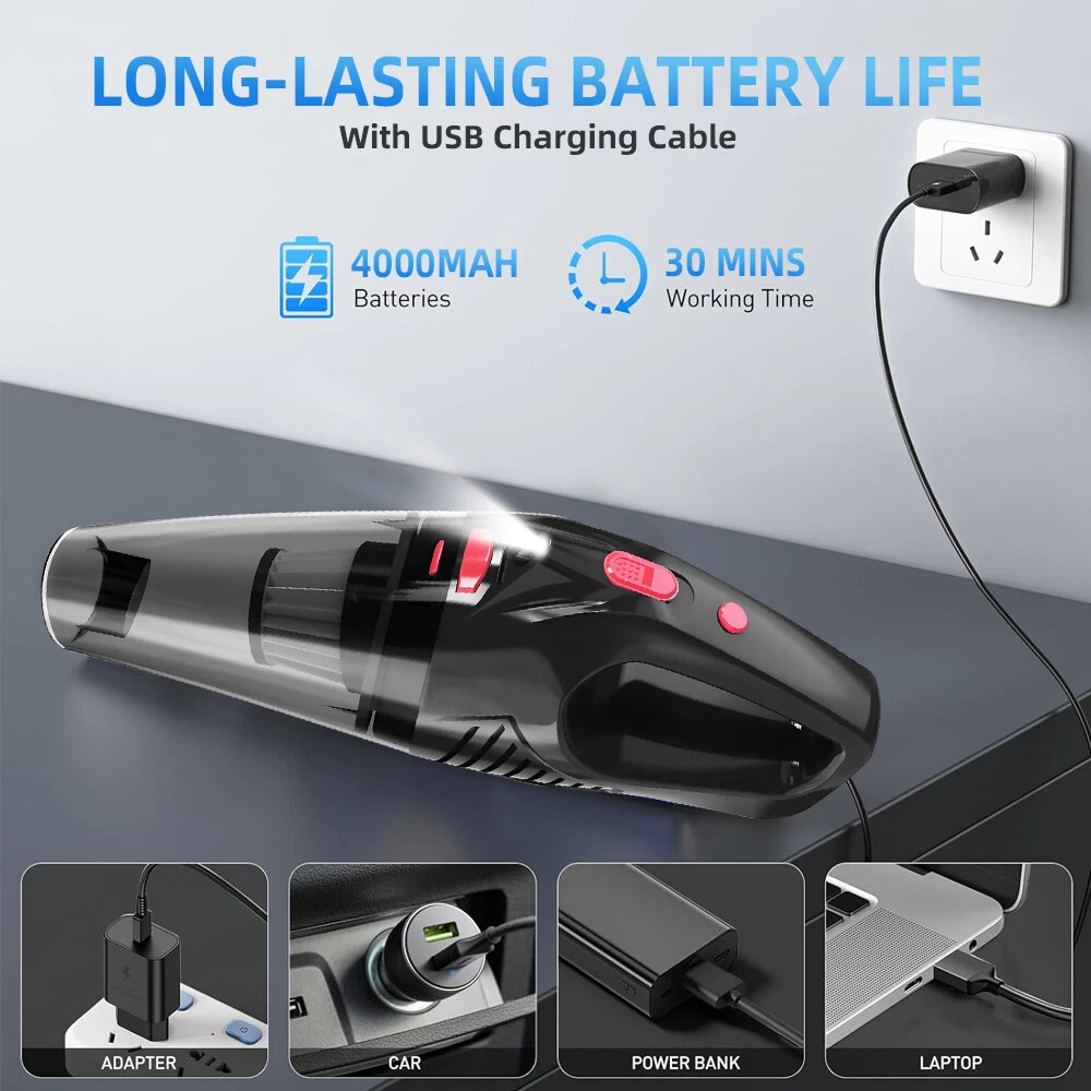 A:120W 4000mAh With LED Vacuum Cleaner Fe ature : 【5500PA POWERFUL SUCTION VACUUM CLEA NER】 : This super powerful handheld vacuum is equipped with a high-speed brushless motor with a steady output of 120W, this handheld hoover has a suction power of up to 5500PA, which easily removes pet hair, dust, crumbs, and confetti from your home, car, and office. 【2 IN 1 SUCTIONS HEAD HANDHELD VACUUM】 :This mini hoover of ours comes with a crevice nozzle, an extended hose and a cleaning brush, . The crevice nozzle effectively removes dust and dirt from narrow crevices and tight spaces. The brush nozzle is designed to remove hair from carpets, sofas or dust from keyboards. And with a long hose with connector can be extended for flexible cleaning of hard-to-reach places, ensuring that every corner is thoroughly cleaned. 【LONG LASTING & FAST CHARGING】 :This large capacity car hoover uses large capacity rechargeable lithium batteries, single battery capacity of 2000 mah, dual capacity of 4000mah, more durable, full charge can last 20-30 minutes, and with fast charging technology, full charge in just 3-4 hours 【Efficient Filtration System】 The handheld vacuum cordless cleaner provides one mini brush and two washable HEPA filters to extend the product's lifespan.(Note:Cleaned filters must be well dried before re-installation) 【Compact and Portable】 The portable car vacuum cleaner is designed to be lightweight, weighing only 1.15lbs, and can be operated with one hand.It is compatible with all cars, trucks, vans and SUVs. 【Ideal for Travel Essentials】 Car vacuum makes you clean the interior of your car anytime,which gives you a nice and comfortable experience on long trips. Specifi cation : Material: ABS Battery: built-in 2000 * 2 mAh lithium battery Power:120W Charging: DC port charging Speed:39000-45000rpm Features: wireless, small size portable, can suck can blow Rated power: 12 0W Rated frequency: 65w (HZ) Rated voltage:≤36V(V) Suction power: 55 00Pa Packag e list: Nozzle*5 Charging Cable*1 H ost *1 English manual *1 Filter *2 Cleaning Brush*1 Storage bag *1 =========================================== B:120W 2200mAh Vacuum Cleaner Details: Power Mode: USB Charging Operating Voltage: 100V-240V rated power:120W Included Components: Accessory Kit Body Material: Plastic Filter Type: Cartridge special nozzle type: Flat-billed bird Dust cup volume: <0.1L Battery Properties: Rechargeable Battery Package content: 1x 120W Car Vacuum Cleaner with 3.28ft Power Cord. 1x Brush Mouth. 1x Long Mouth. 1x Soft Long Tube. 1x User Manual. ====================================== C:120W 3000mAh Vacuum Cleaner Features: 6000Pa strong suction power, with rotating speed up to 39 000rpm. Dry wet amphibious & Strong suction. Easy to vacuum dust, debris, hair, liquid, paper... etc. D ifferent vacuum nozzles to work on any desired area. Portable, light-weight, easy to store and carry. USB charging, convenient and fast. Specifications: [product name]: hand held vehicle vacuum cleaner [product color]: black Vacuum degree: about 6 000kpa Rated power: 120W Product noise: less than 70db Rated voltage: 7.4V Product battery: built -in 1500 mAh*2 lithium battery Rating speed: 39000 (R/min) Packa ge Included: 1 x Cleaner 1 x Brush nozzle 1 x extension hose 1 brush head 1 x User Manual ============================================ D:120W 1200mAh Vacuum Cleaner S pecificatio ns : Material:ABS Battery: Built-i n 1200 mAh lithium battery Power:120W Charging: Type-C intelligent direct charging Relevant export certificates: fcc, ce Product Rotation: 39000-45000 rpm Rated power: 60W Rated frequency: 65w (HZ) Rated voltage: ≤ 36V (V) Product suction power: 5500Pa Advantageous features: wireless, small size portable, can suck can blow. Main scope of application: small cars vans SUVs SUVs homes offices dormitories, etc. Package included: 1 X long flat nozzle 1 X brush nozzle 1 X charging cable 1 X tail nozzle 1 X host 1 X English manual 1 X filter